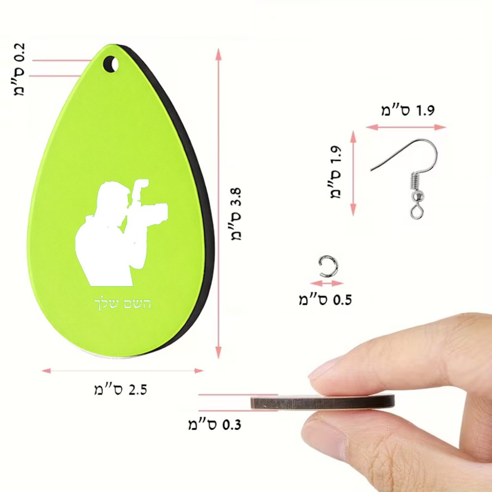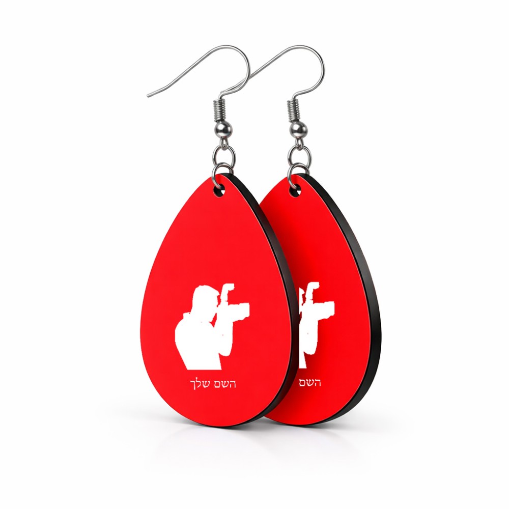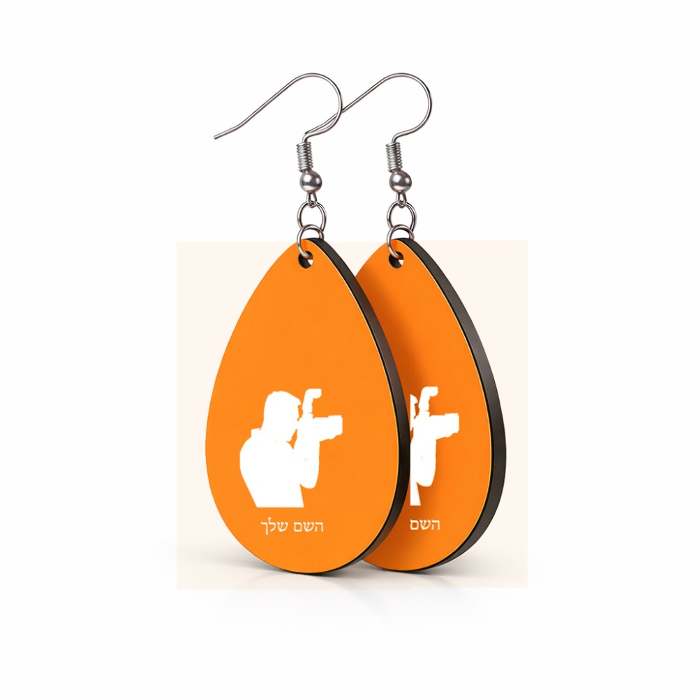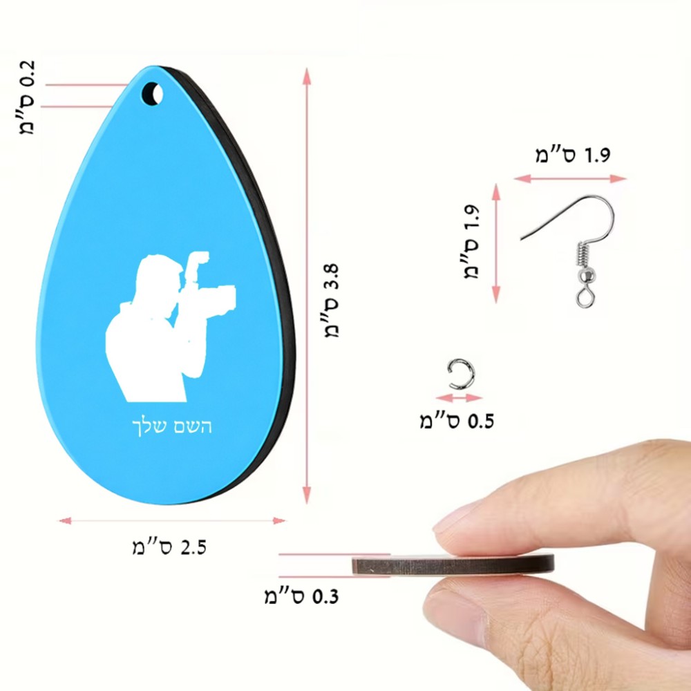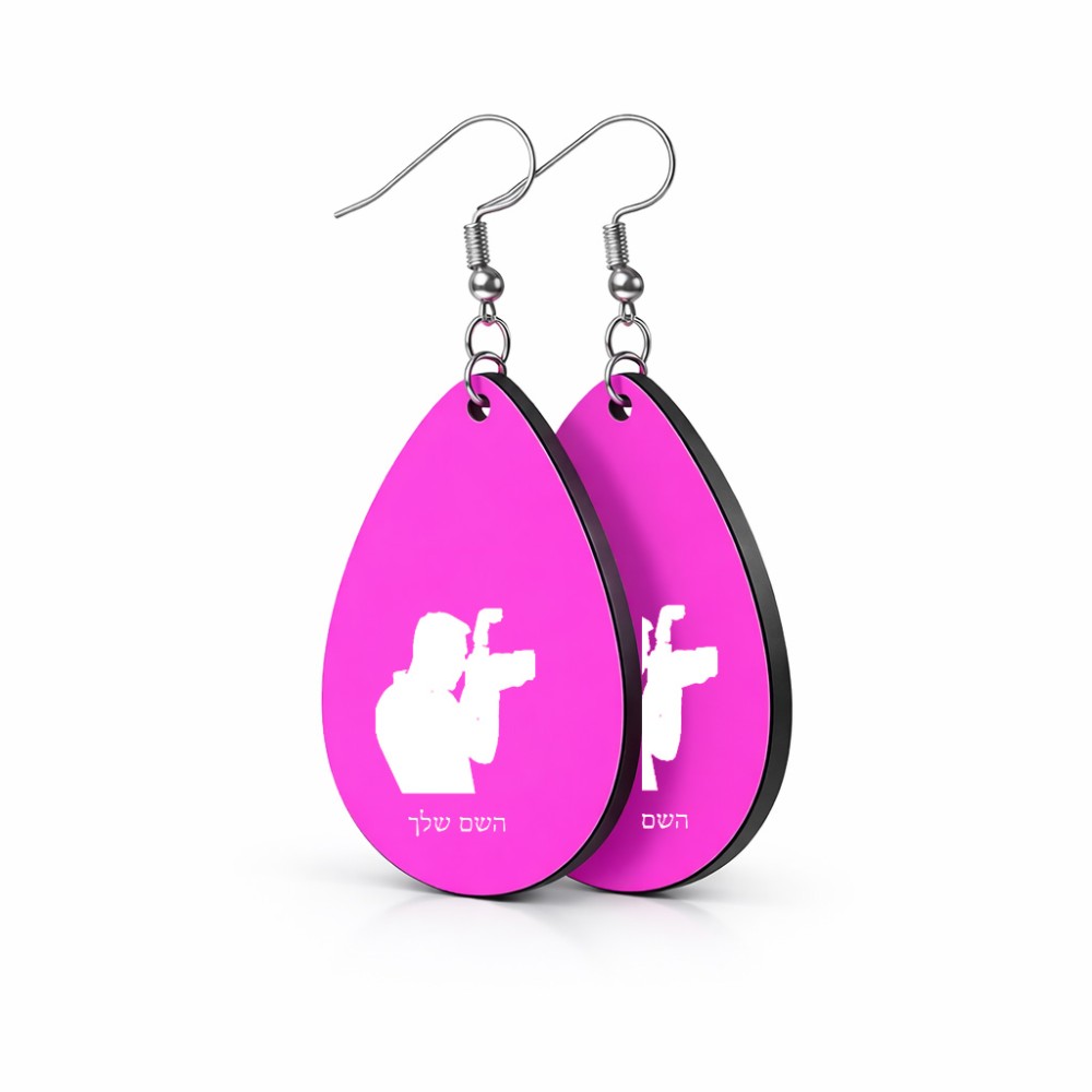 זוג עגילים בצורת טיפה בעיצוב אישי עם השם שלך בעיצוב צלם - גברים גודל העגילים 2.5 × 3.8 ס"מ. את השם המבוקש ניתן לציין בהזמנה, אם לא צויין אנחנו ניצור קשר לבירור.