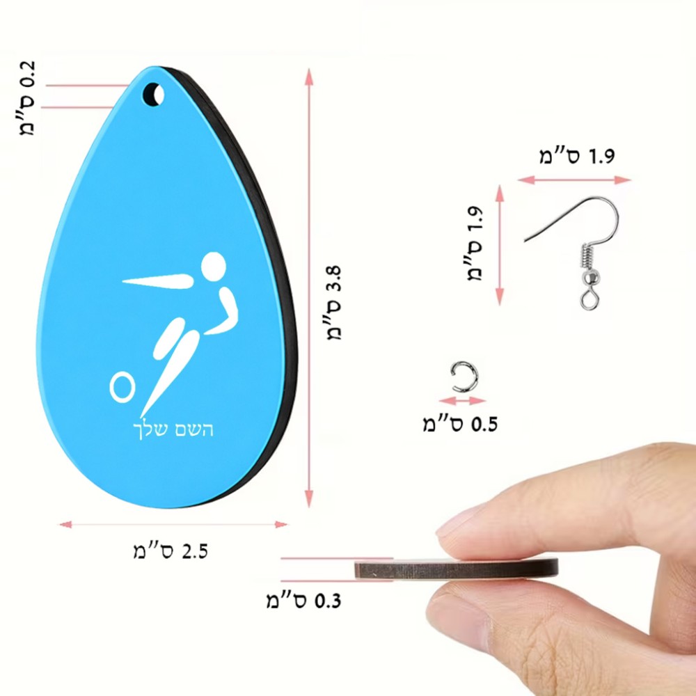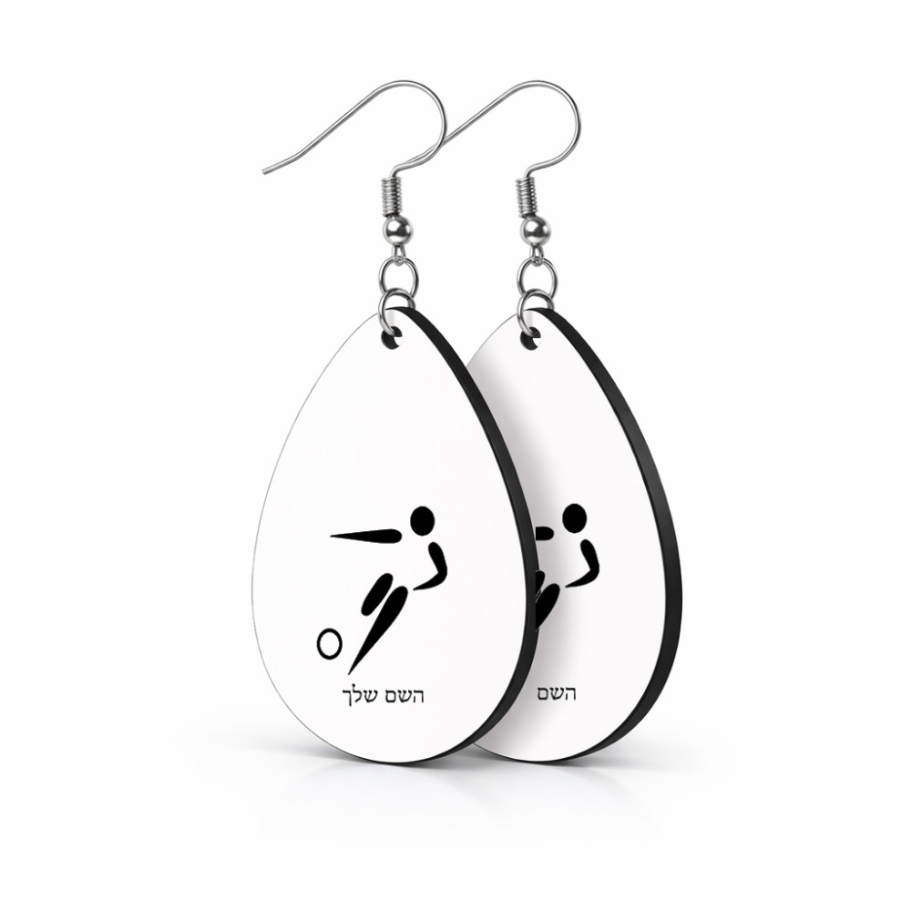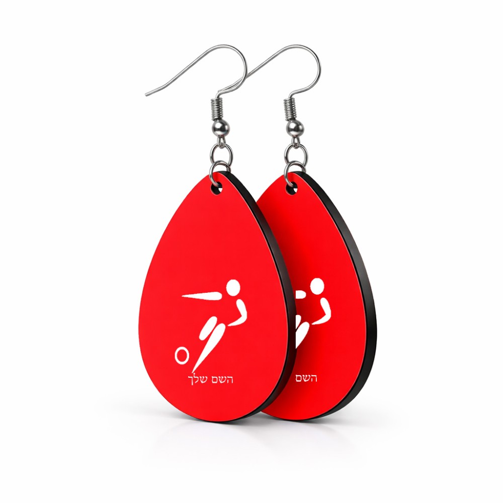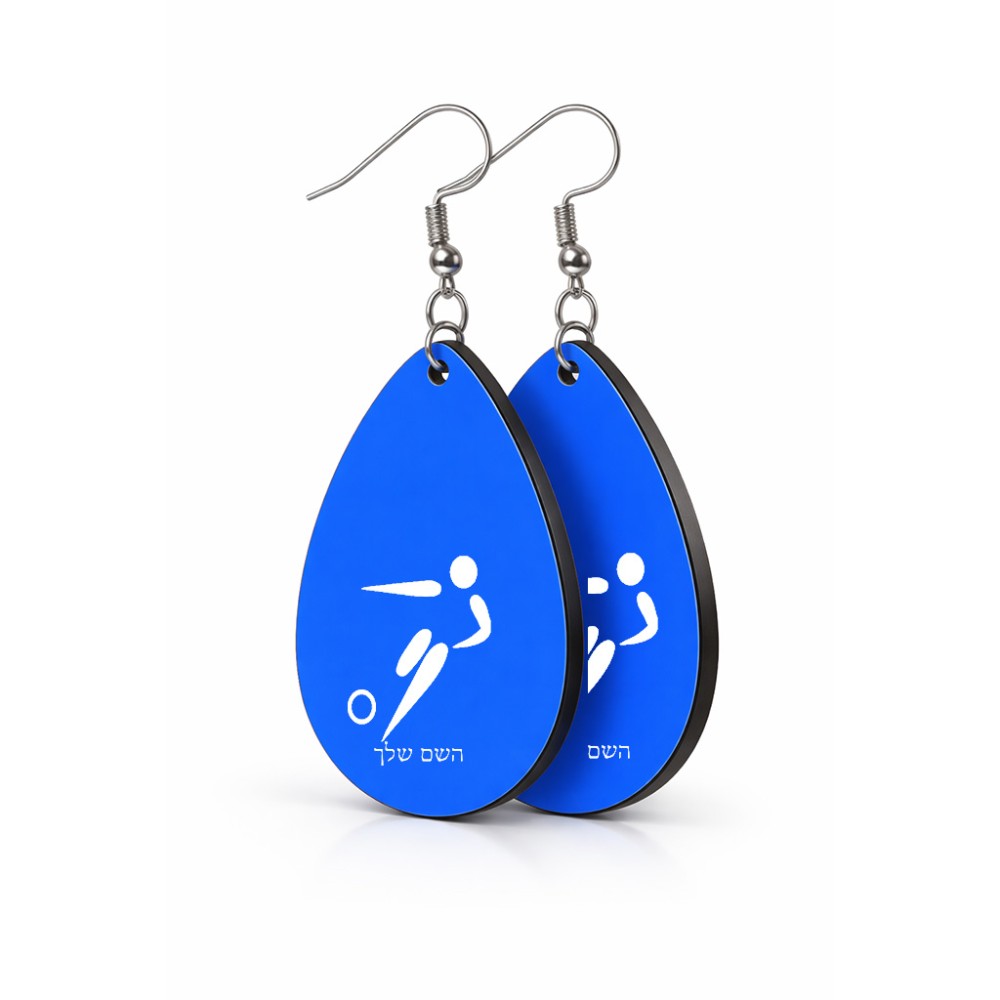 זוג עגילים בצורת טיפה בעיצוב אישי עם השם שלך בעיצוב כדורגל אולימפי גודל העגילים 2.5 × 3.8 ס"מ. את השם המבוקש ניתן לציין בהזמנה, אם לא צויין אנחנו ניצור קשר לבירור.