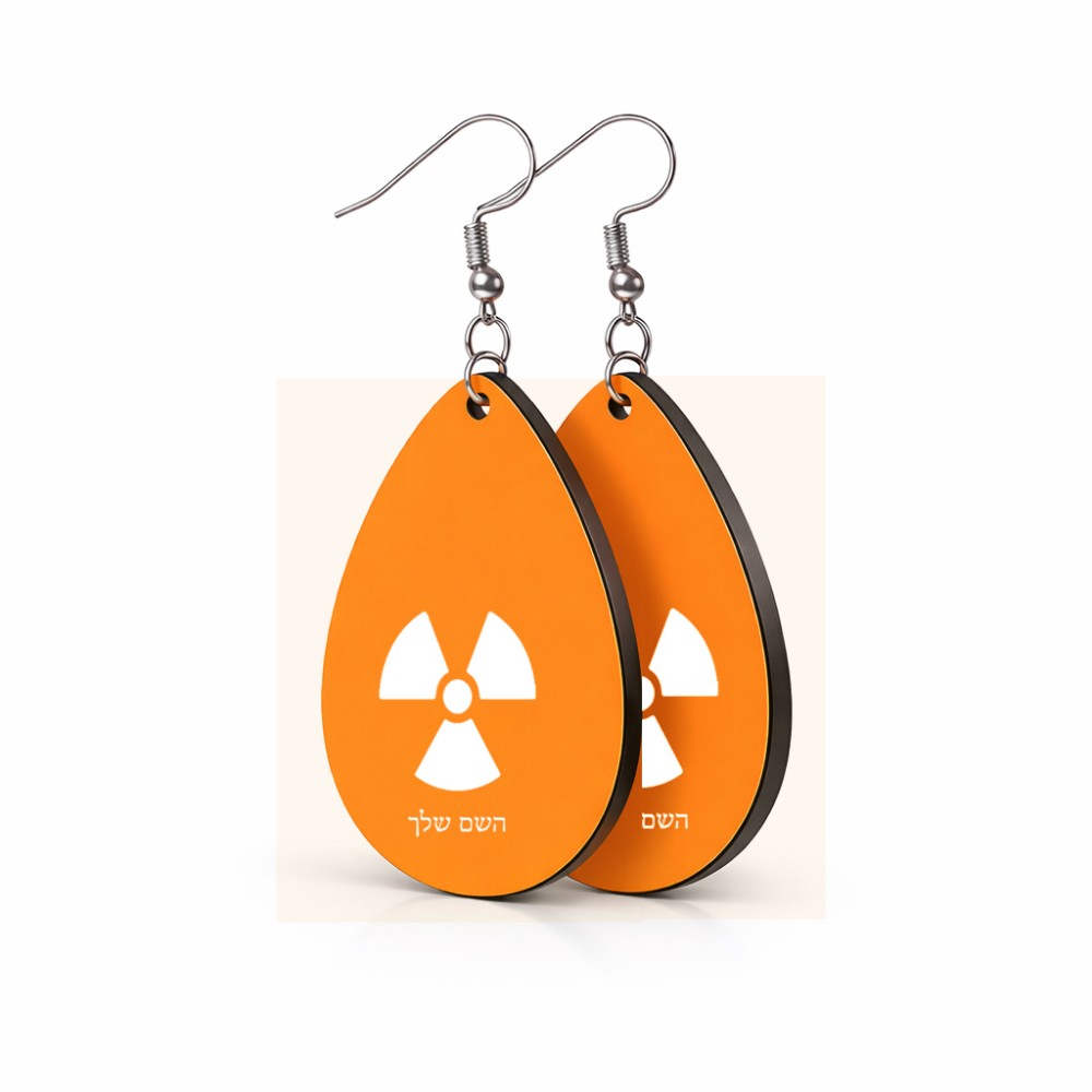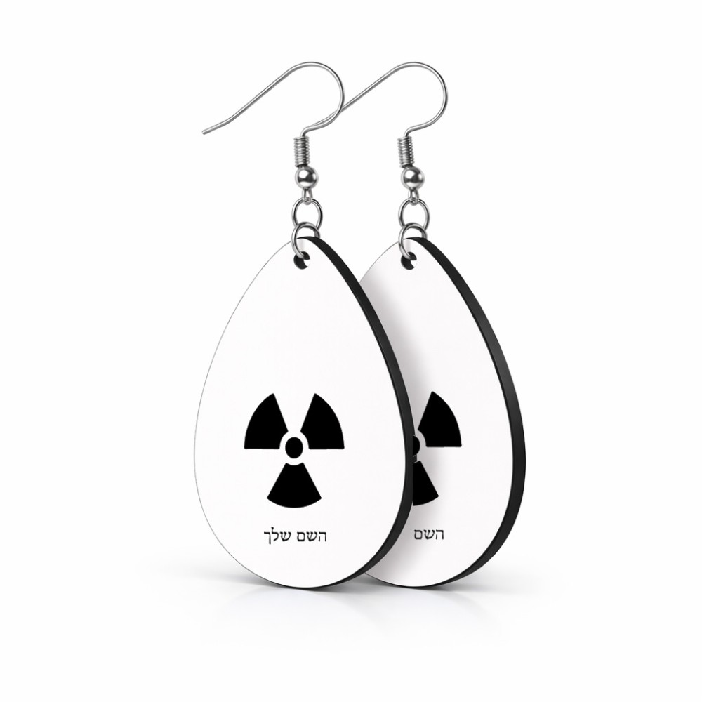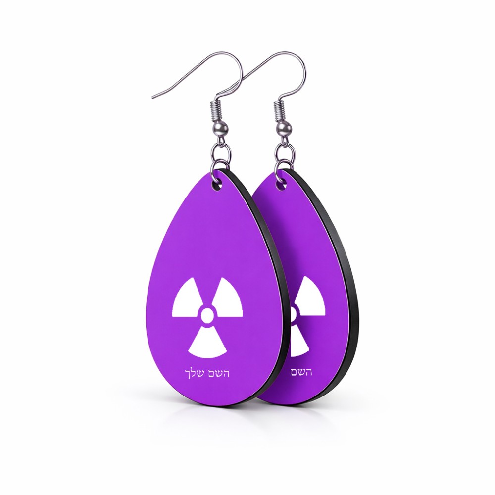 זוג עגילים בצורת טיפה בעיצוב אישי עם השם שלך בעיצוב פצצת אטום גרעינית גודל העגילים 2.5 × 3.8 ס"מ. את השם המבוקש ניתן לציין בהזמנה, אם לא צויין אנחנו ניצור קשר לבירור.