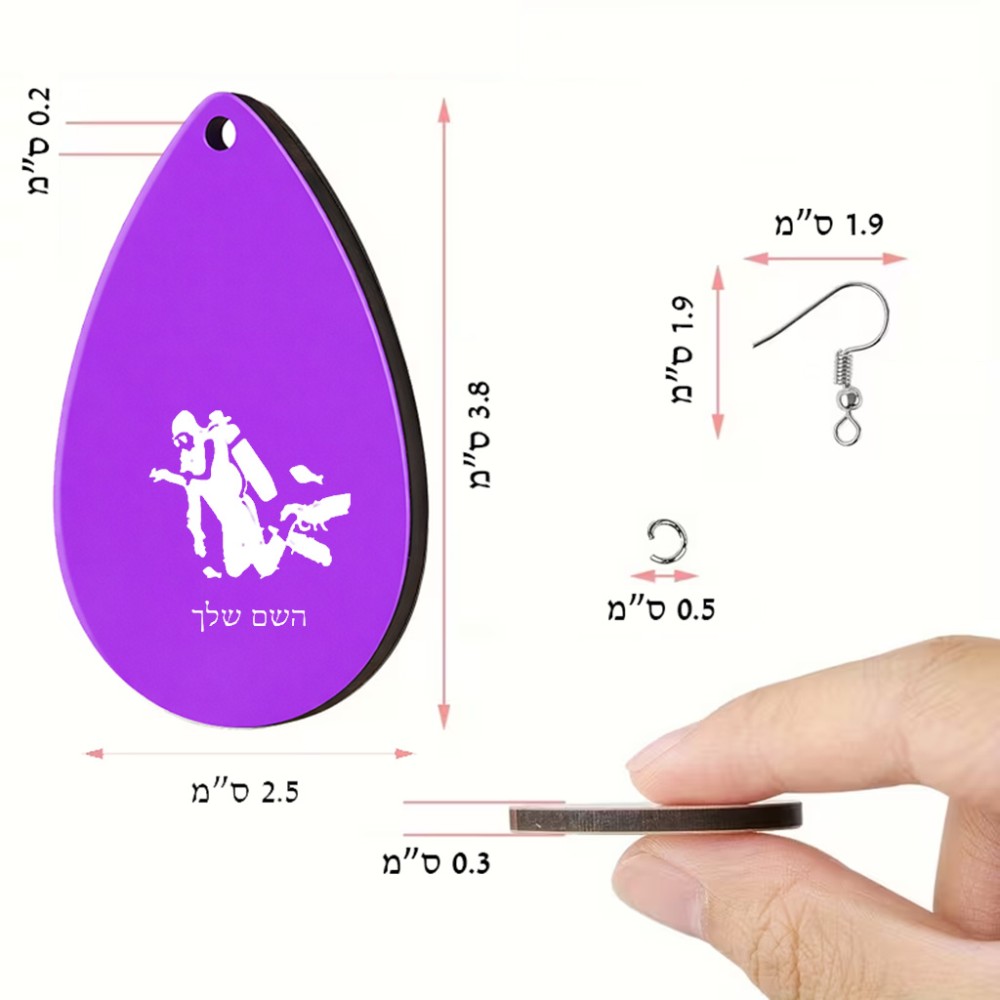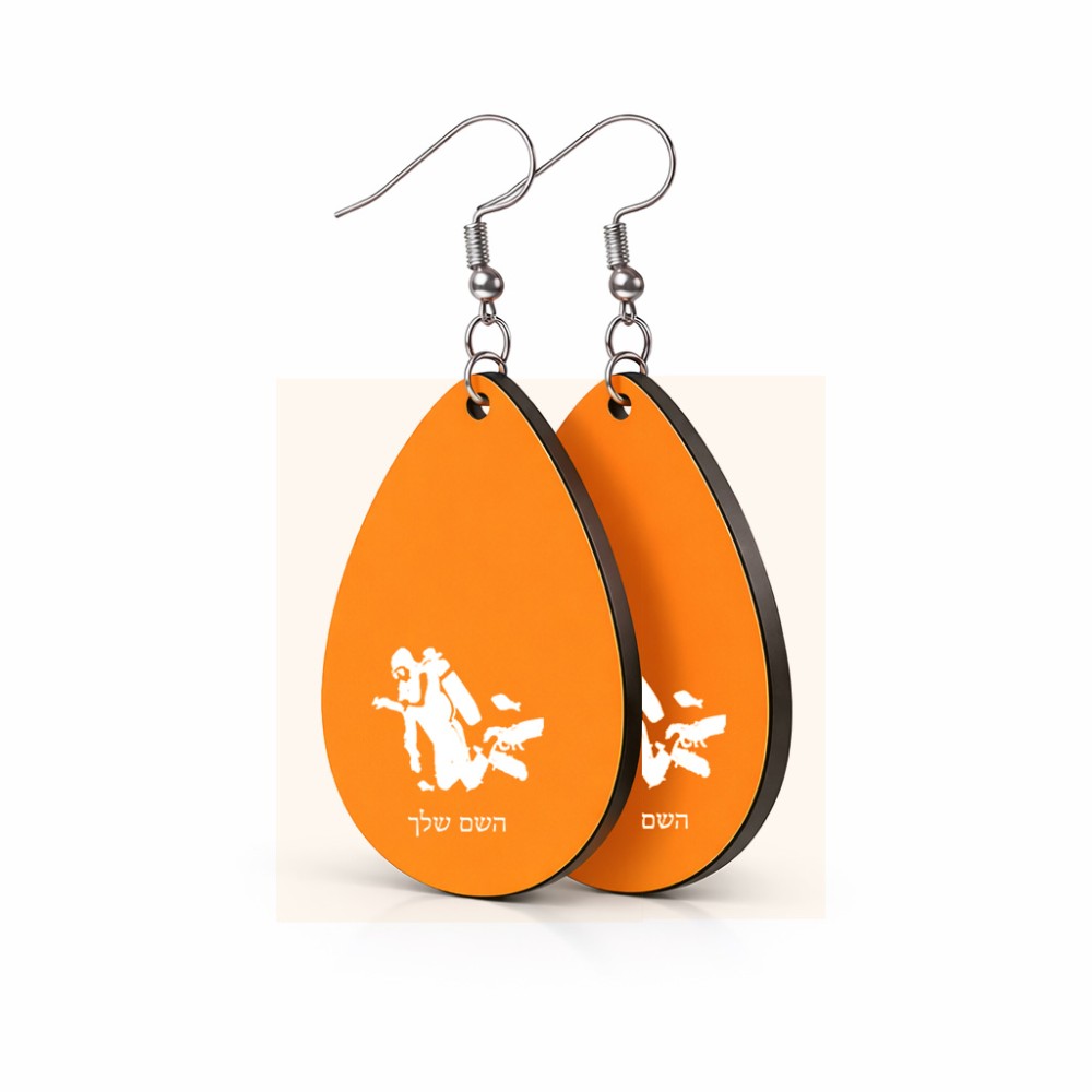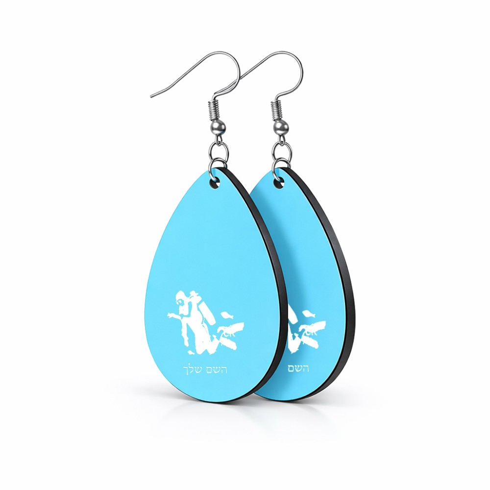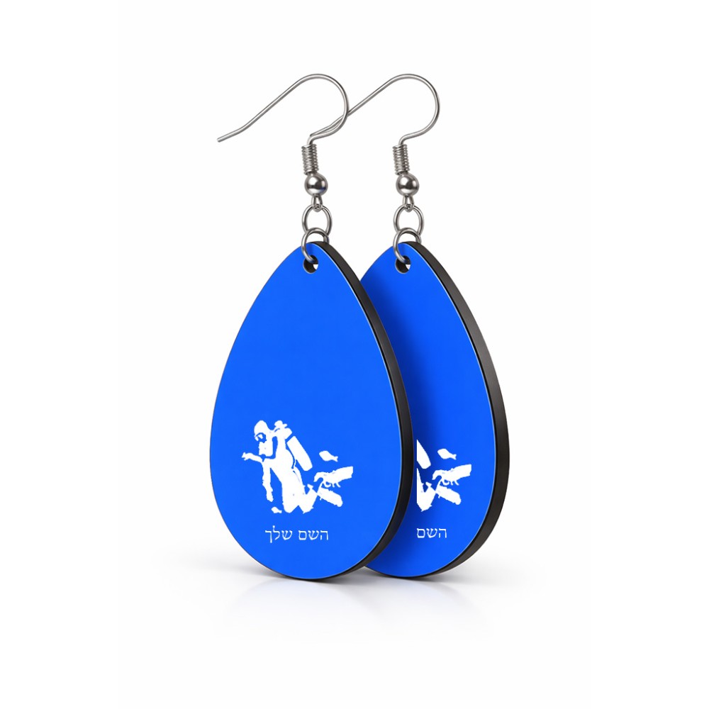 זוג עגילים בצורת טיפה בעיצוב אישי עם השם שלך בעיצוב צוללן גודל העגילים 2.5 × 3.8 ס"מ. את השם המבוקש ניתן לציין בהזמנה, אם לא צויין אנחנו ניצור קשר לבירור.
