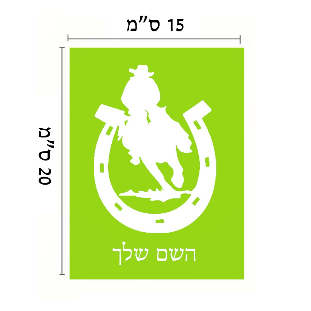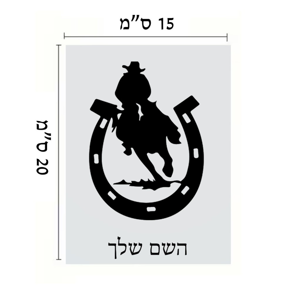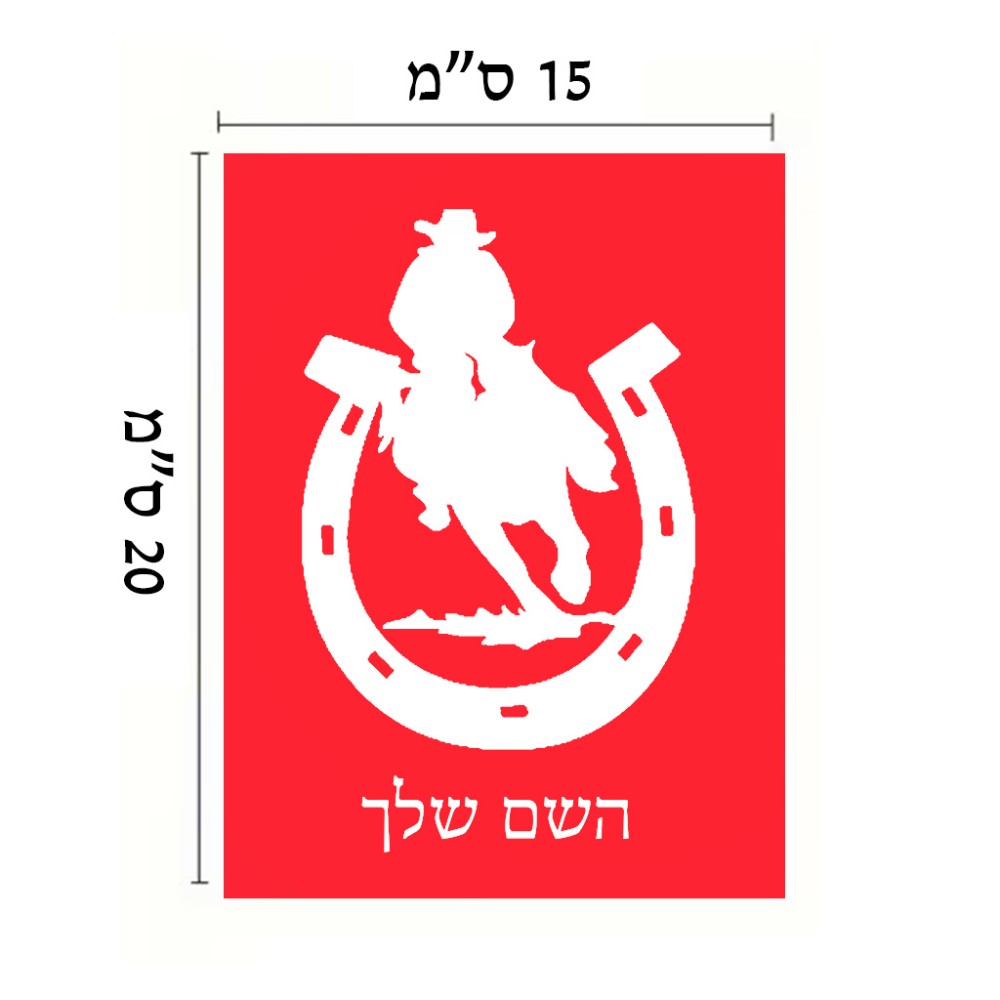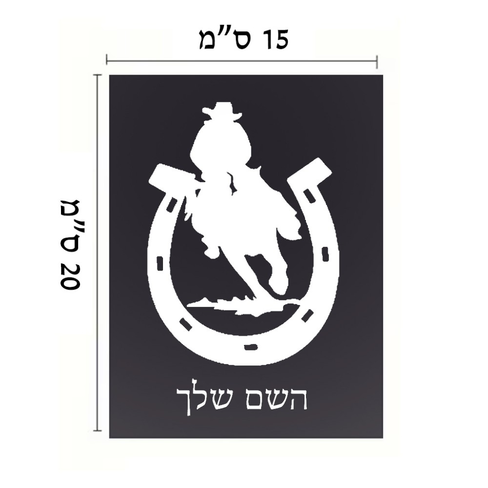 שלט אלומיניום קטן לחדר בעיצוב אישי עם השם שלך בעיצוב פרסה וסוס גודל השלט 15 × 20 ס"מ. את השם המבוקש ניתן לציין בהזמנה, אם לא צויין אנחנו ניצור קשר לבירור.