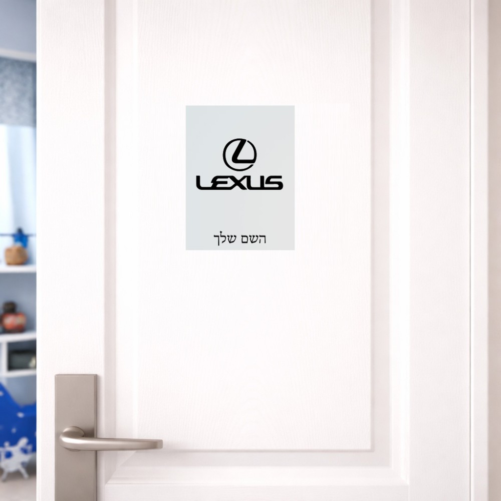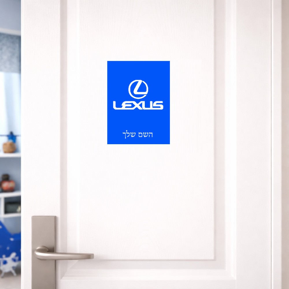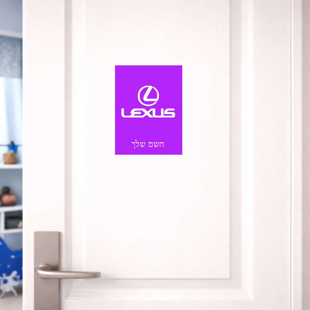שלט אלומיניום קטן לחדר בעיצוב אישי עם השם שלך בעיצוב לקסוס גודל השלט 15 × 20 ס"מ. את השם המבוקש ניתן לציין בהזמנה, אם לא צויין אנחנו ניצור קשר לבירור.