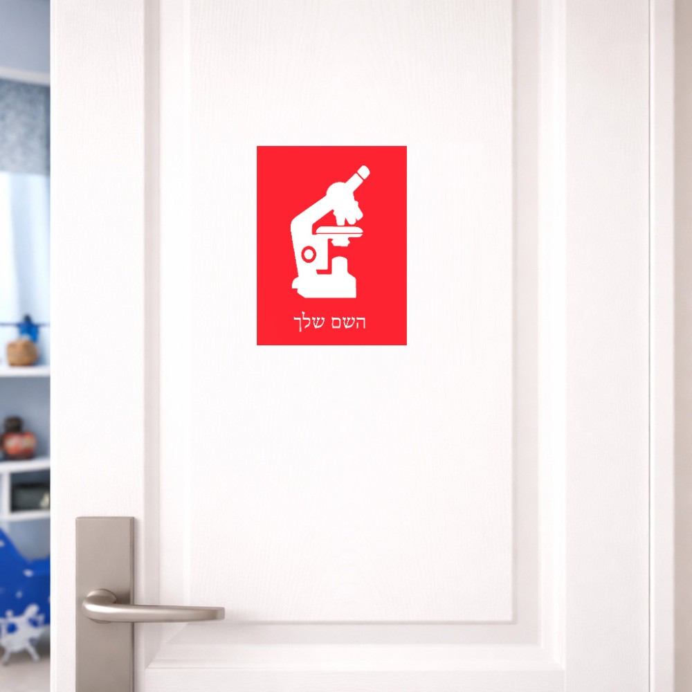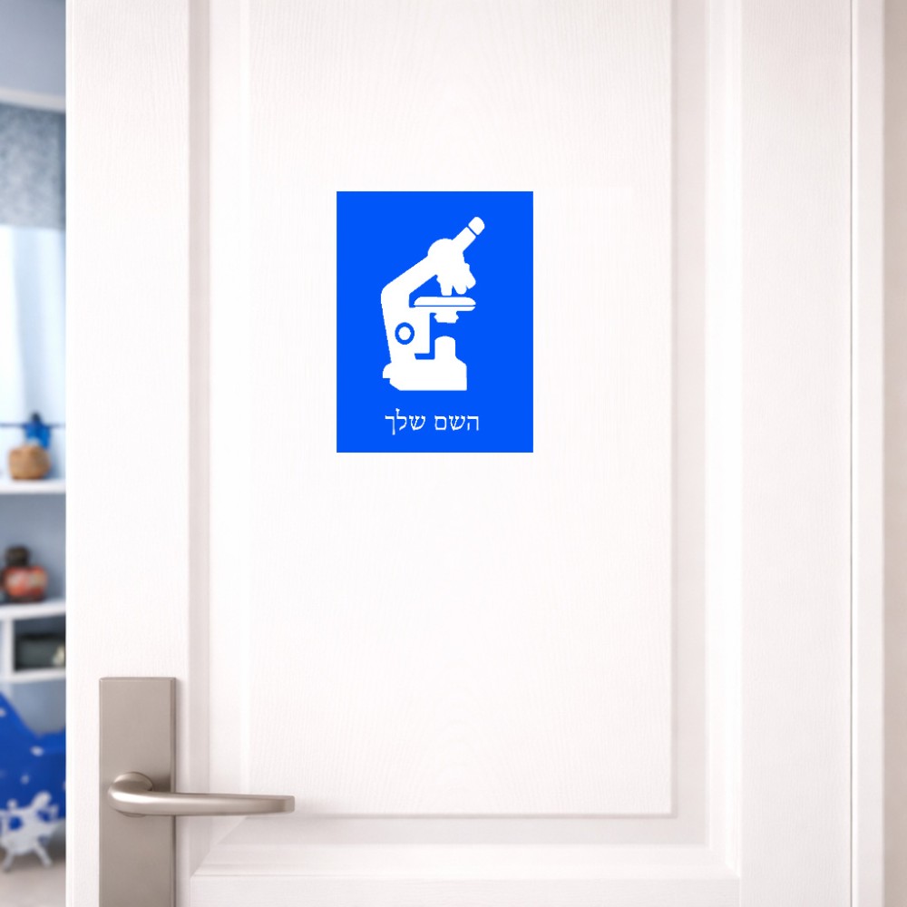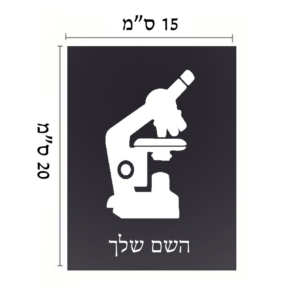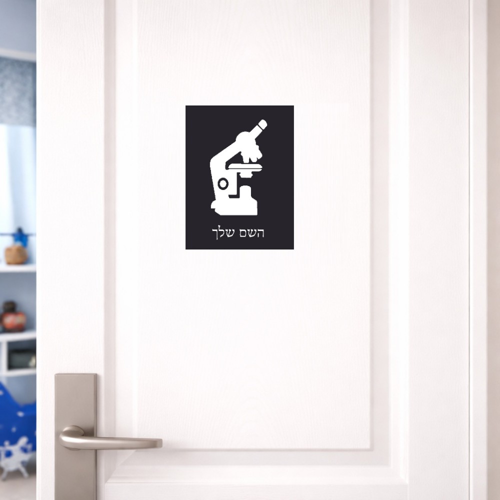 שלט אלומיניום קטן לחדר בעיצוב אישי עם השם שלך בעיצוב מיקרוסקופ גודל השלט 15 × 20 ס"מ. את השם המבוקש ניתן לציין בהזמנה, אם לא צויין אנחנו ניצור קשר לבירור.