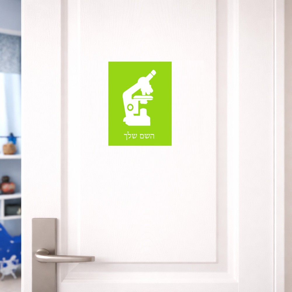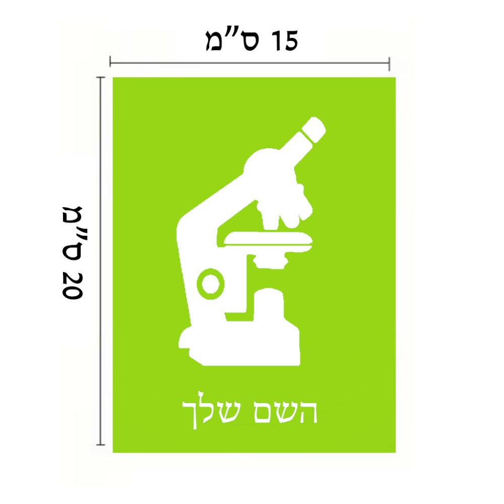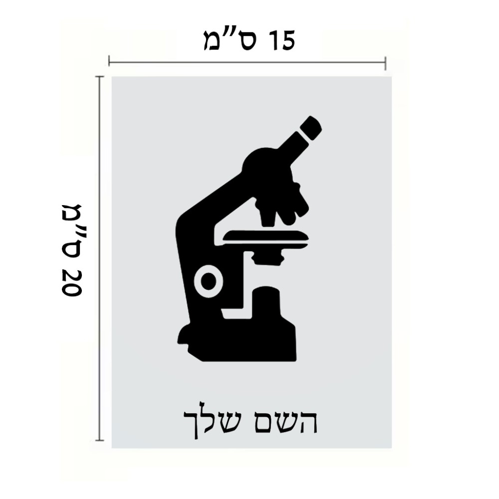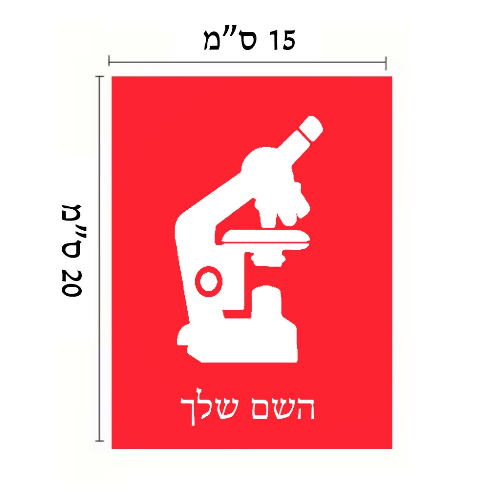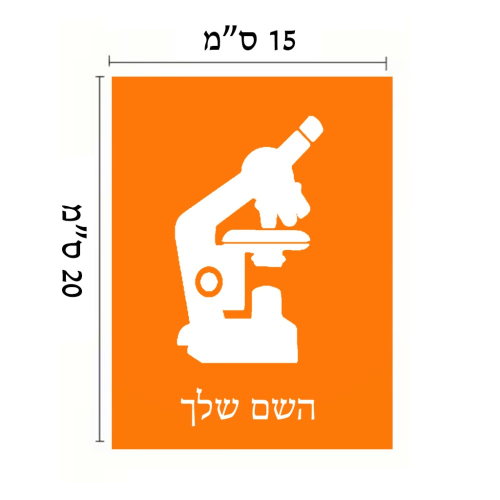 שלט אלומיניום קטן לחדר בעיצוב אישי עם השם שלך בעיצוב מיקרוסקופ גודל השלט 15 × 20 ס"מ. את השם המבוקש ניתן לציין בהזמנה, אם לא צויין אנחנו ניצור קשר לבירור.