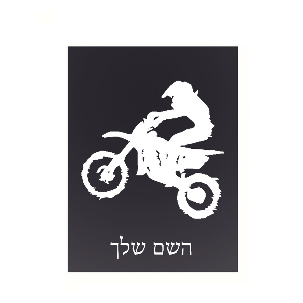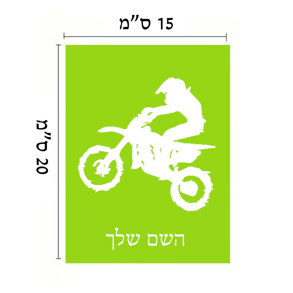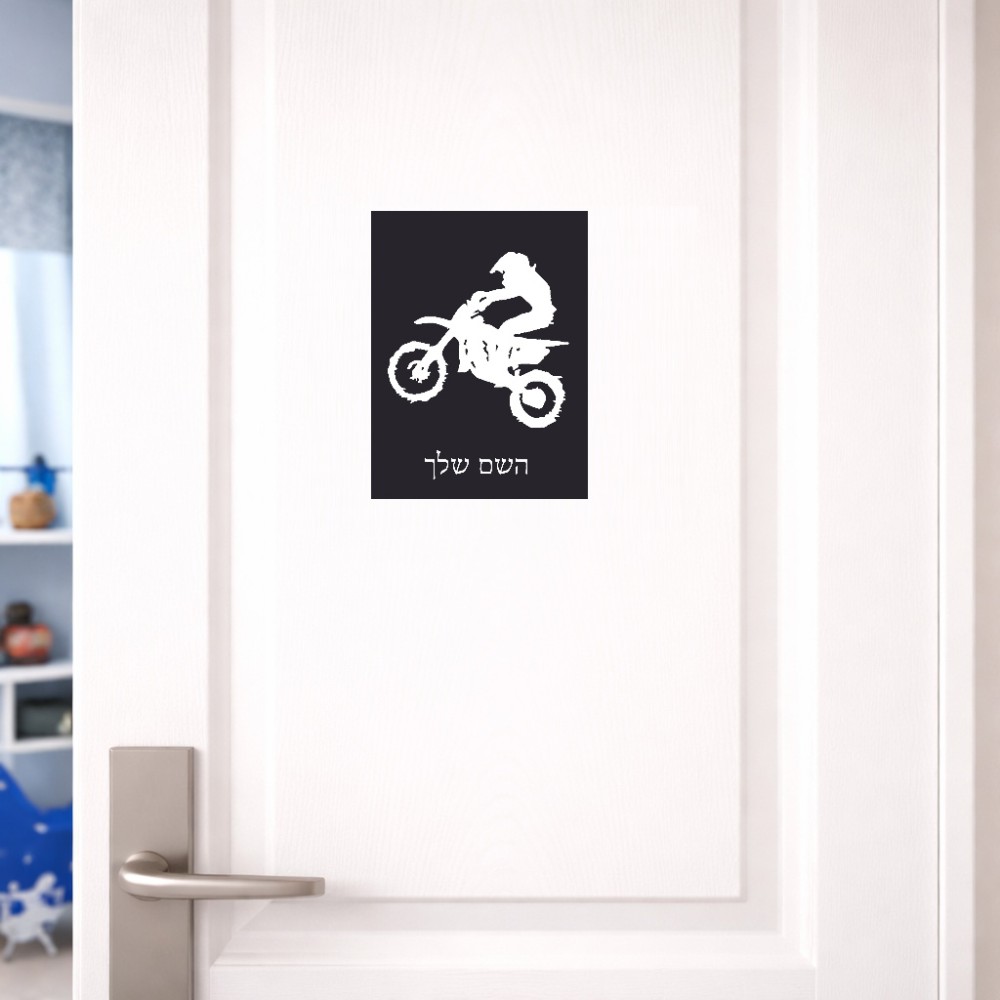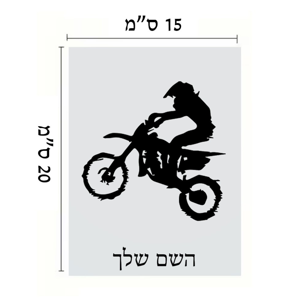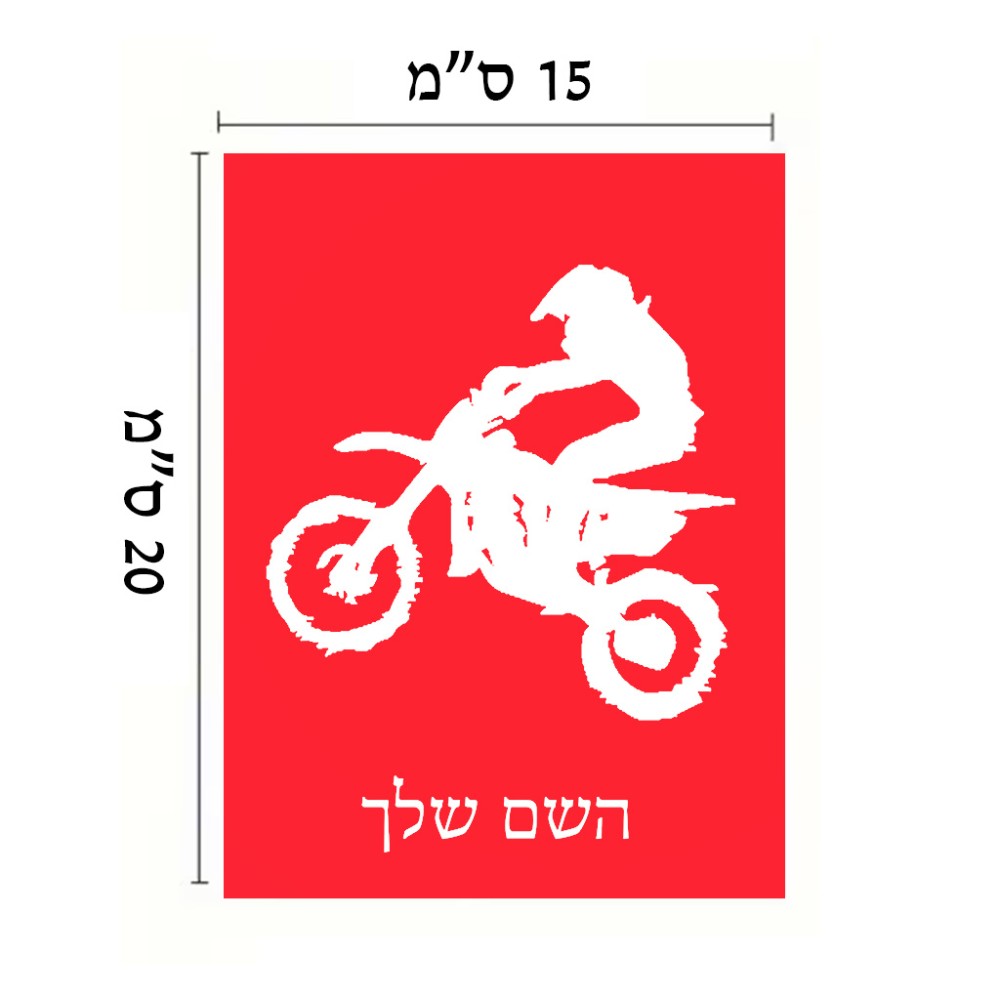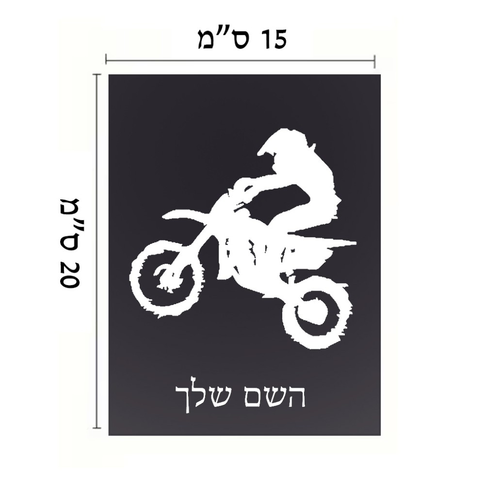 שלט אלומיניום קטן לחדר בעיצוב אישי עם השם שלך בעיצוב מוטוקרוס גודל השלט 15 × 20 ס"מ. את השם המבוקש ניתן לציין בהזמנה, אם לא צויין אנחנו ניצור קשר לבירור.