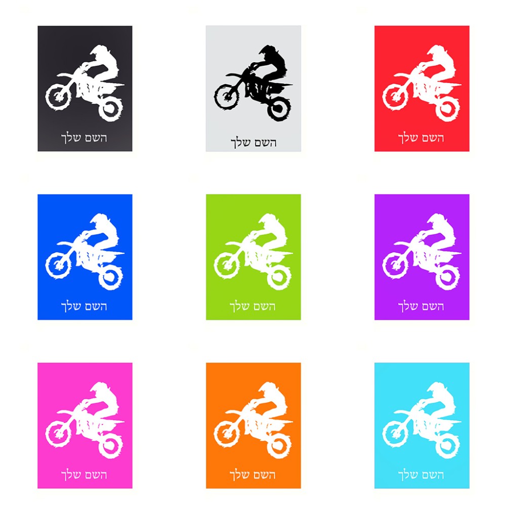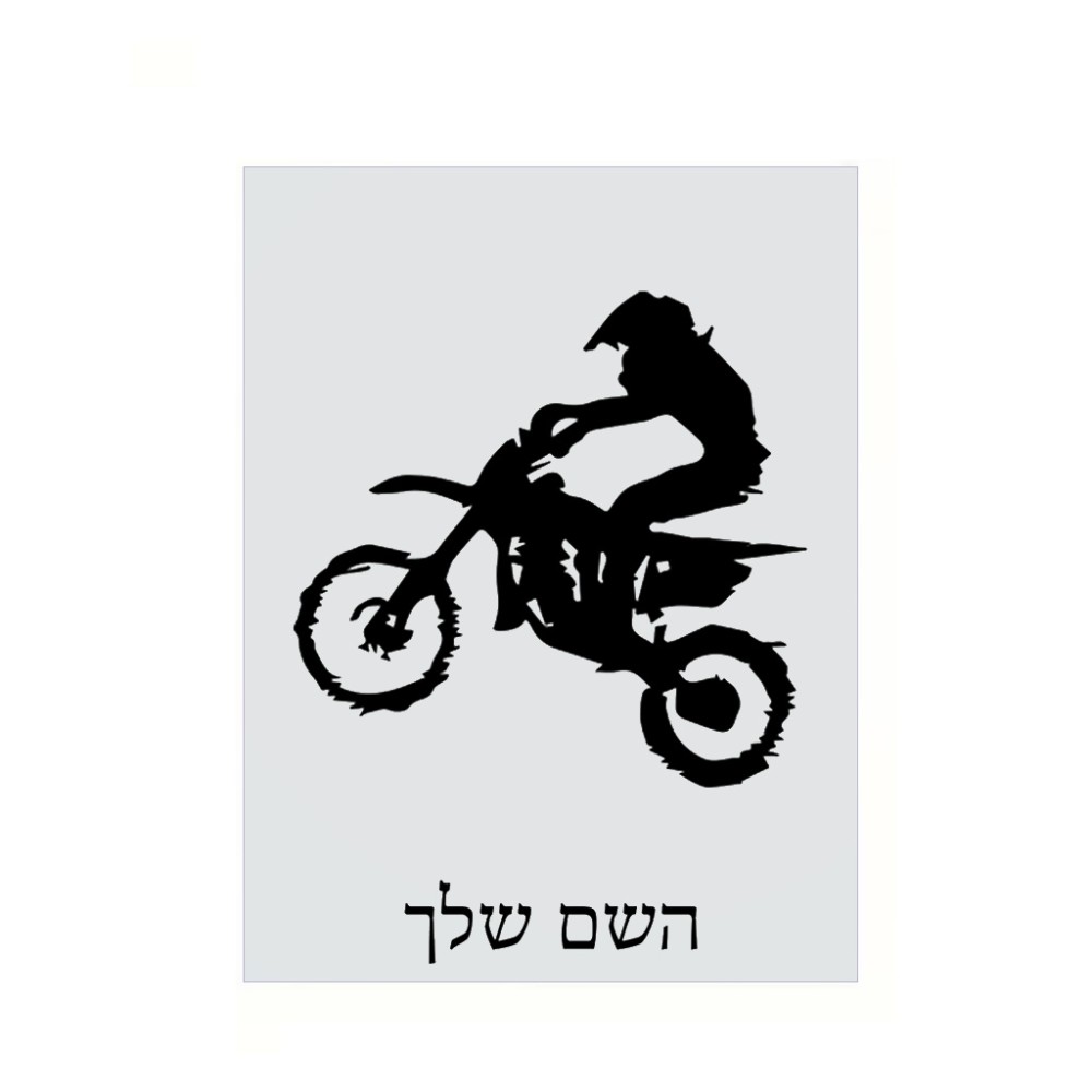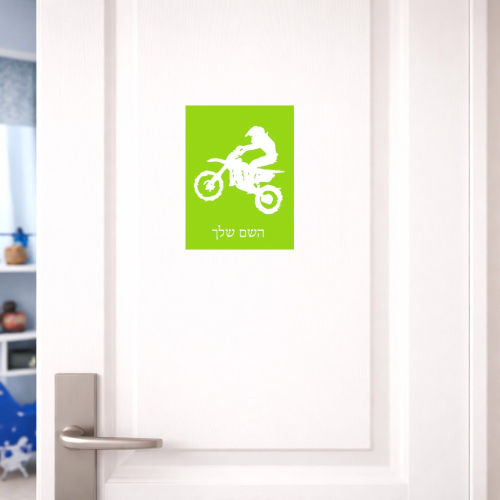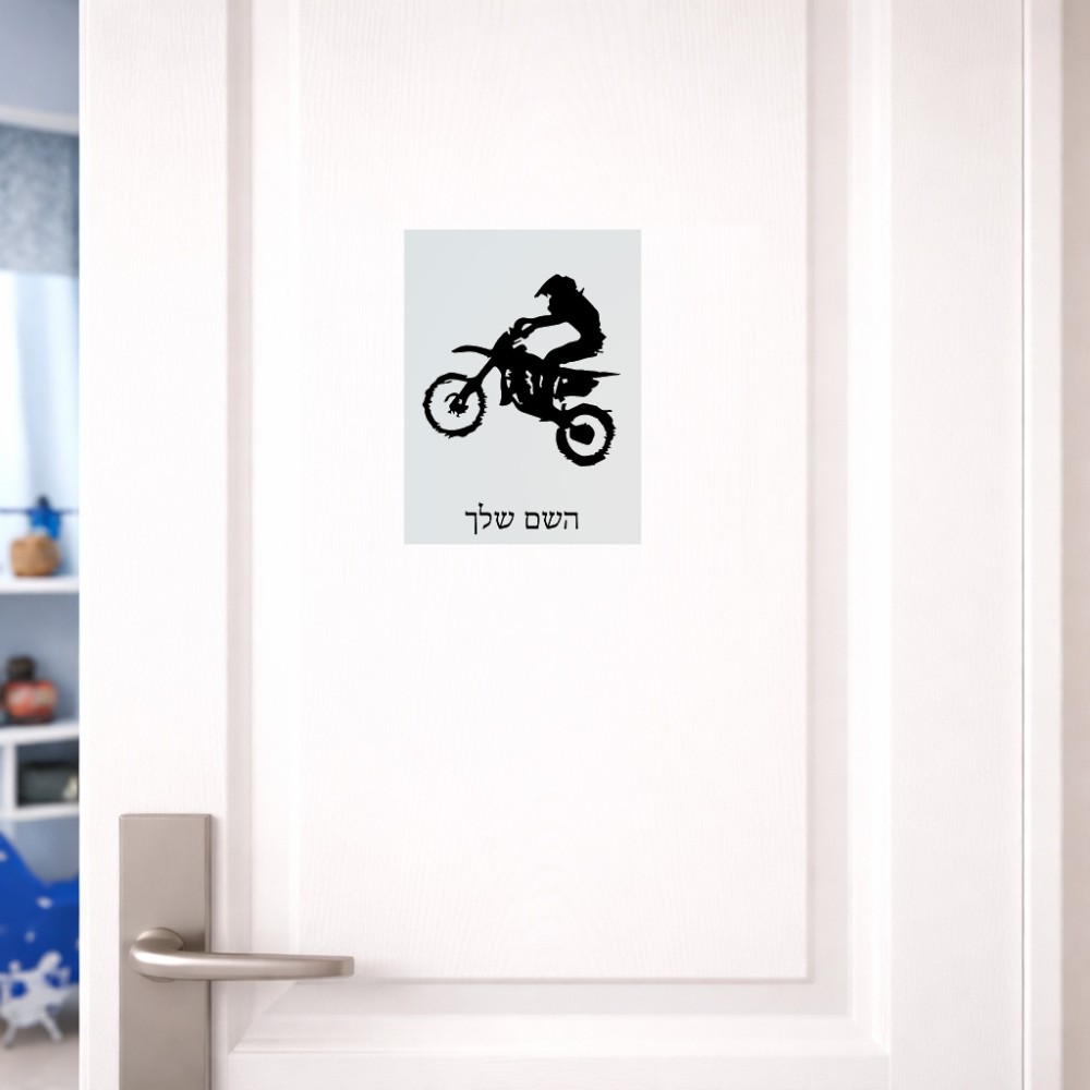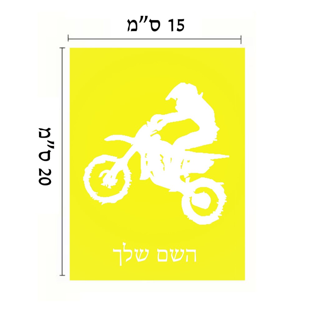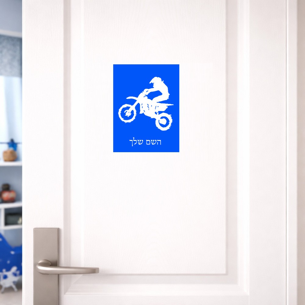 שלט אלומיניום קטן לחדר בעיצוב אישי עם השם שלך בעיצוב מוטוקרוס גודל השלט 15 × 20 ס"מ. את השם המבוקש ניתן לציין בהזמנה, אם לא צויין אנחנו ניצור קשר לבירור.