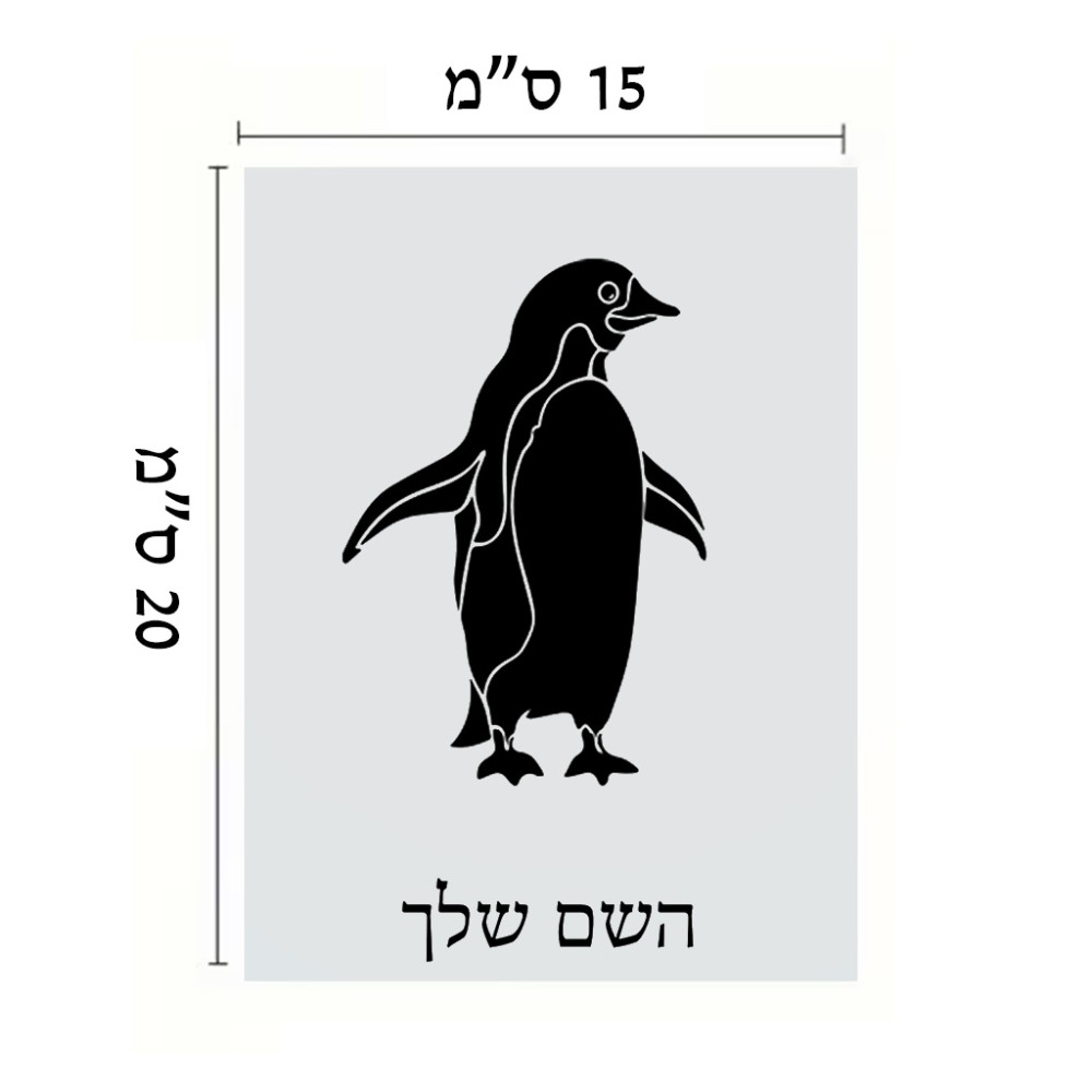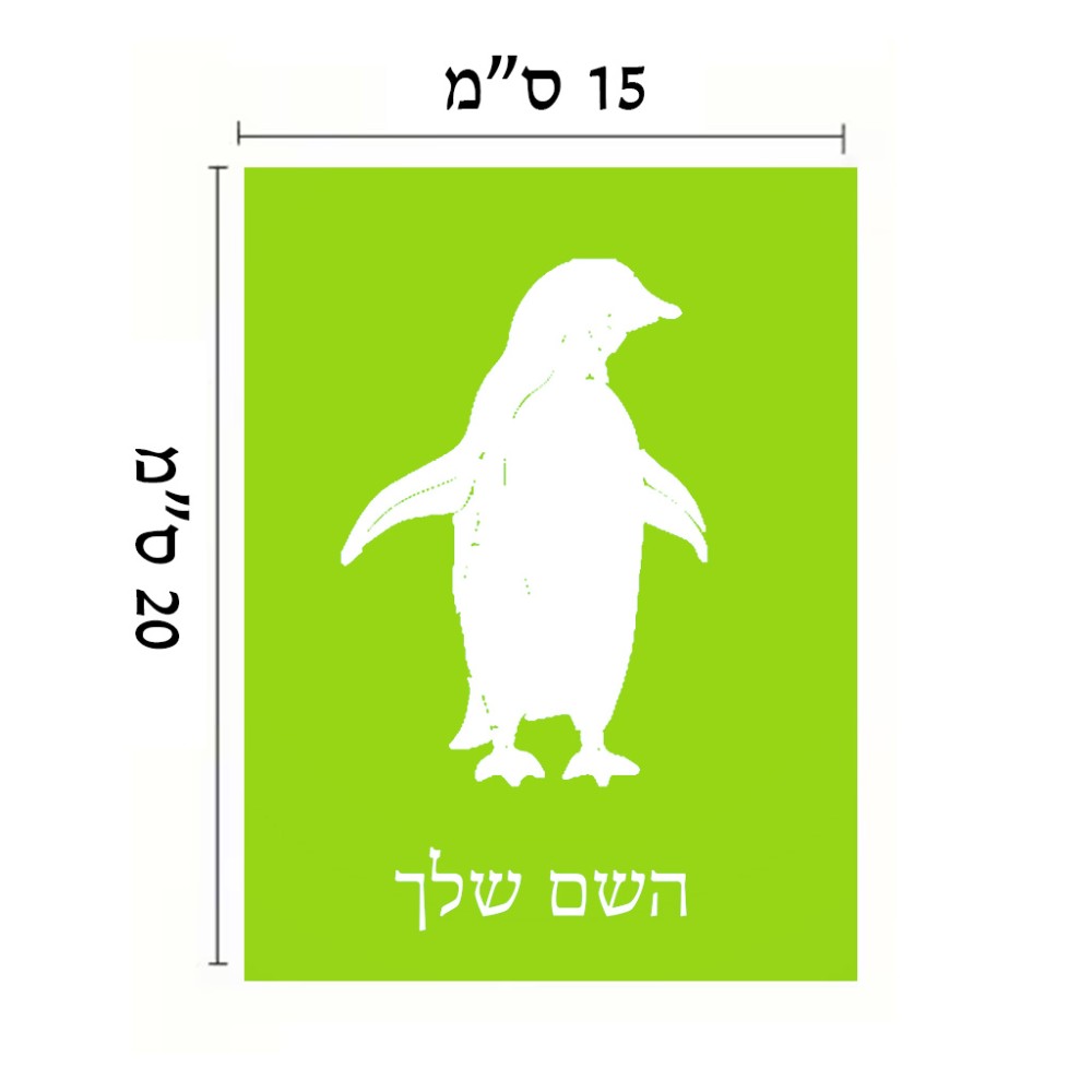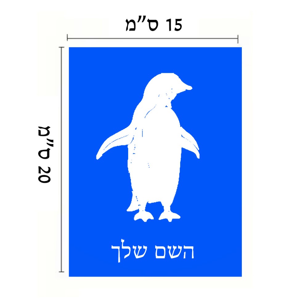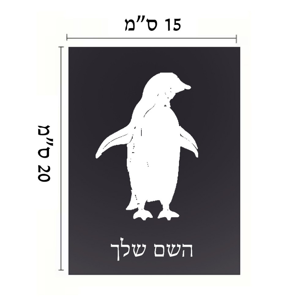 שלט אלומיניום קטן לחדר בעיצוב אישי עם השם שלך בעיצוב פינגווין גודל השלט 15 × 20 ס"מ. את השם המבוקש ניתן לציין בהזמנה, אם לא צויין אנחנו ניצור קשר לבירור.