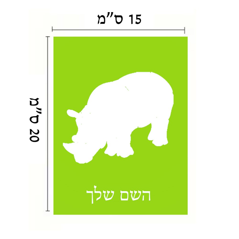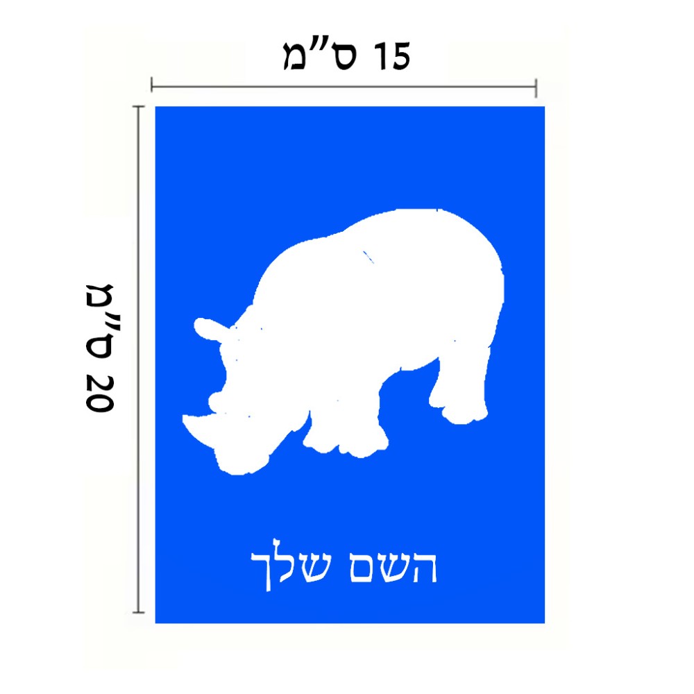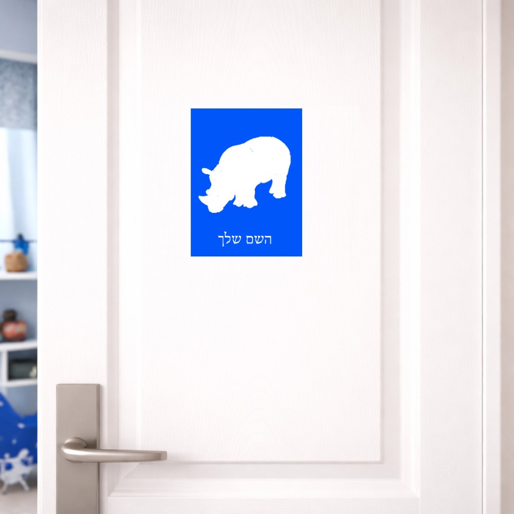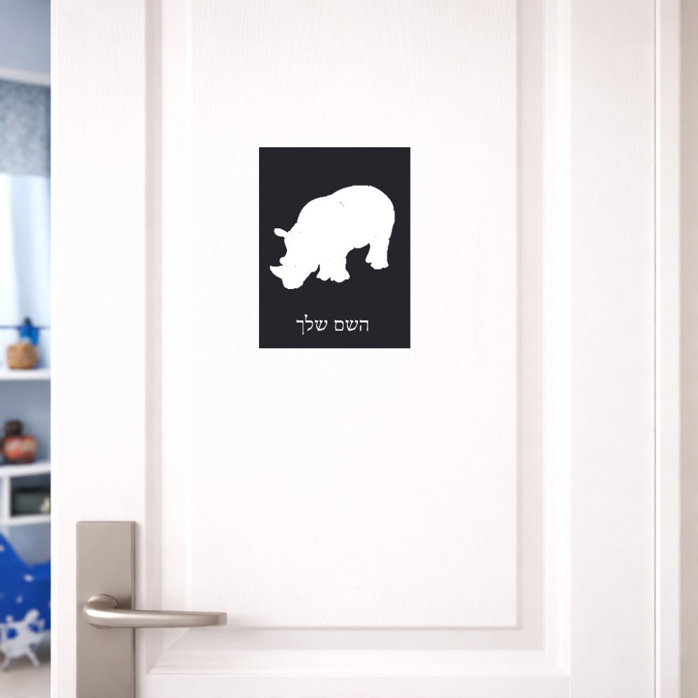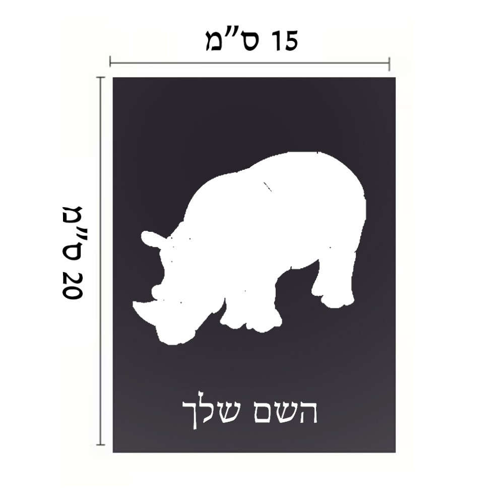 שלט אלומיניום קטן לחדר בעיצוב אישי עם השם שלך בעיצוב קרנף גודל השלט 15 × 20 ס"מ. את השם המבוקש ניתן לציין בהזמנה, אם לא צויין אנחנו ניצור קשר לבירור.