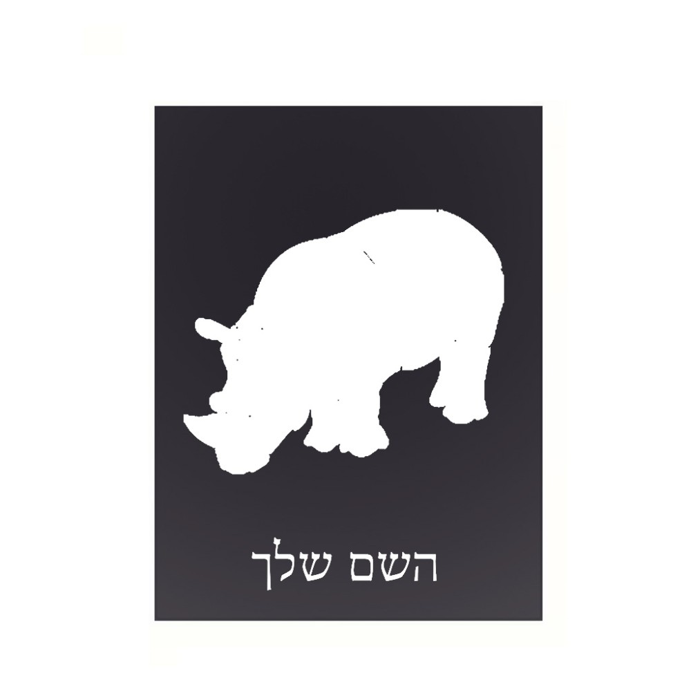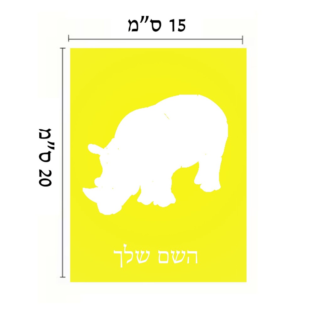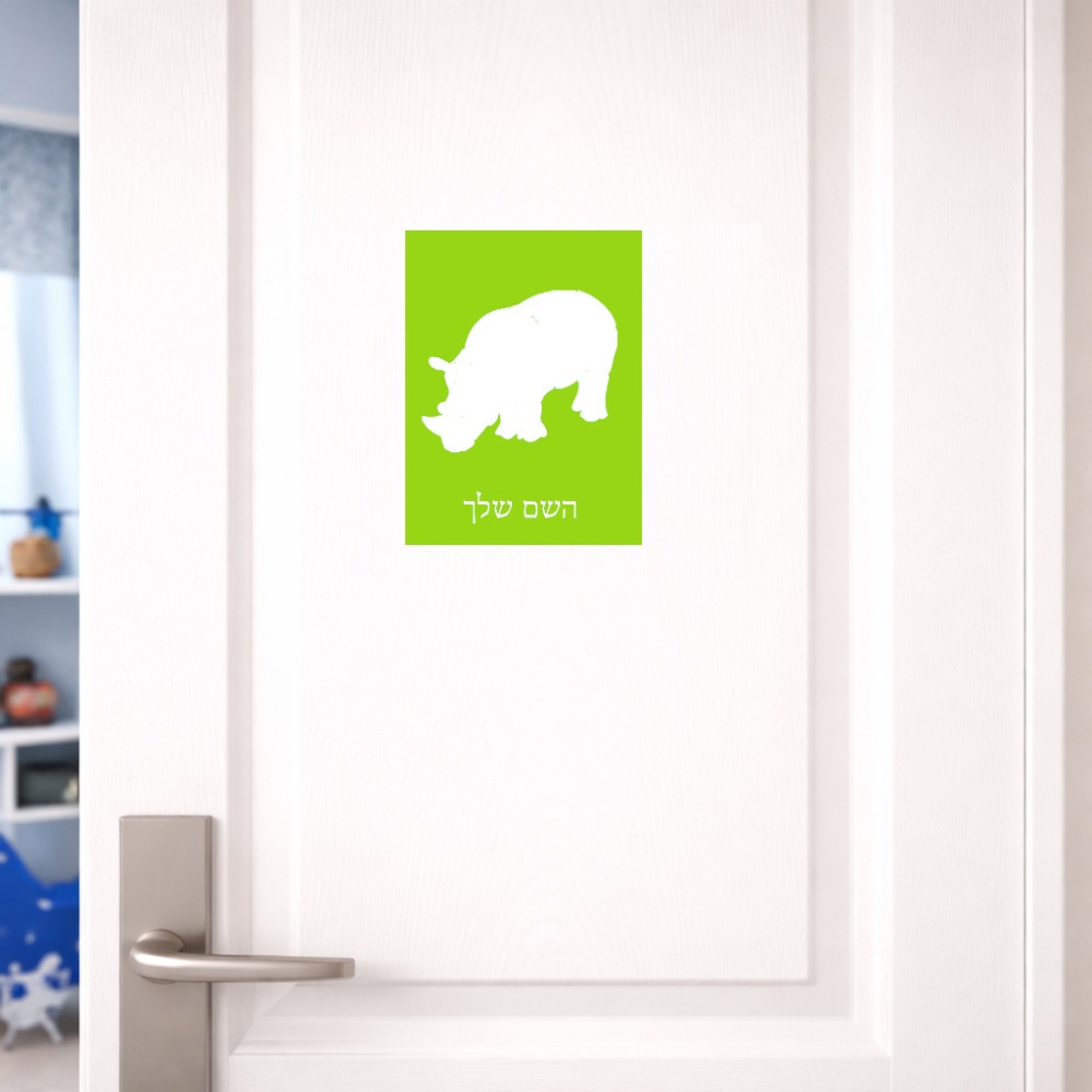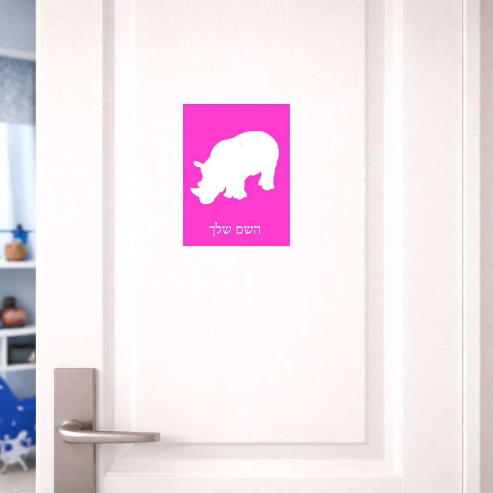 שלט אלומיניום קטן לחדר בעיצוב אישי עם השם שלך בעיצוב קרנף גודל השלט 15 × 20 ס"מ. את השם המבוקש ניתן לציין בהזמנה, אם לא צויין אנחנו ניצור קשר לבירור.