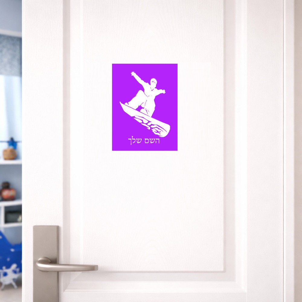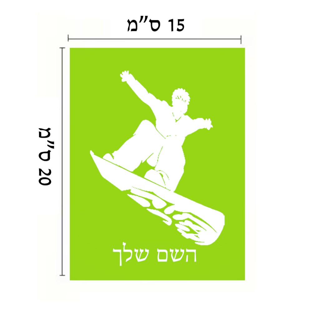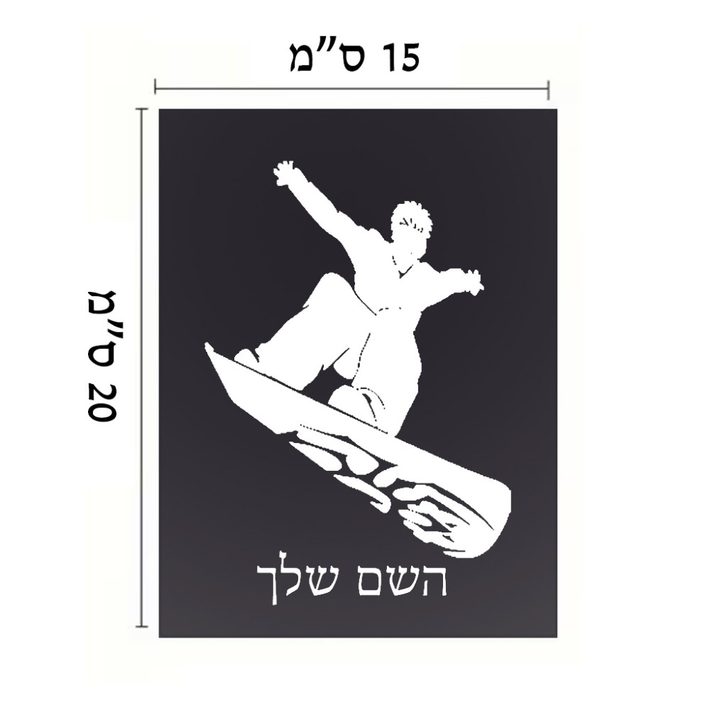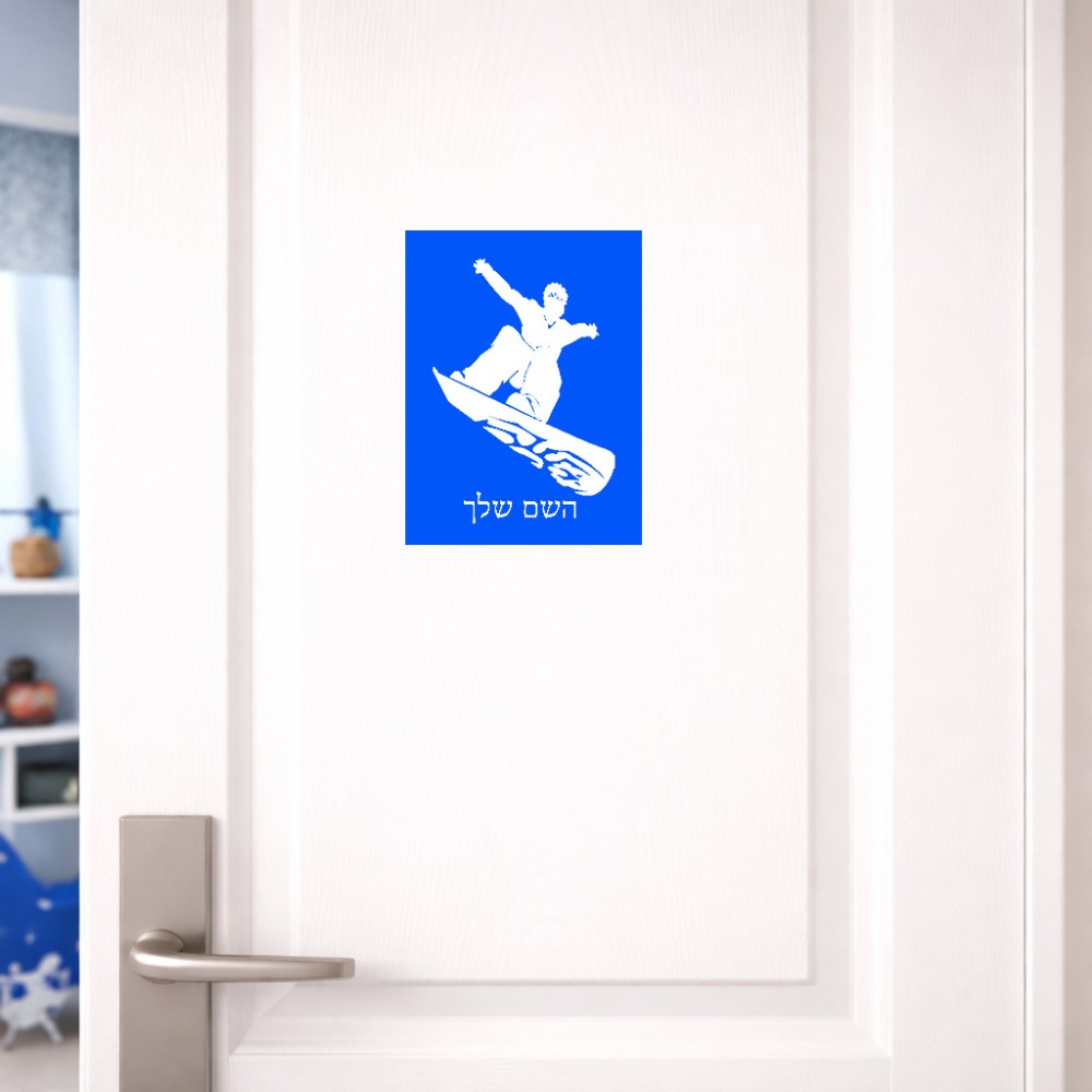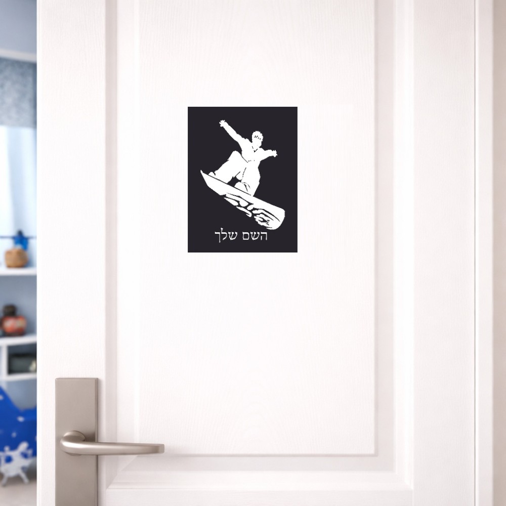 שלט אלומיניום קטן לחדר בעיצוב אישי עם השם שלך בעיצוב סנובורדיסט גודל השלט 15 × 20 ס"מ. את השם המבוקש ניתן לציין בהזמנה, אם לא צויין אנחנו ניצור קשר לבירור.