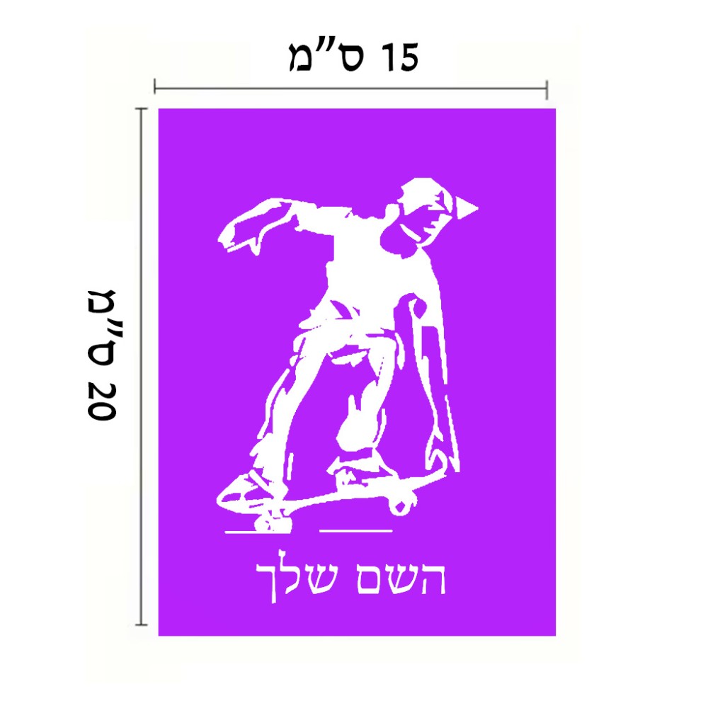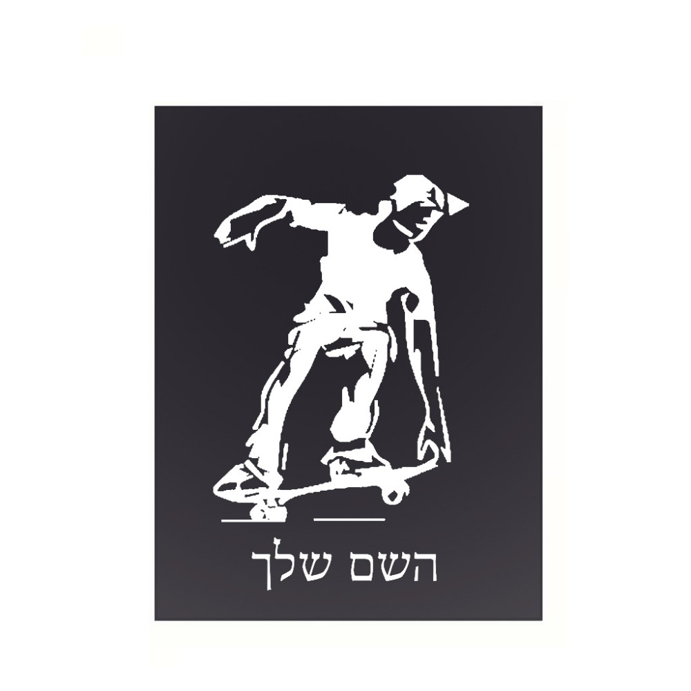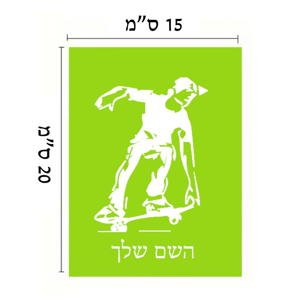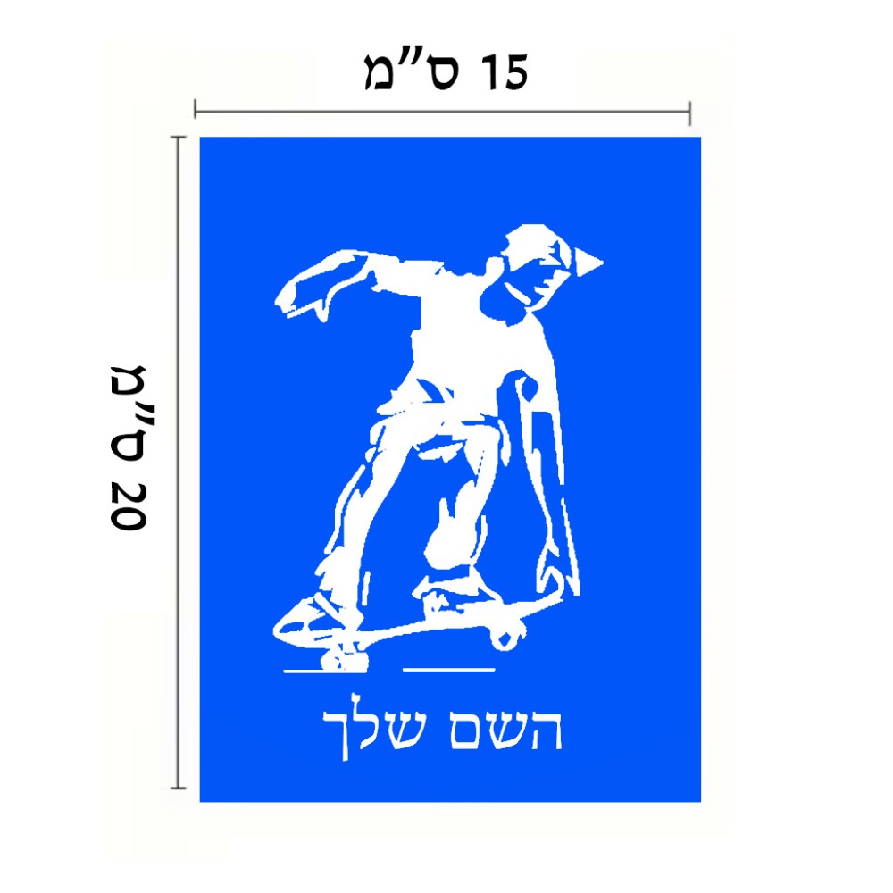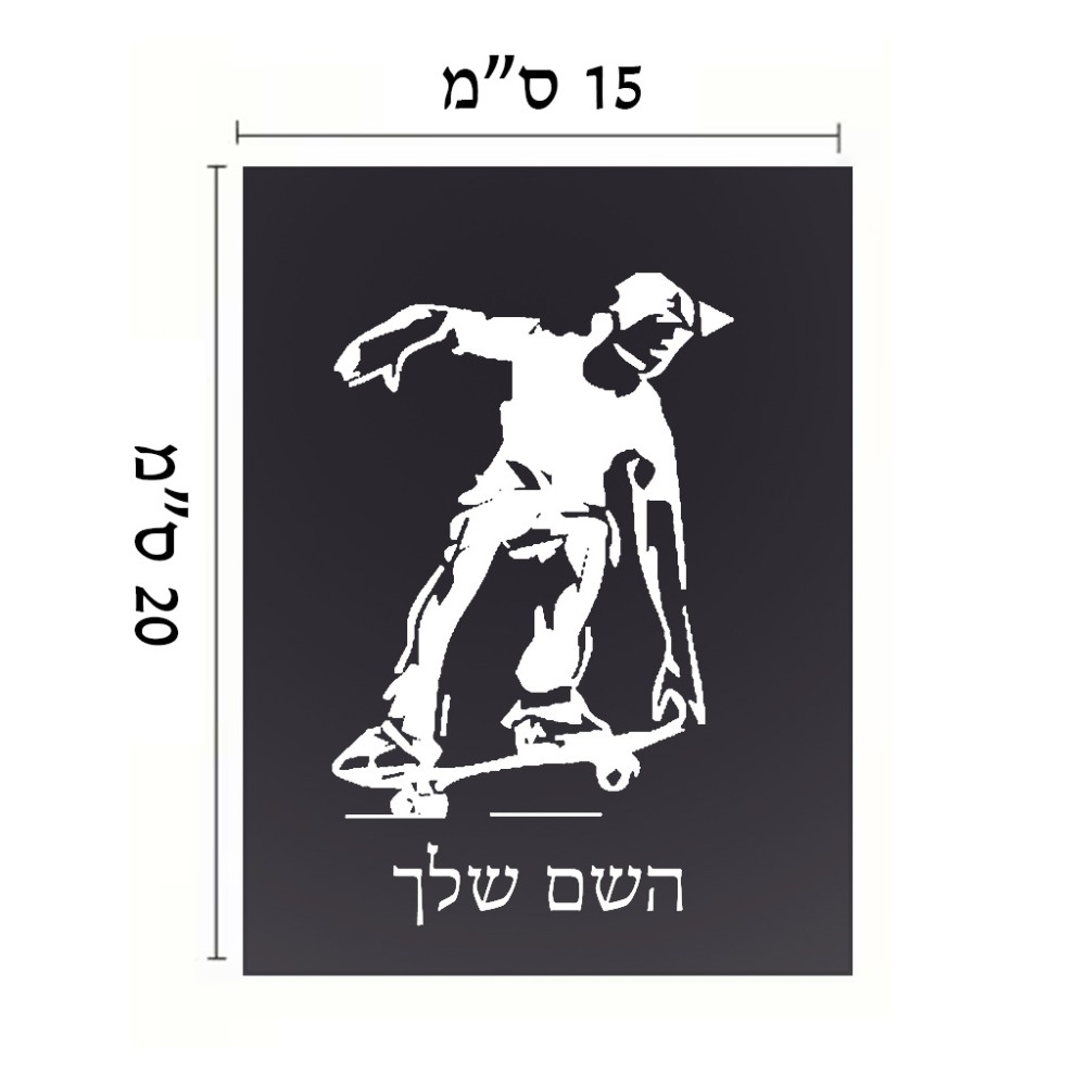 שלט אלומיניום קטן לחדר בעיצוב אישי עם השם שלך בעיצוב ילד סקייטבורד גודל השלט 15 × 20 ס"מ. את השם המבוקש ניתן לציין בהזמנה, אם לא צויין אנחנו ניצור קשר לבירור.