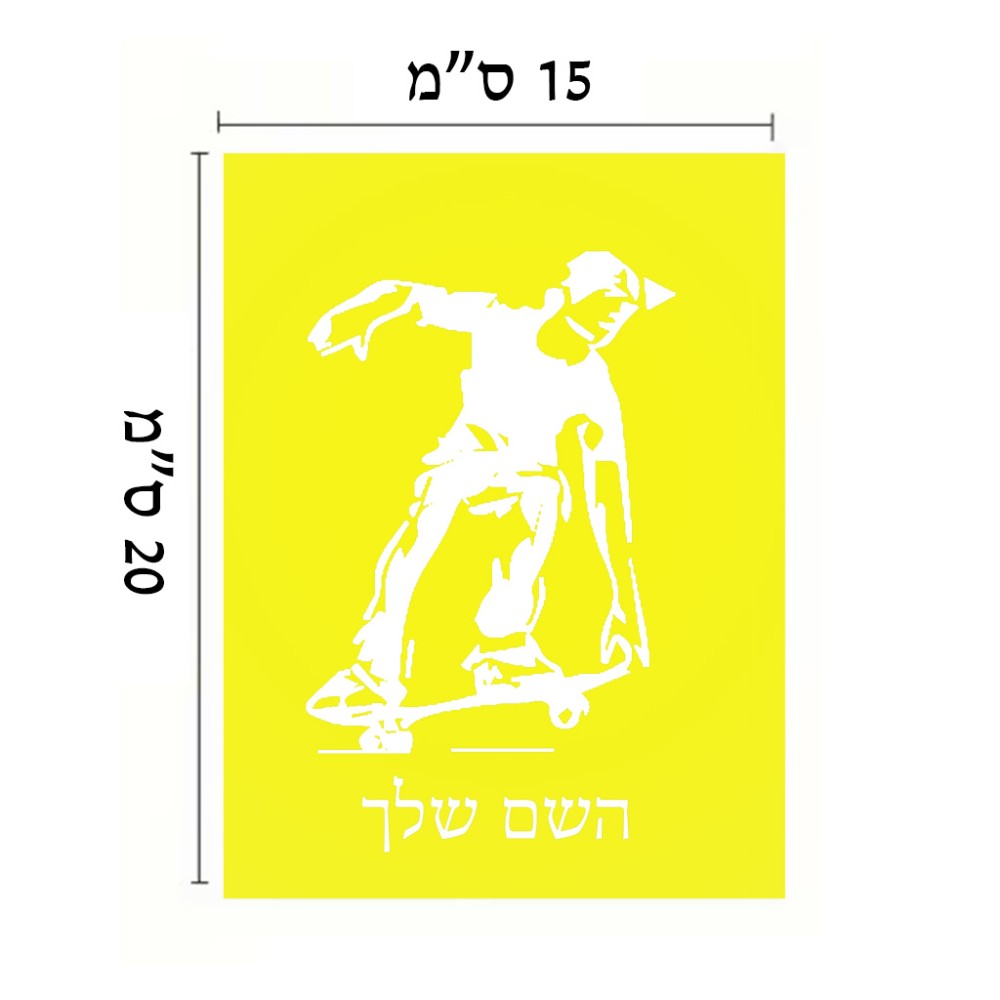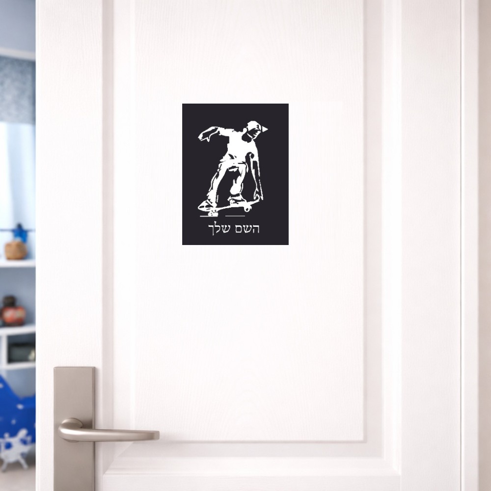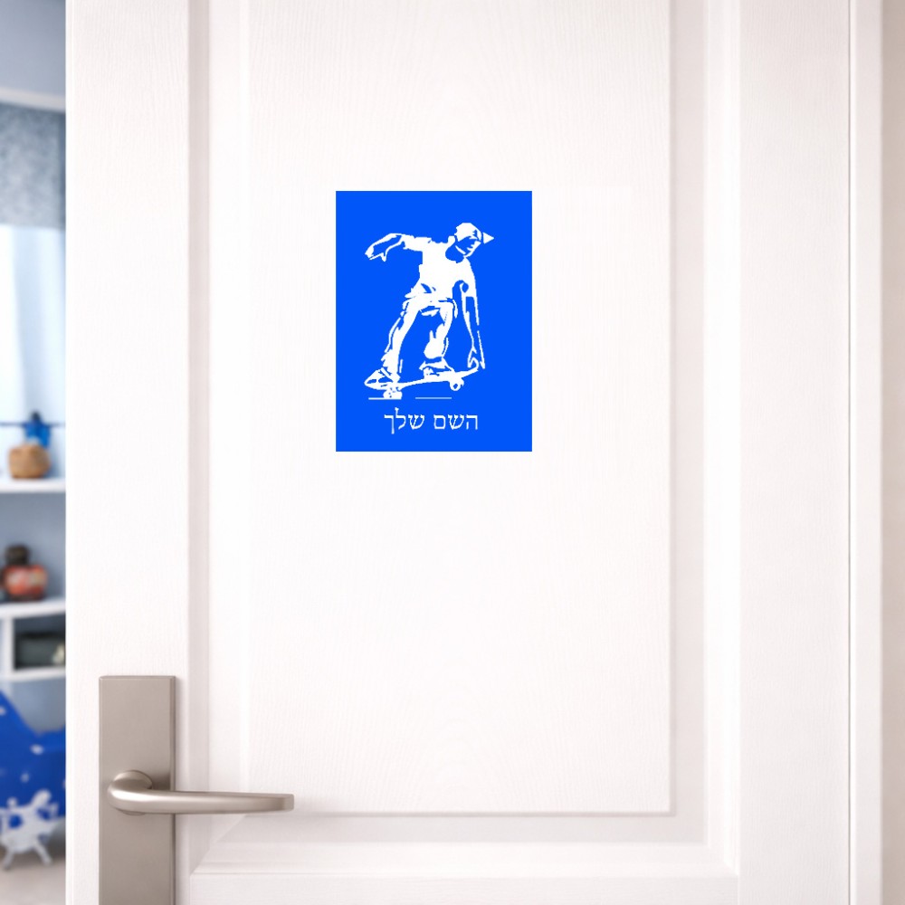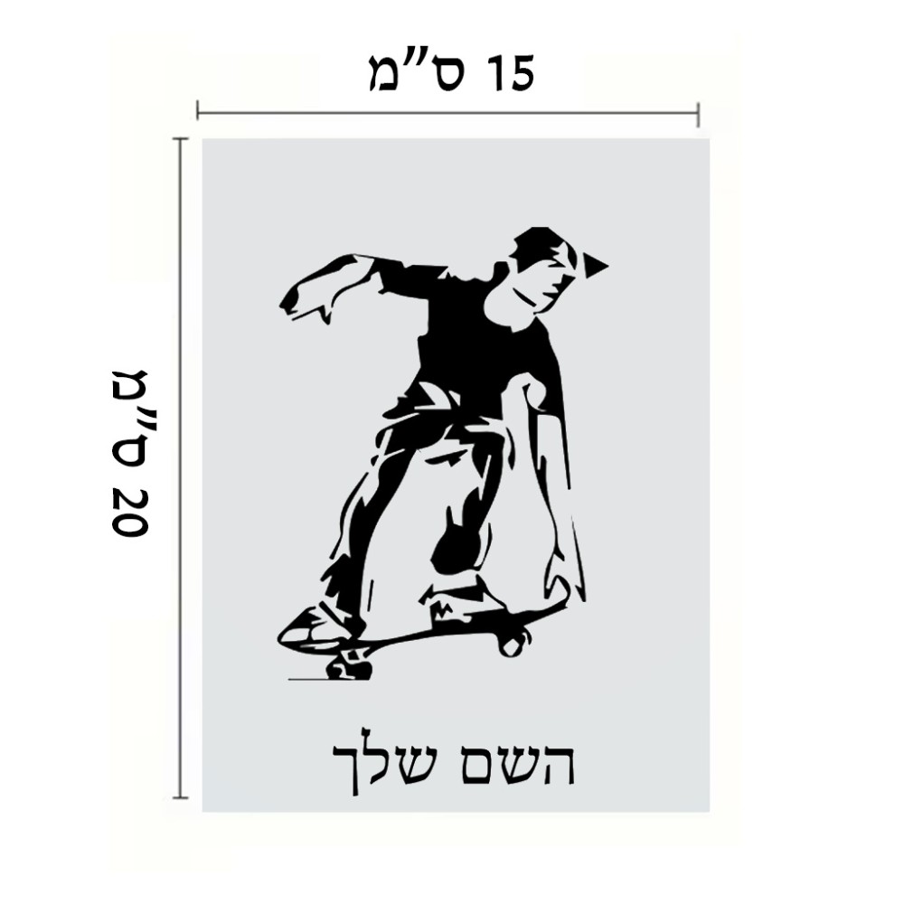 שלט אלומיניום קטן לחדר בעיצוב אישי עם השם שלך בעיצוב ילד סקייטבורד גודל השלט 15 × 20 ס"מ. את השם המבוקש ניתן לציין בהזמנה, אם לא צויין אנחנו ניצור קשר לבירור.