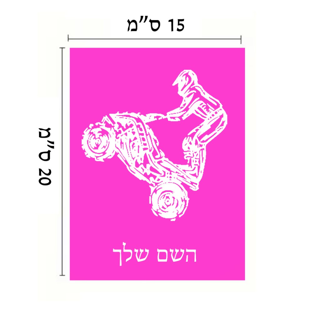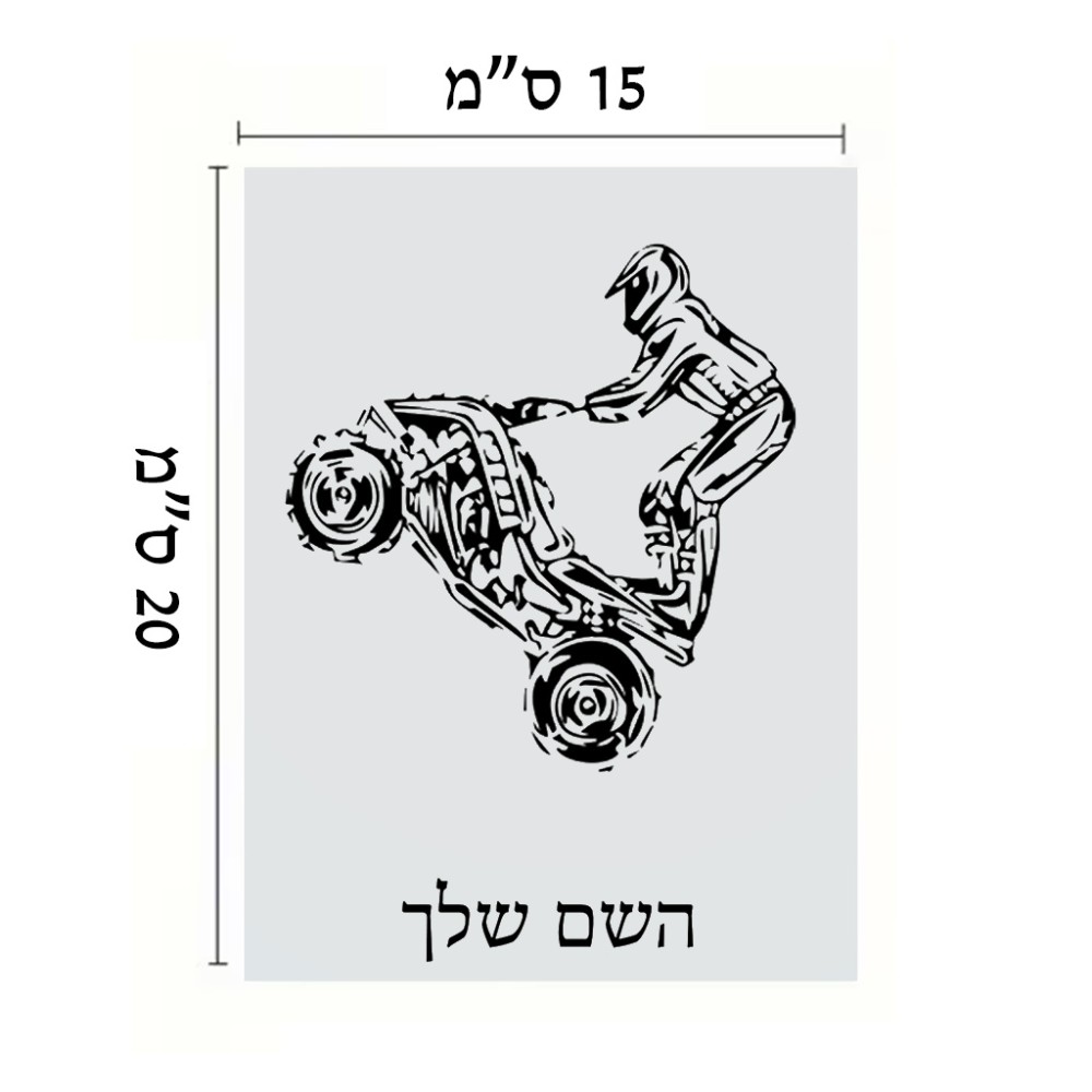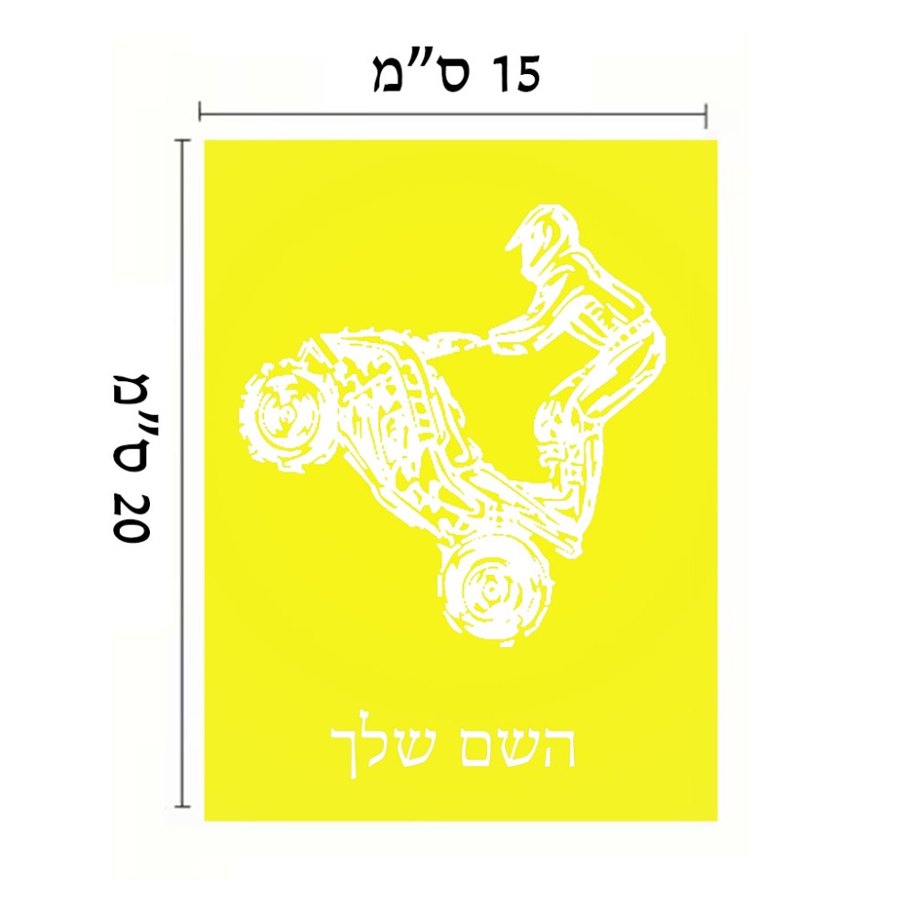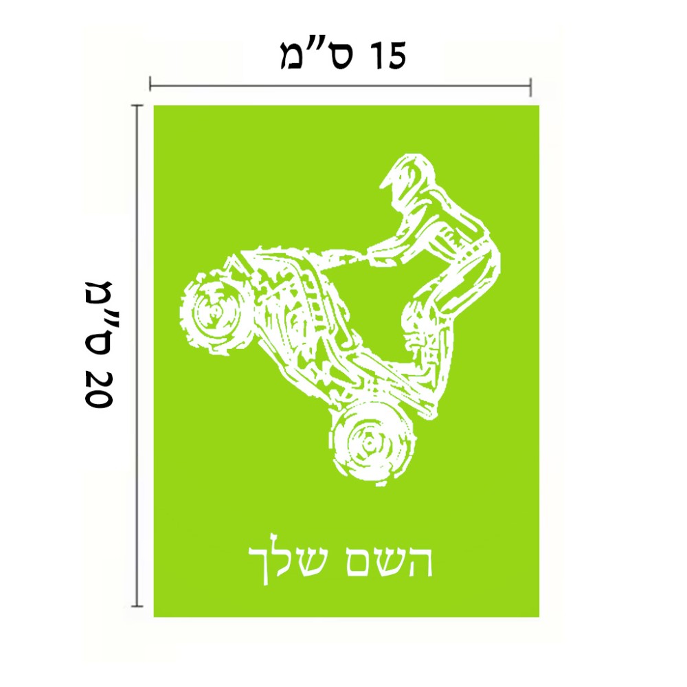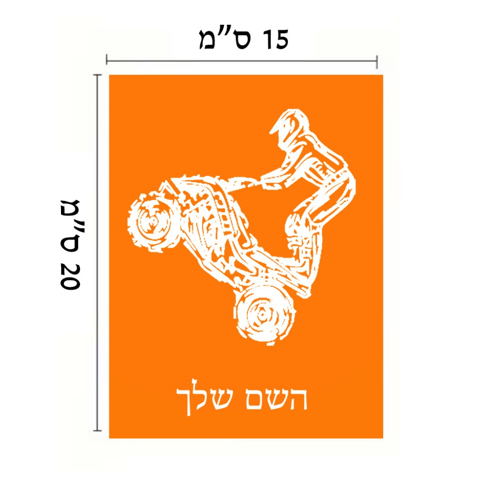 שלט אלומיניום קטן לחדר בעיצוב אישי עם השם שלך בעיצוב רוכב טרקטורונים גודל השלט 15 × 20 ס"מ. את השם המבוקש ניתן לציין בהזמנה, אם לא צויין אנחנו ניצור קשר לבירור.