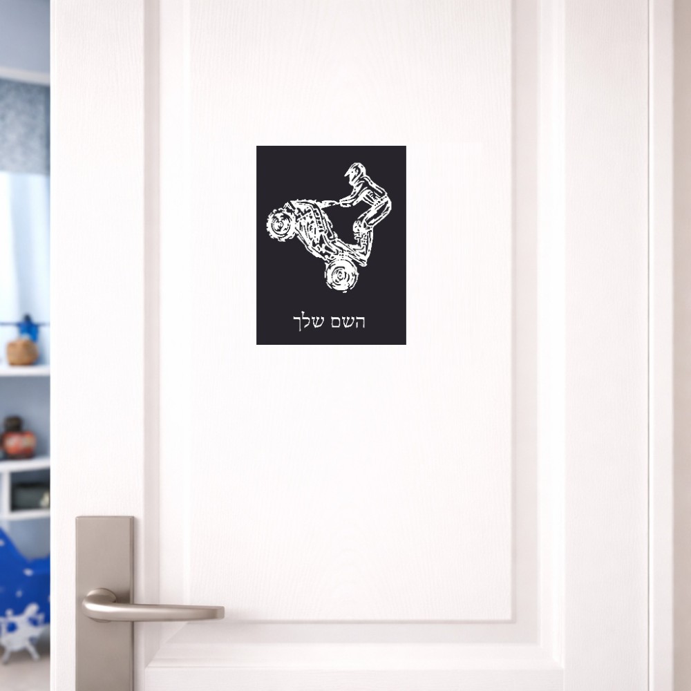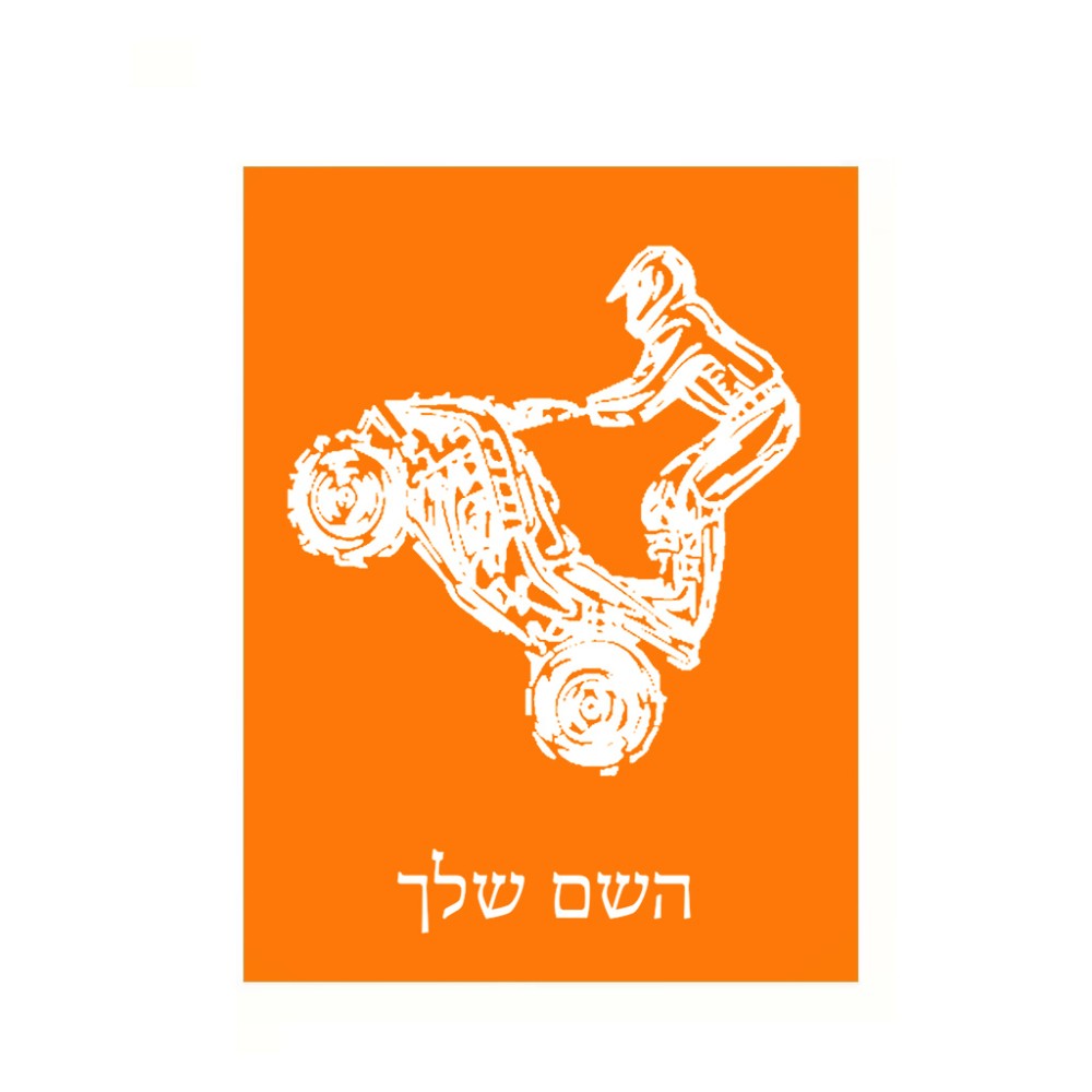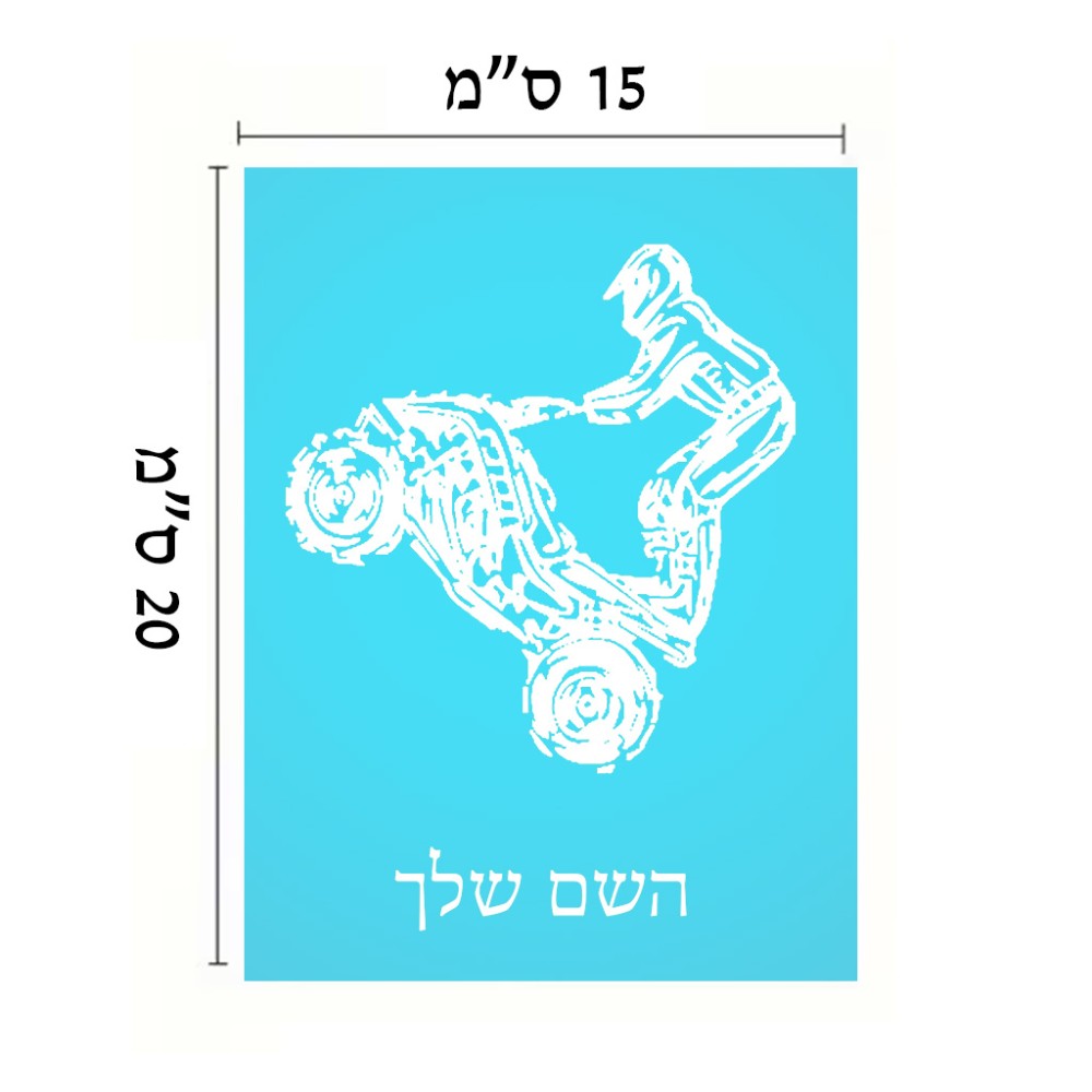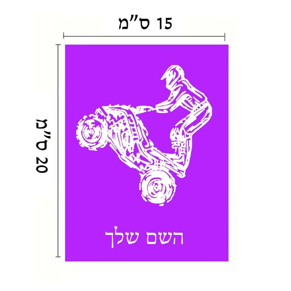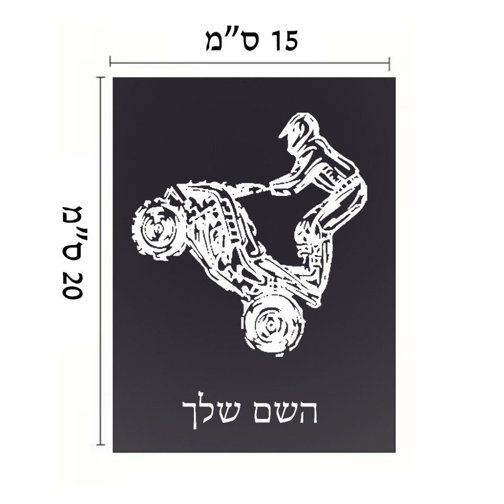 שלט אלומיניום קטן לחדר בעיצוב אישי עם השם שלך בעיצוב רוכב טרקטורונים גודל השלט 15 × 20 ס"מ. את השם המבוקש ניתן לציין בהזמנה, אם לא צויין אנחנו ניצור קשר לבירור.