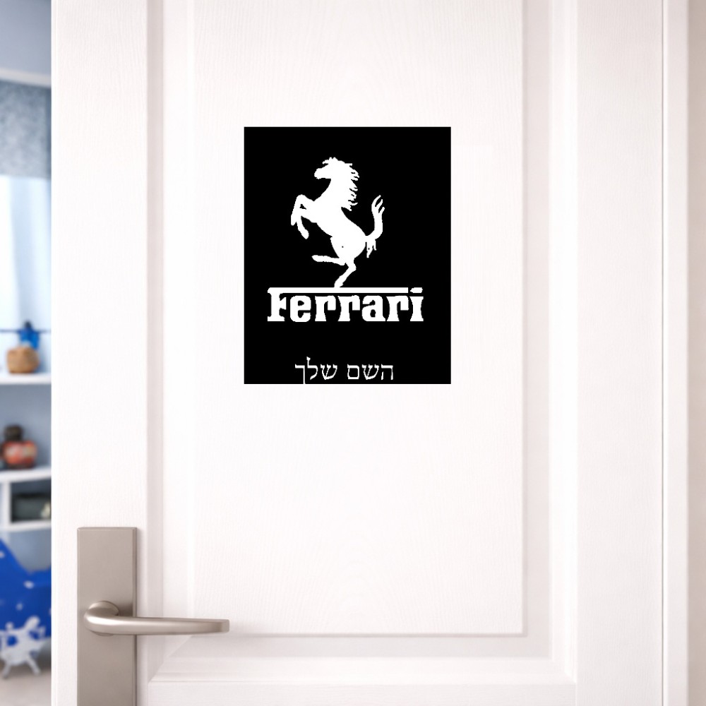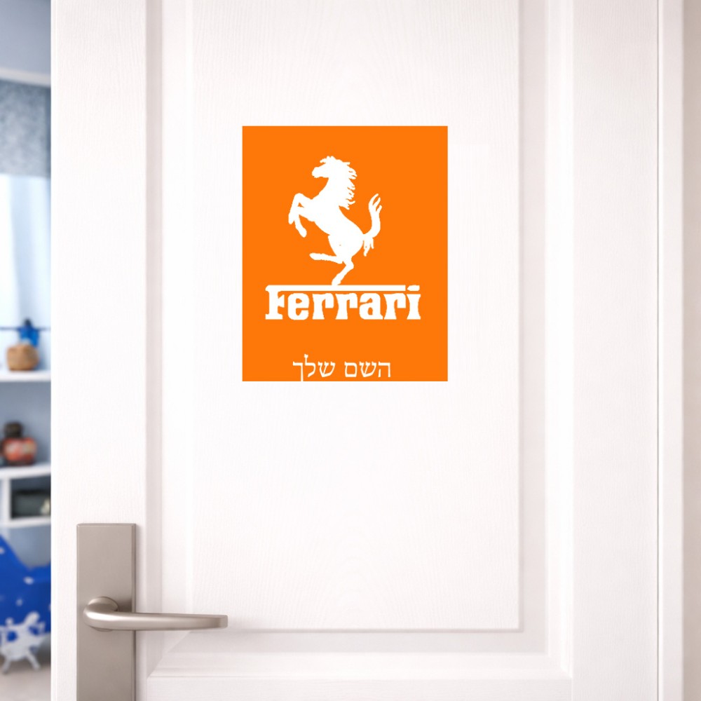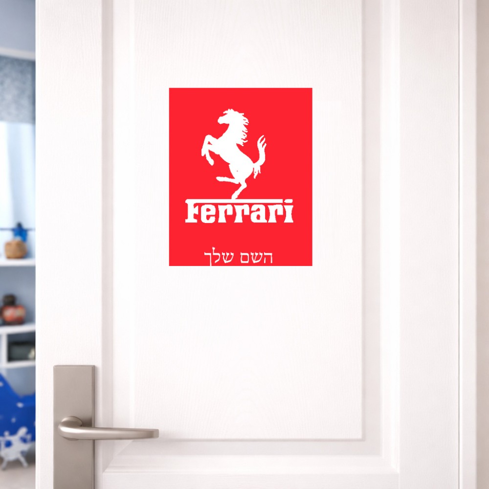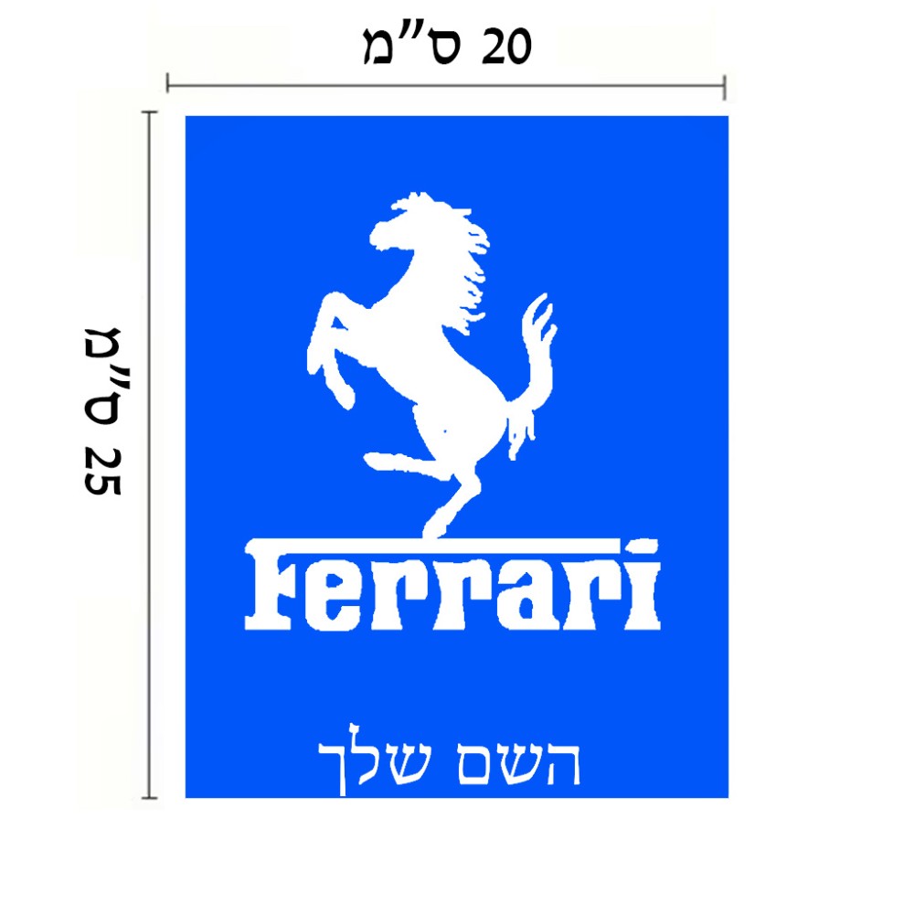 שלט אלומיניום גדול לחדר בעיצוב אישי עם השם שלך בעיצוב פרארי גודל השלט 20 × 25 ס"מ. את השם המבוקש ניתן לציין בהזמנה, אם לא צויין אנחנו ניצור קשר לבירור.