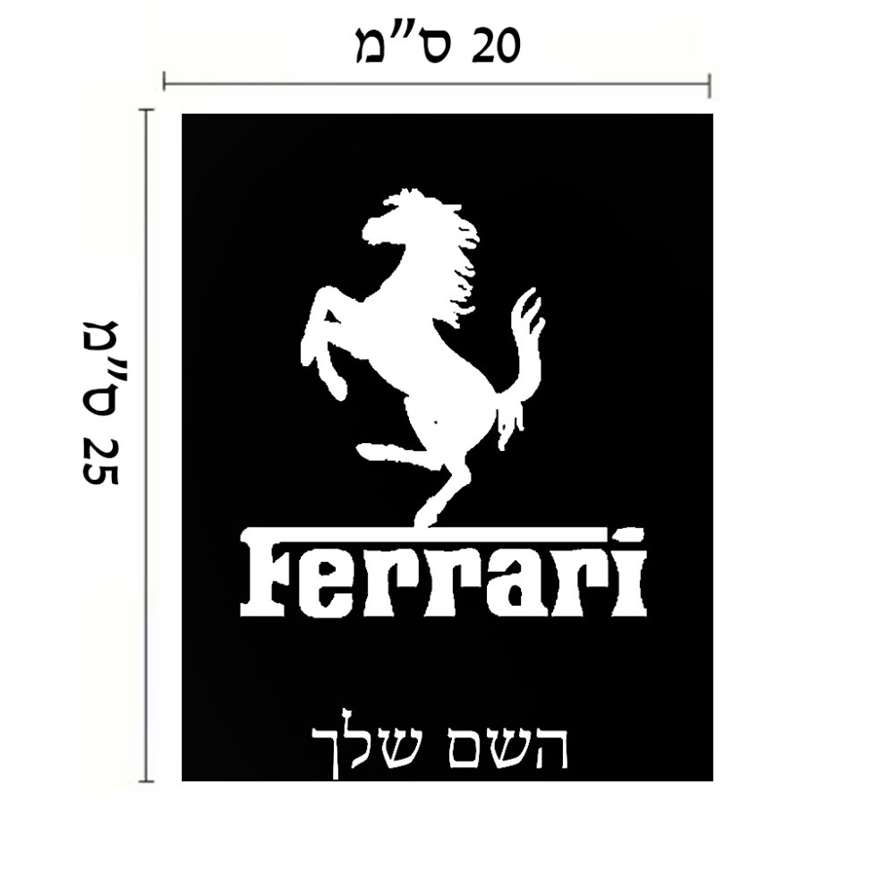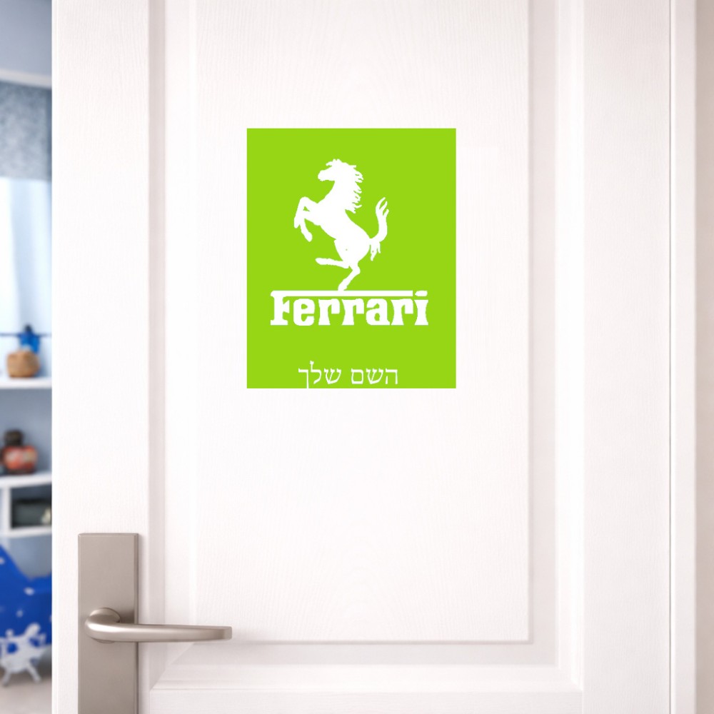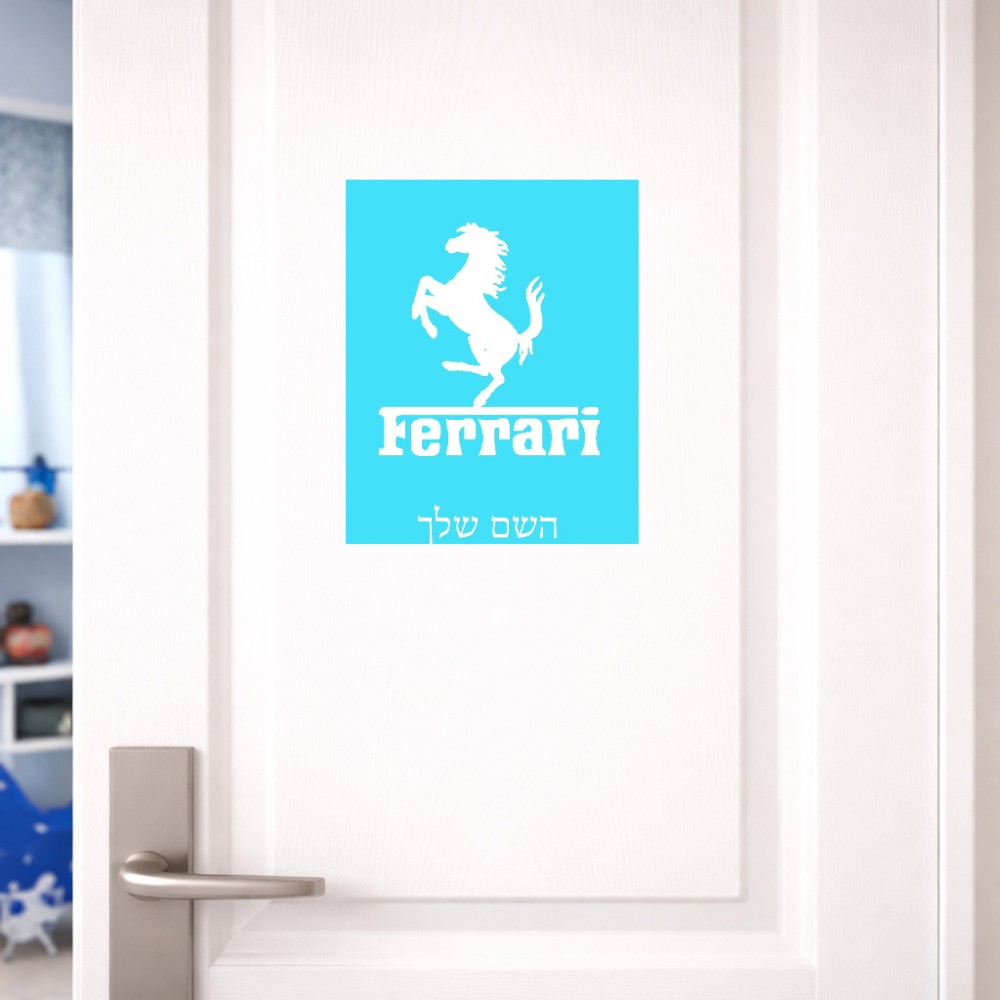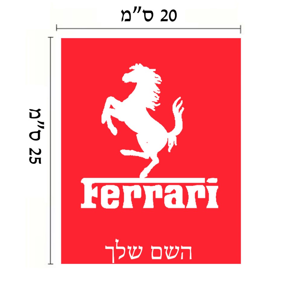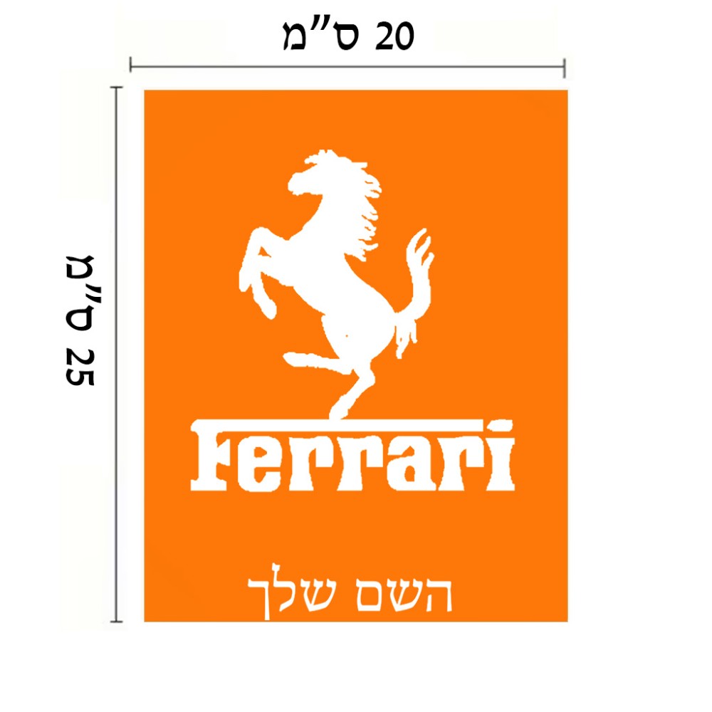 שלט אלומיניום גדול לחדר בעיצוב אישי עם השם שלך בעיצוב פרארי גודל השלט 20 × 25 ס"מ. את השם המבוקש ניתן לציין בהזמנה, אם לא צויין אנחנו ניצור קשר לבירור.