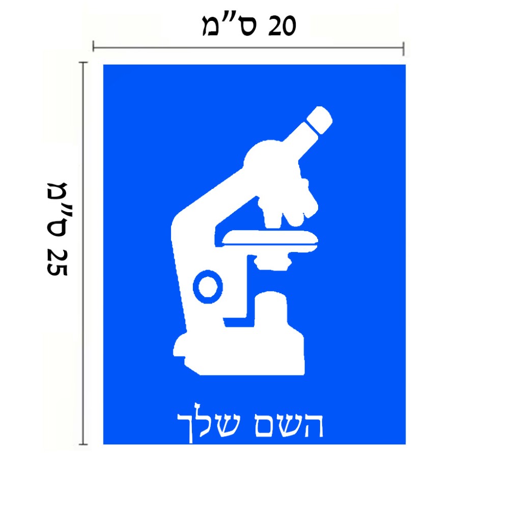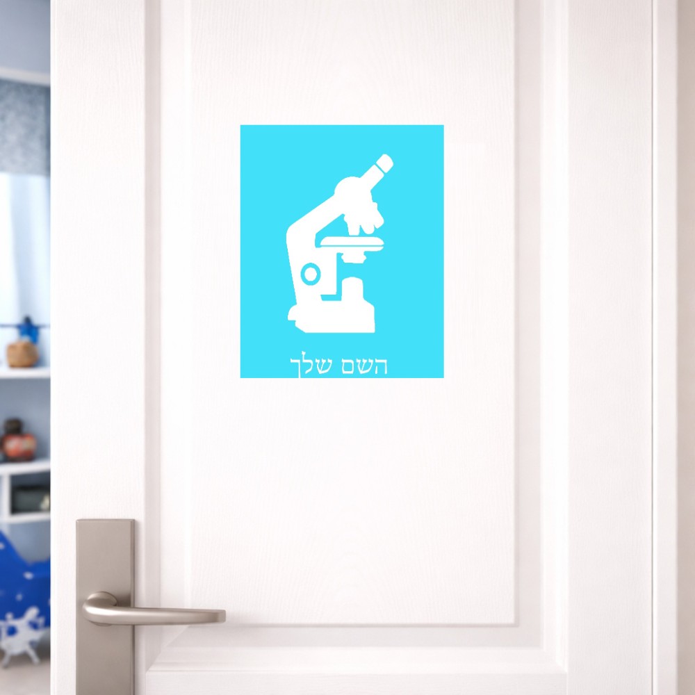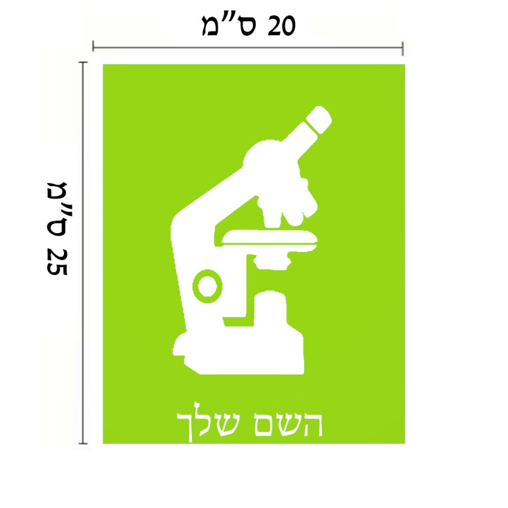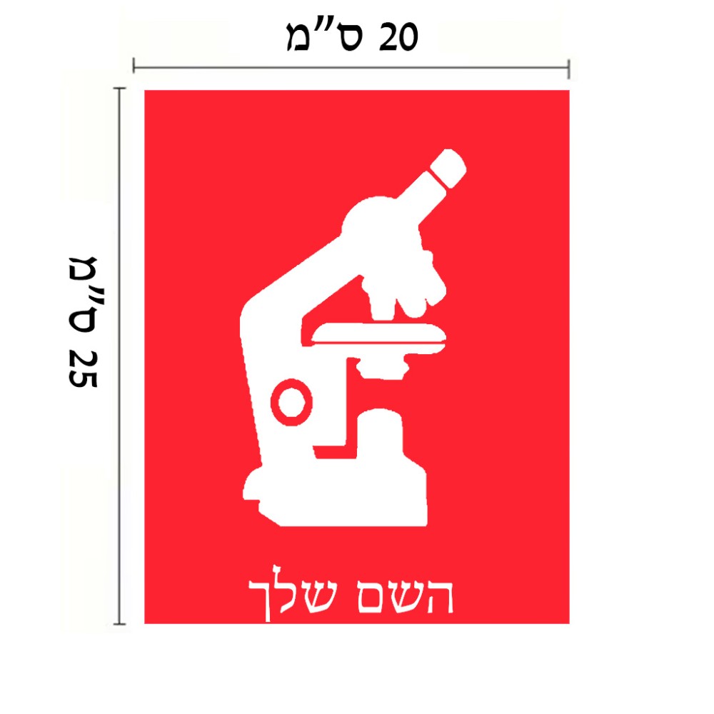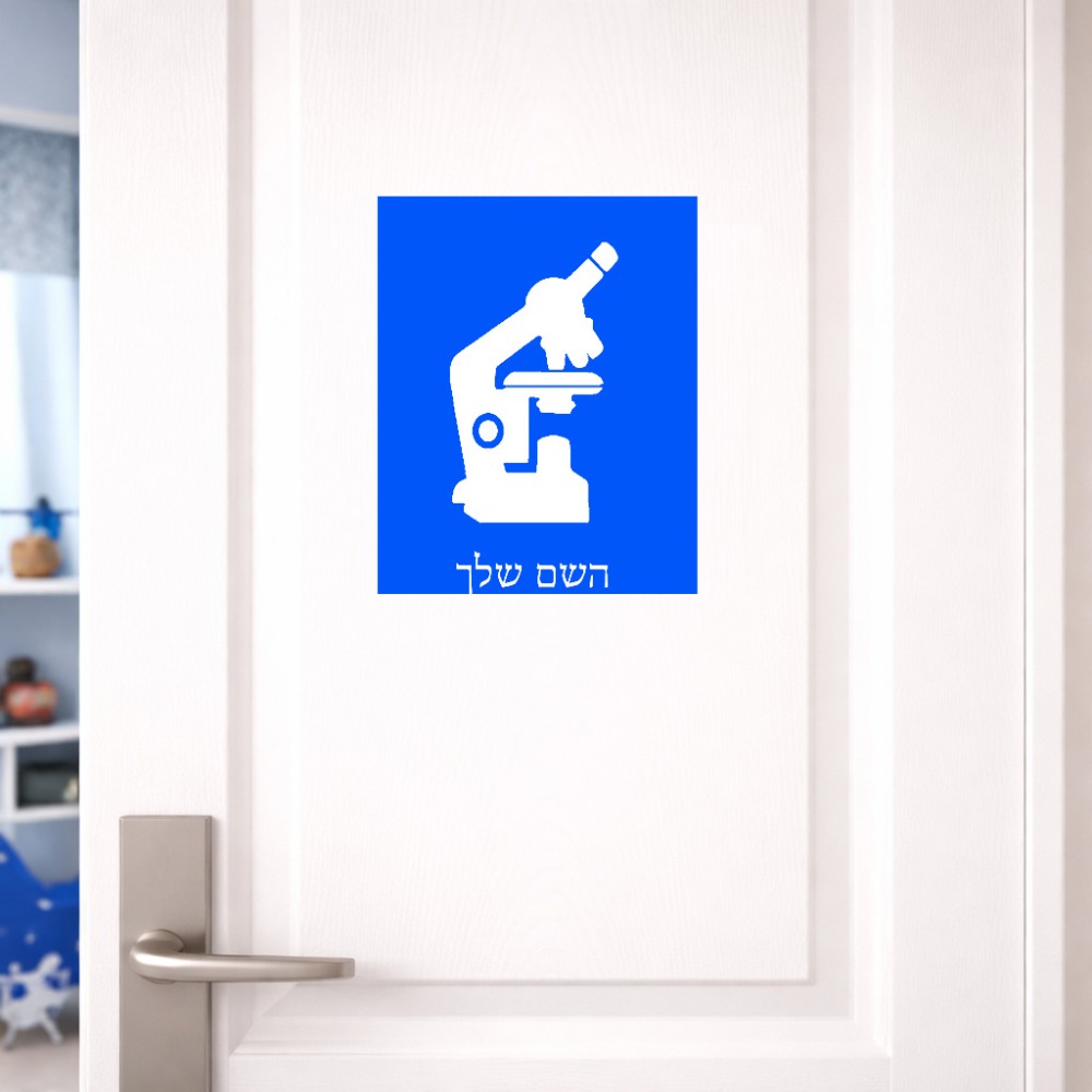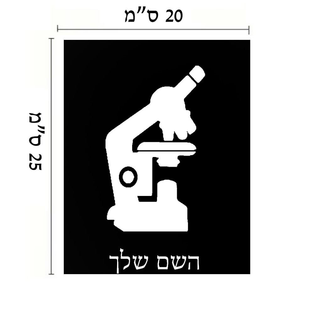 שלט אלומיניום גדול לחדר בעיצוב אישי עם השם שלך בעיצוב מיקרוסקופ גודל השלט 20 × 25 ס"מ. את השם המבוקש ניתן לציין בהזמנה, אם לא צויין אנחנו ניצור קשר לבירור.
