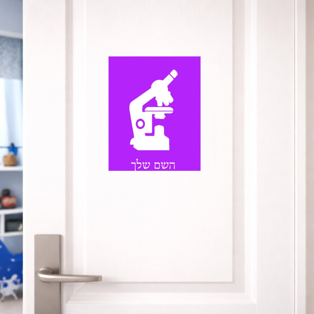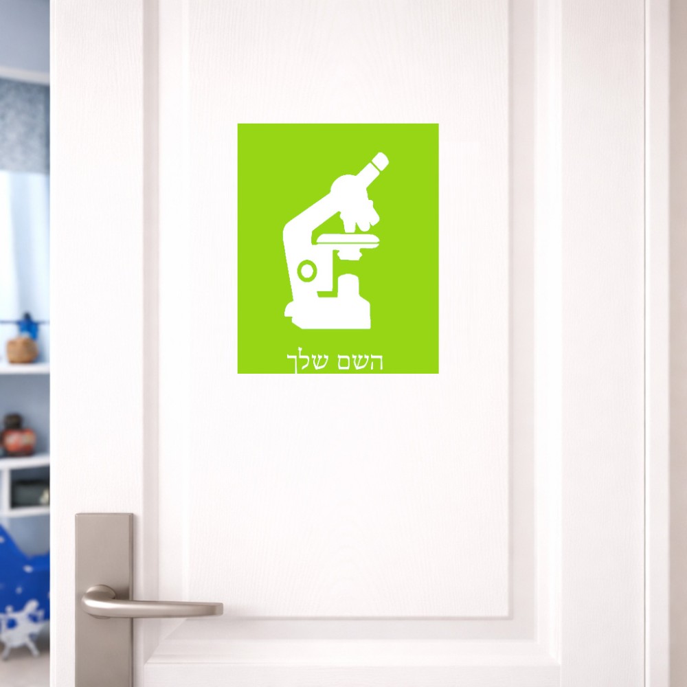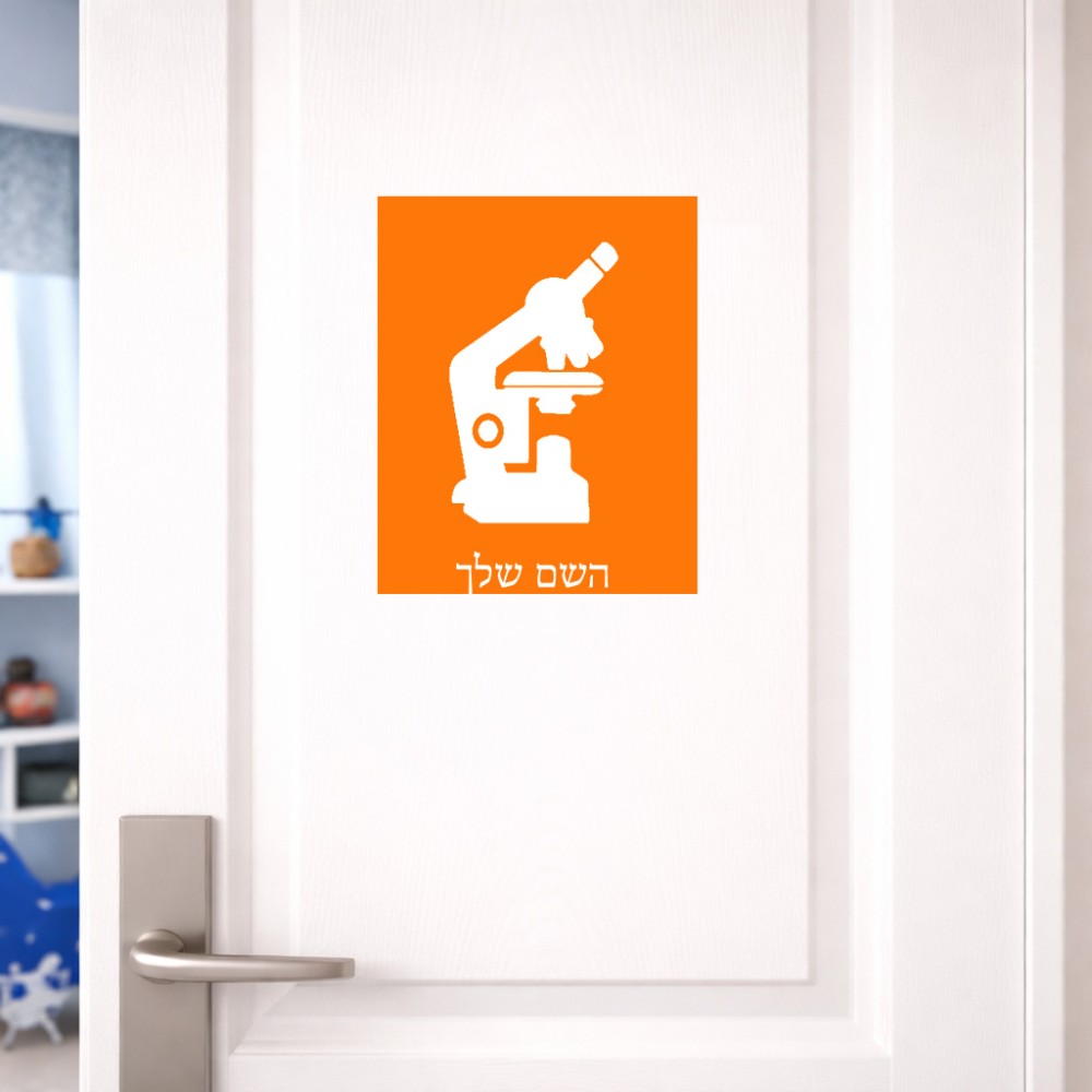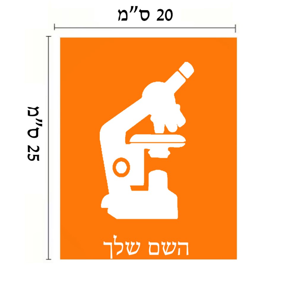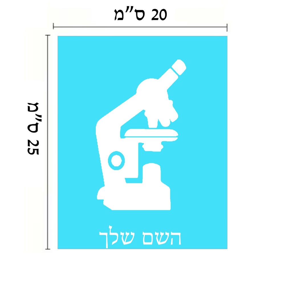 שלט אלומיניום גדול לחדר בעיצוב אישי עם השם שלך בעיצוב מיקרוסקופ גודל השלט 20 × 25 ס"מ. את השם המבוקש ניתן לציין בהזמנה, אם לא צויין אנחנו ניצור קשר לבירור.