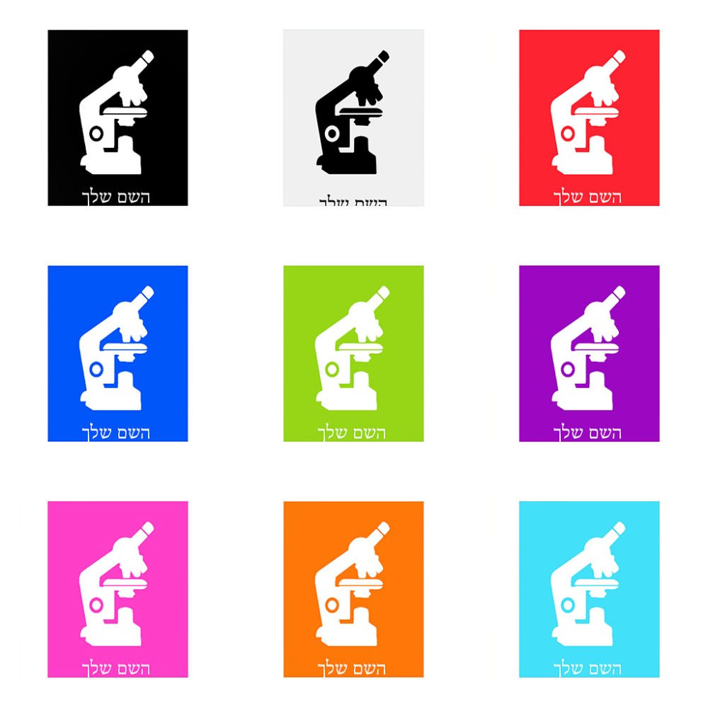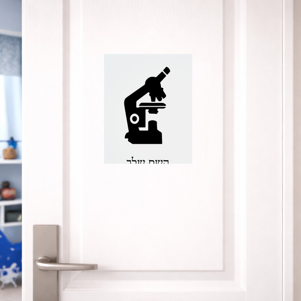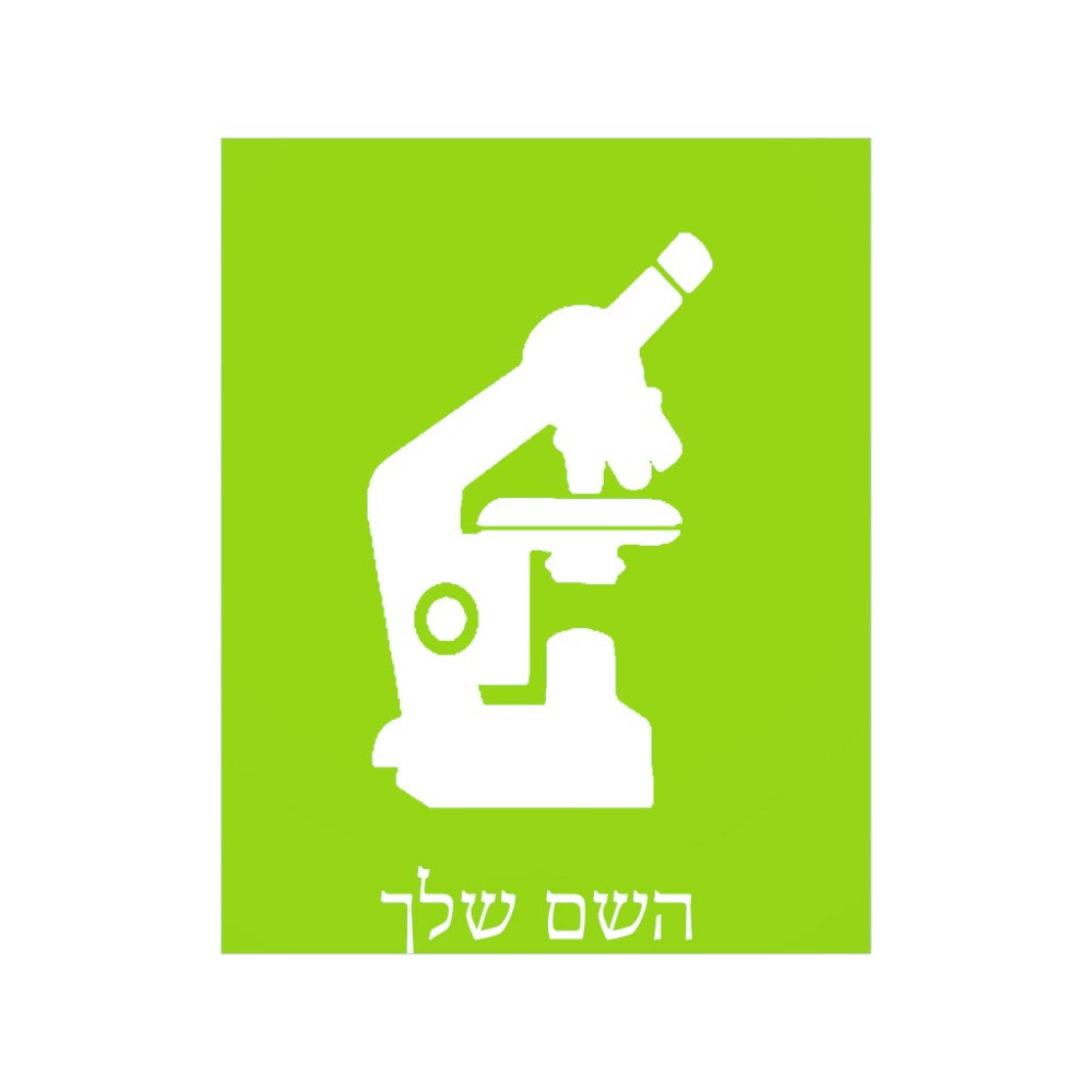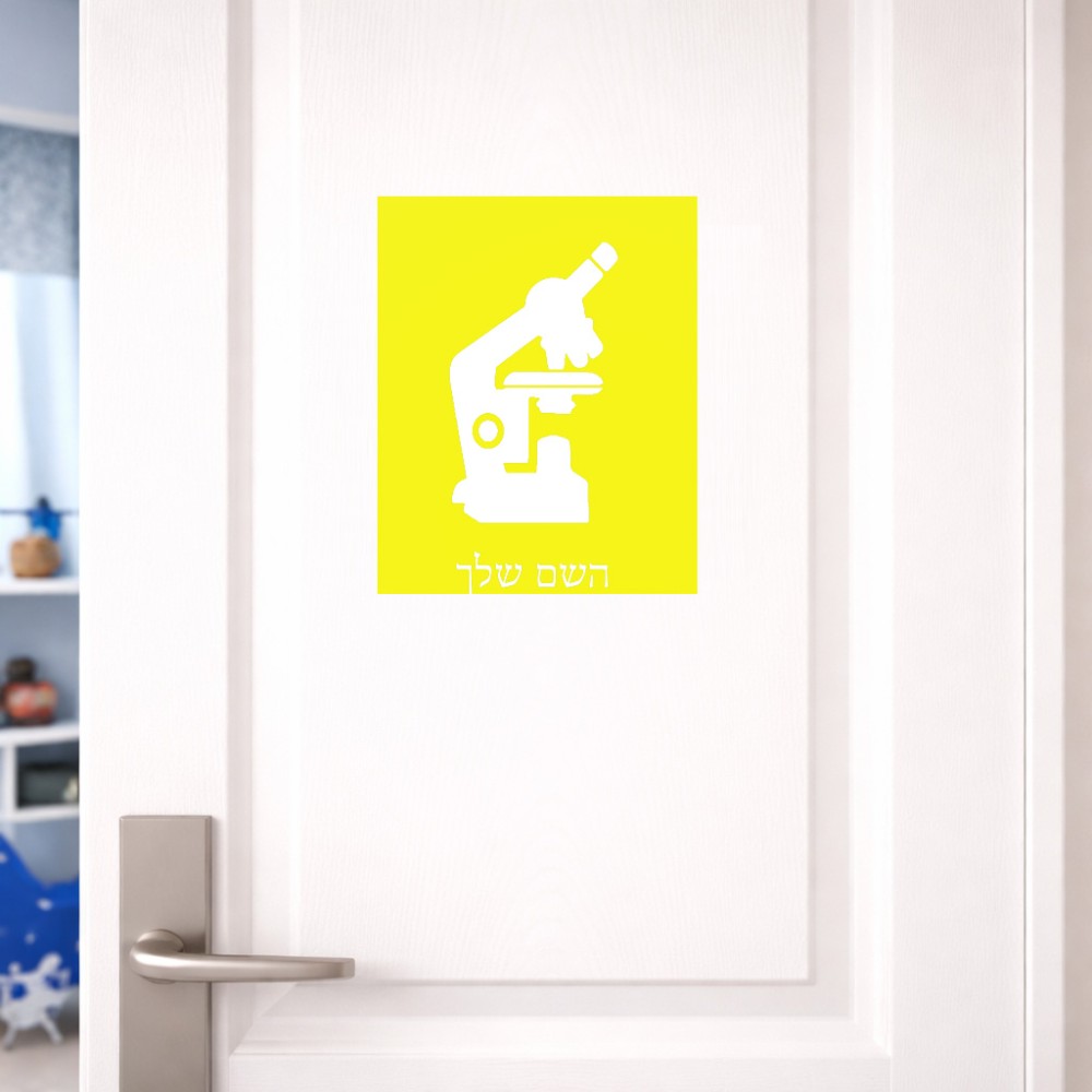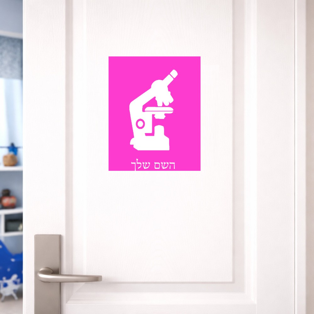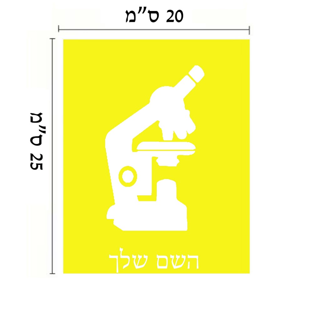 שלט אלומיניום גדול לחדר בעיצוב אישי עם השם שלך בעיצוב מיקרוסקופ גודל השלט 20 × 25 ס"מ. את השם המבוקש ניתן לציין בהזמנה, אם לא צויין אנחנו ניצור קשר לבירור.