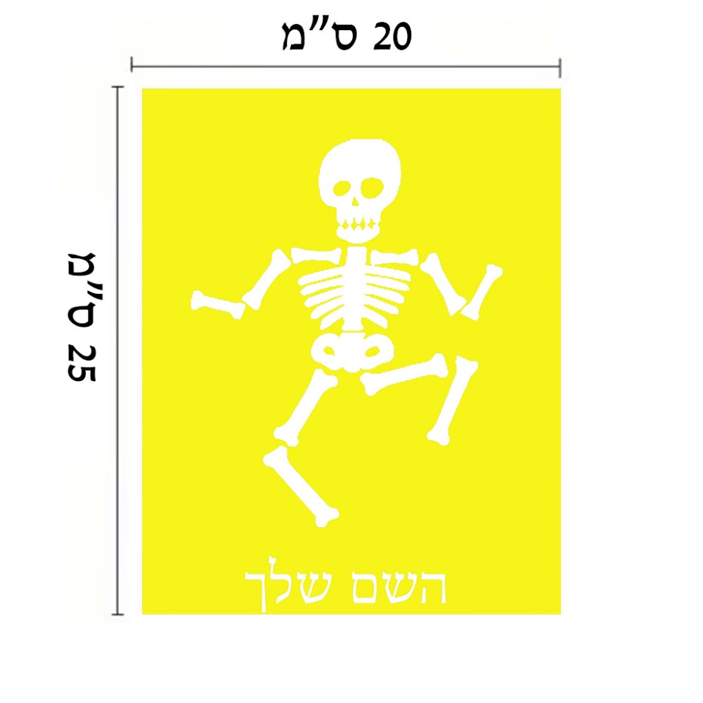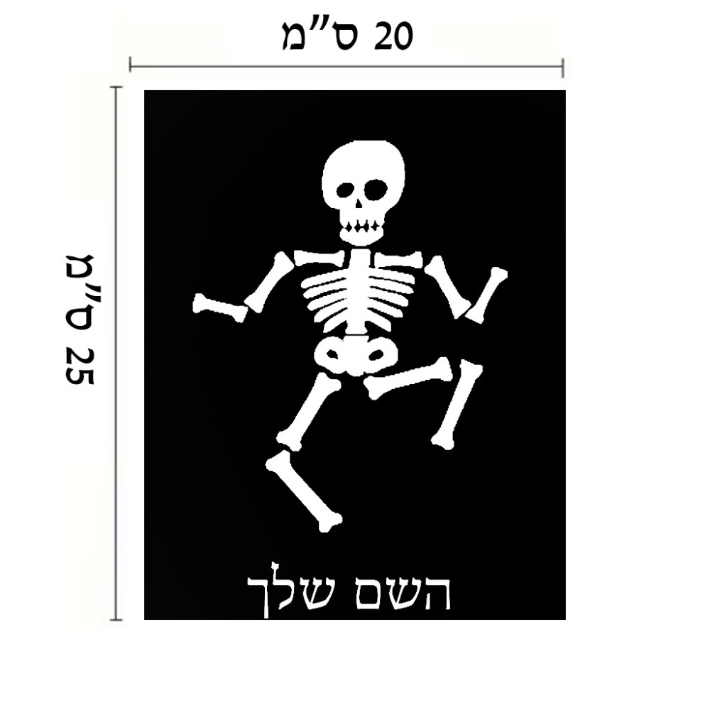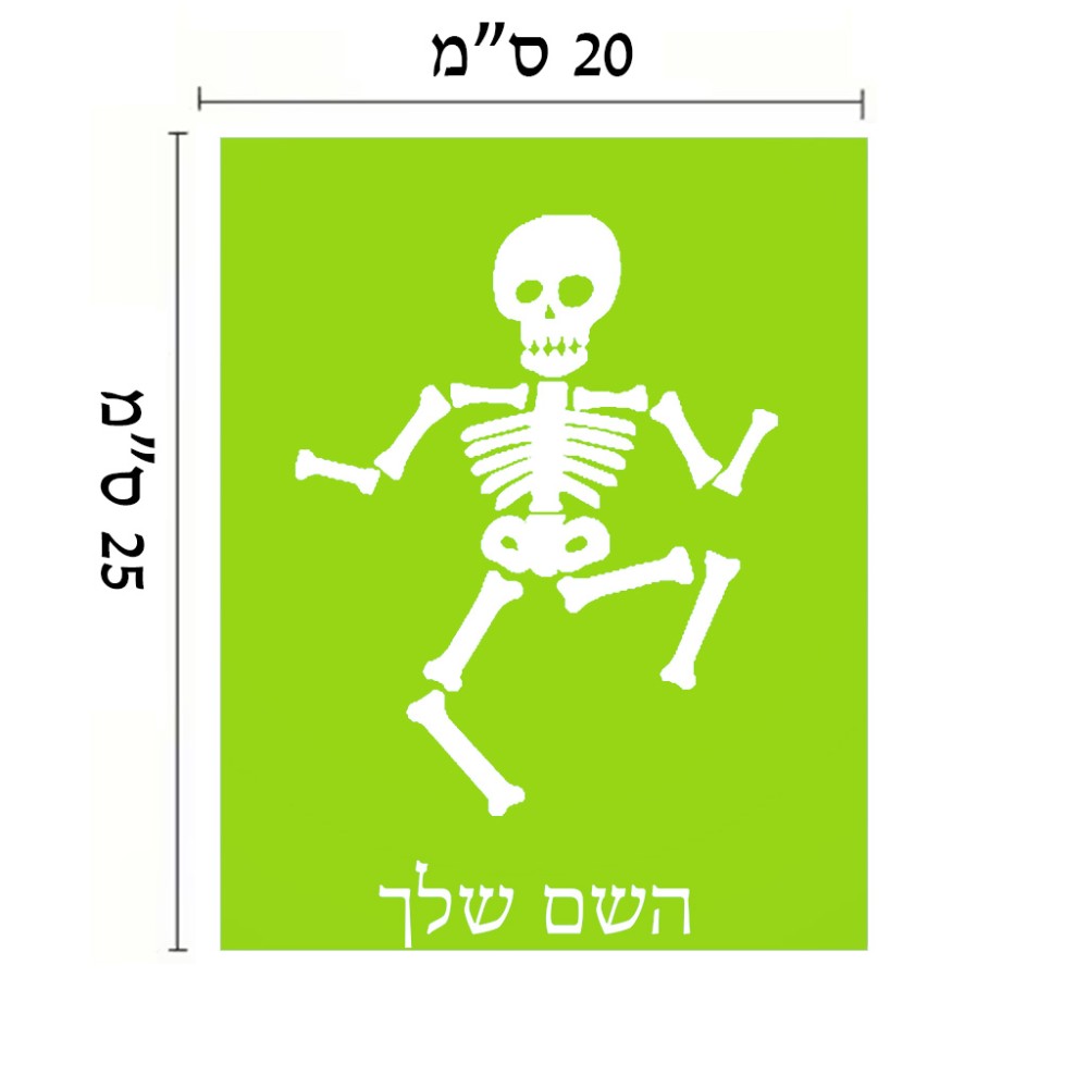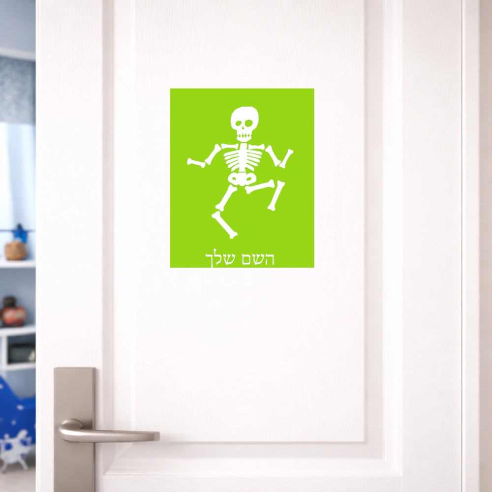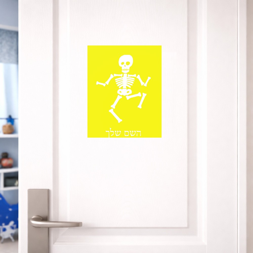 שלט אלומיניום גדול לחדר בעיצוב אישי עם השם שלך בעיצוב סקלטון גודל השלט 20 × 25 ס"מ. את השם המבוקש ניתן לציין בהזמנה, אם לא צויין אנחנו ניצור קשר לבירור.