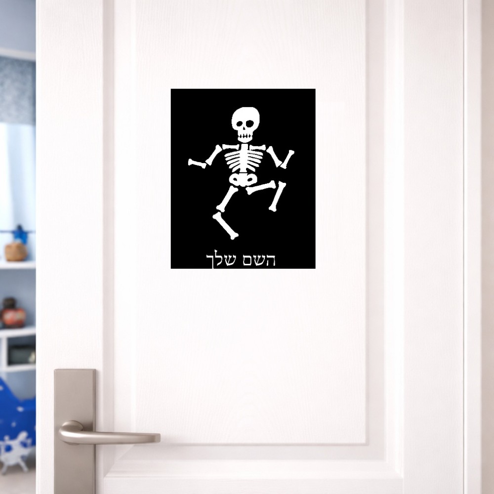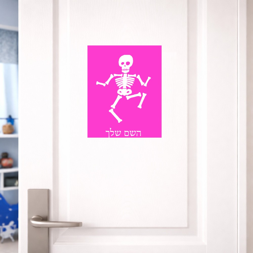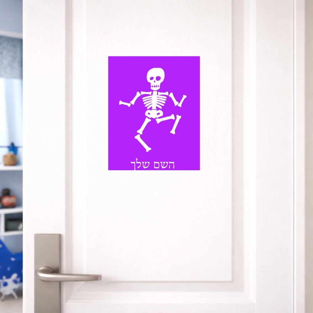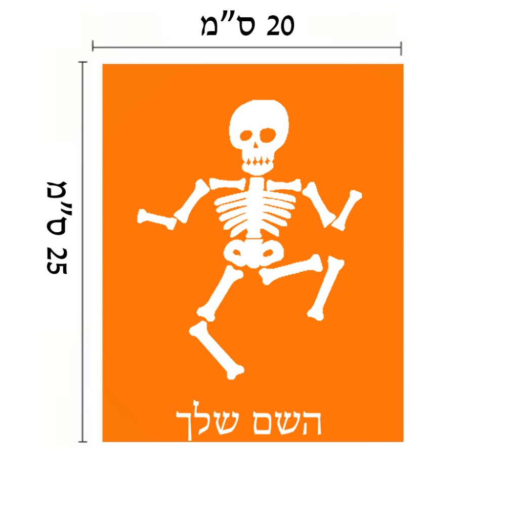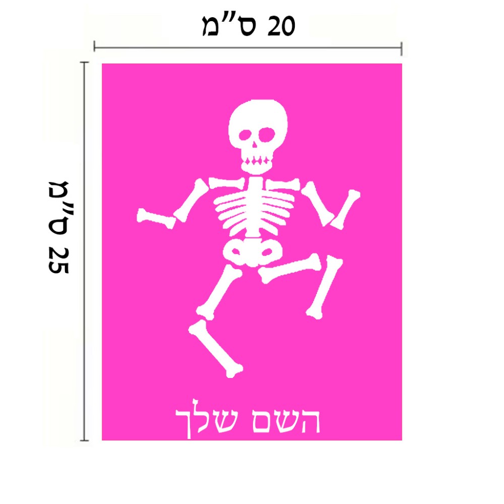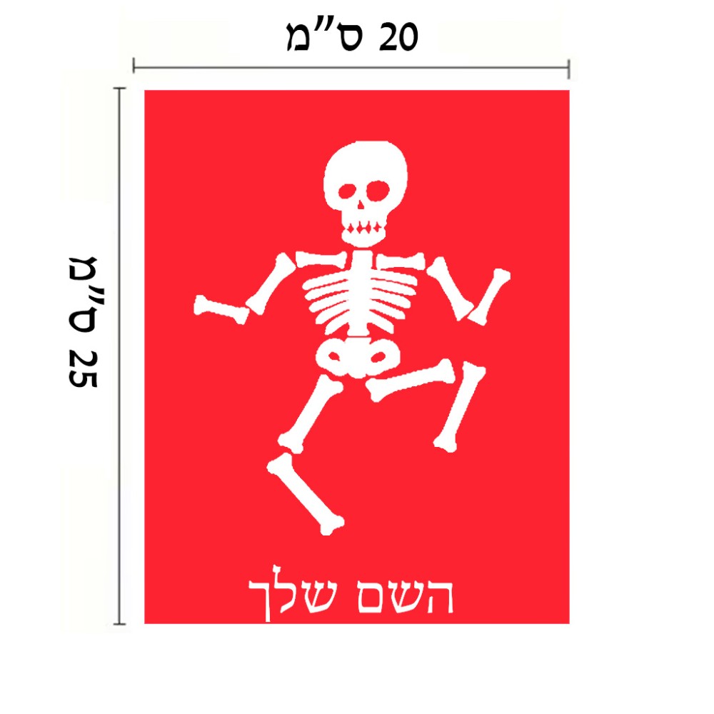 שלט אלומיניום גדול לחדר בעיצוב אישי עם השם שלך בעיצוב סקלטון גודל השלט 20 × 25 ס"מ. את השם המבוקש ניתן לציין בהזמנה, אם לא צויין אנחנו ניצור קשר לבירור.