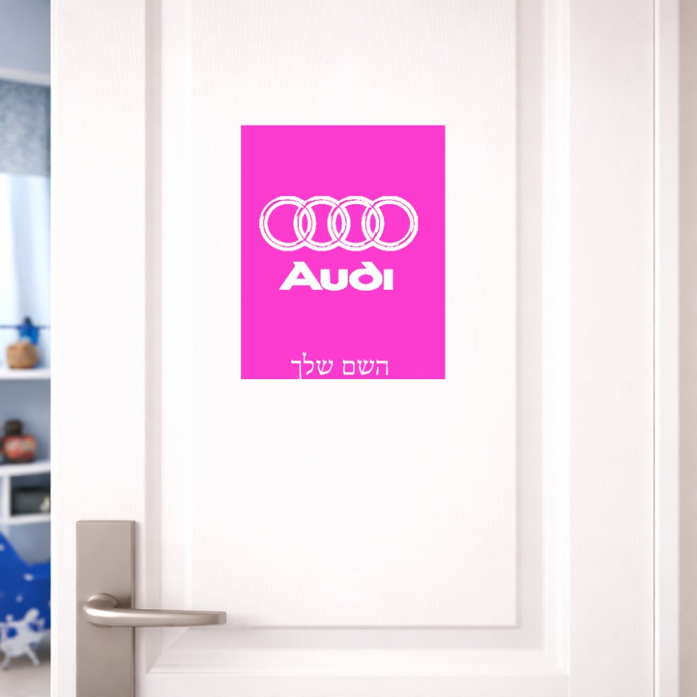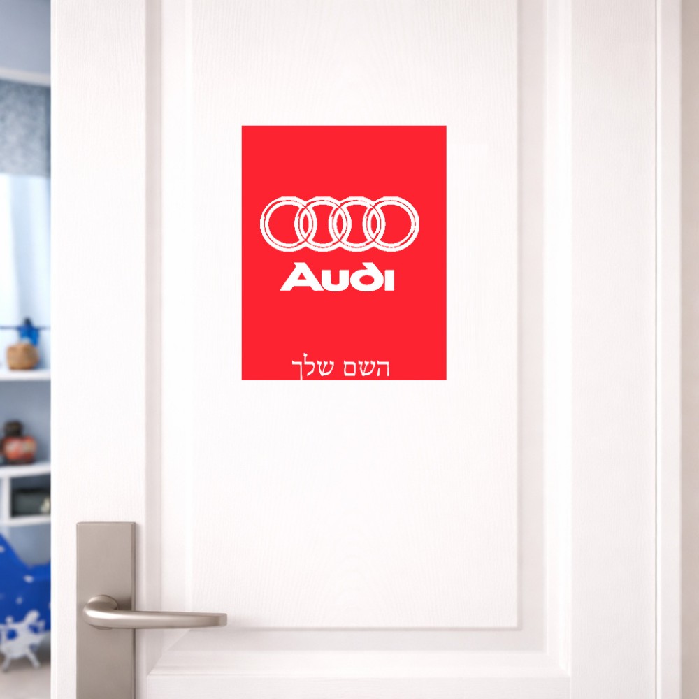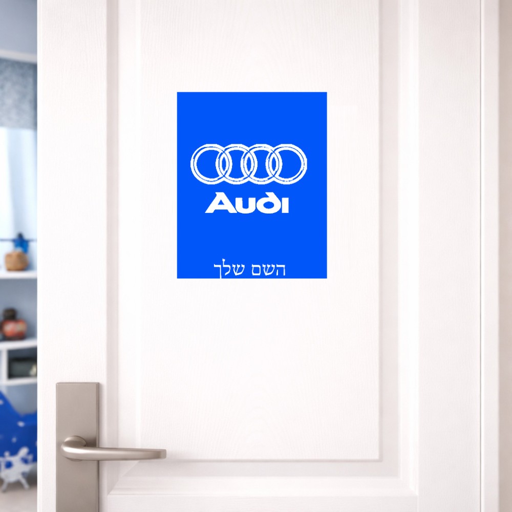 שלט אלומיניום גדול לחדר בעיצוב אישי עם השם שלך בעיצוב אאודי גודל השלט 20 × 25 ס"מ.