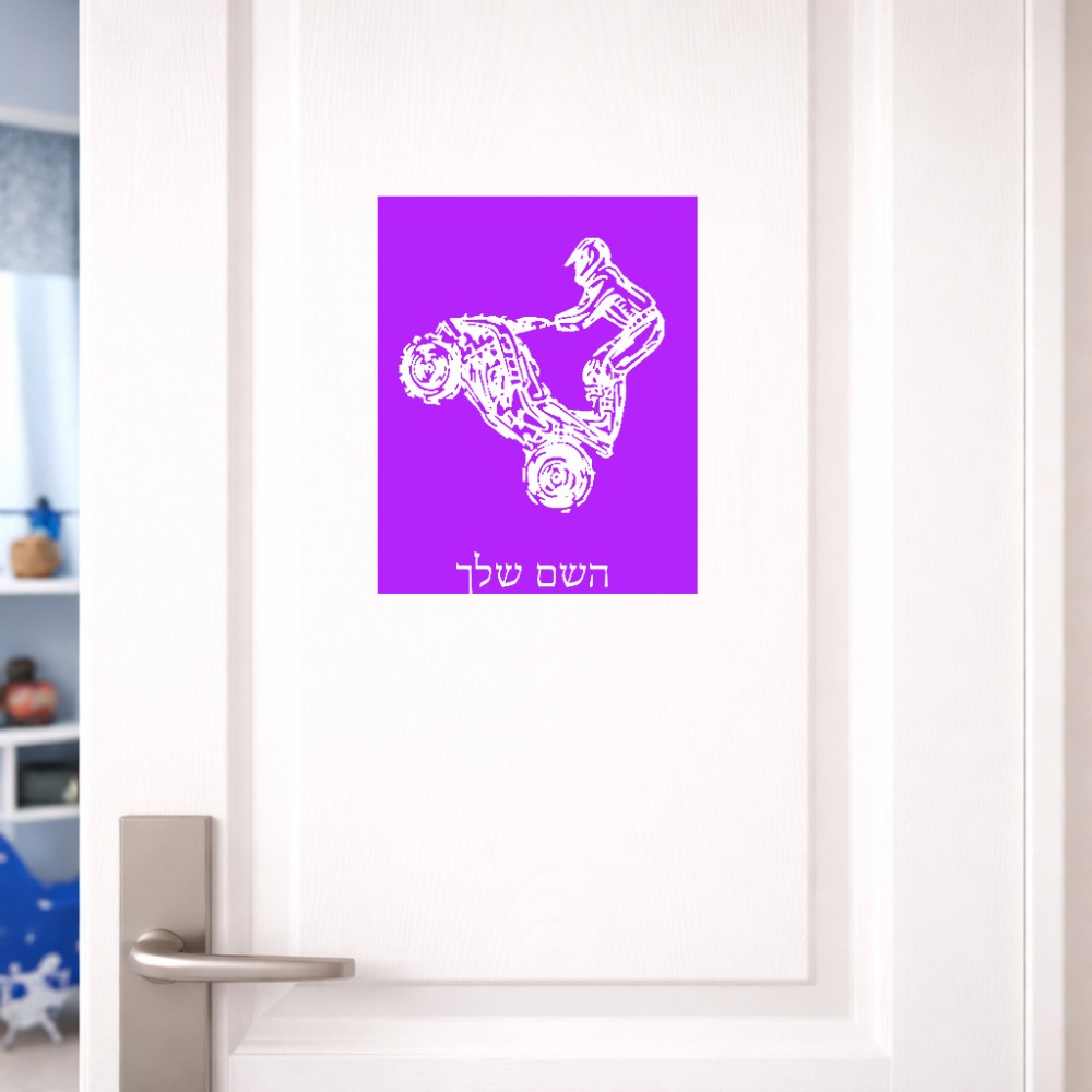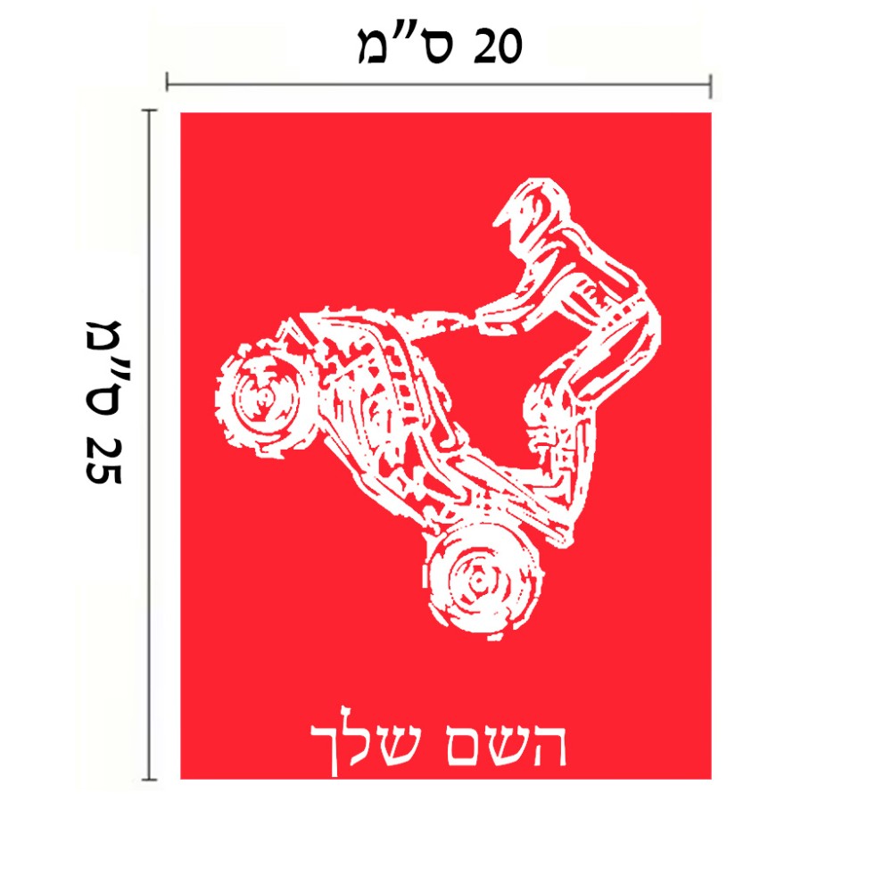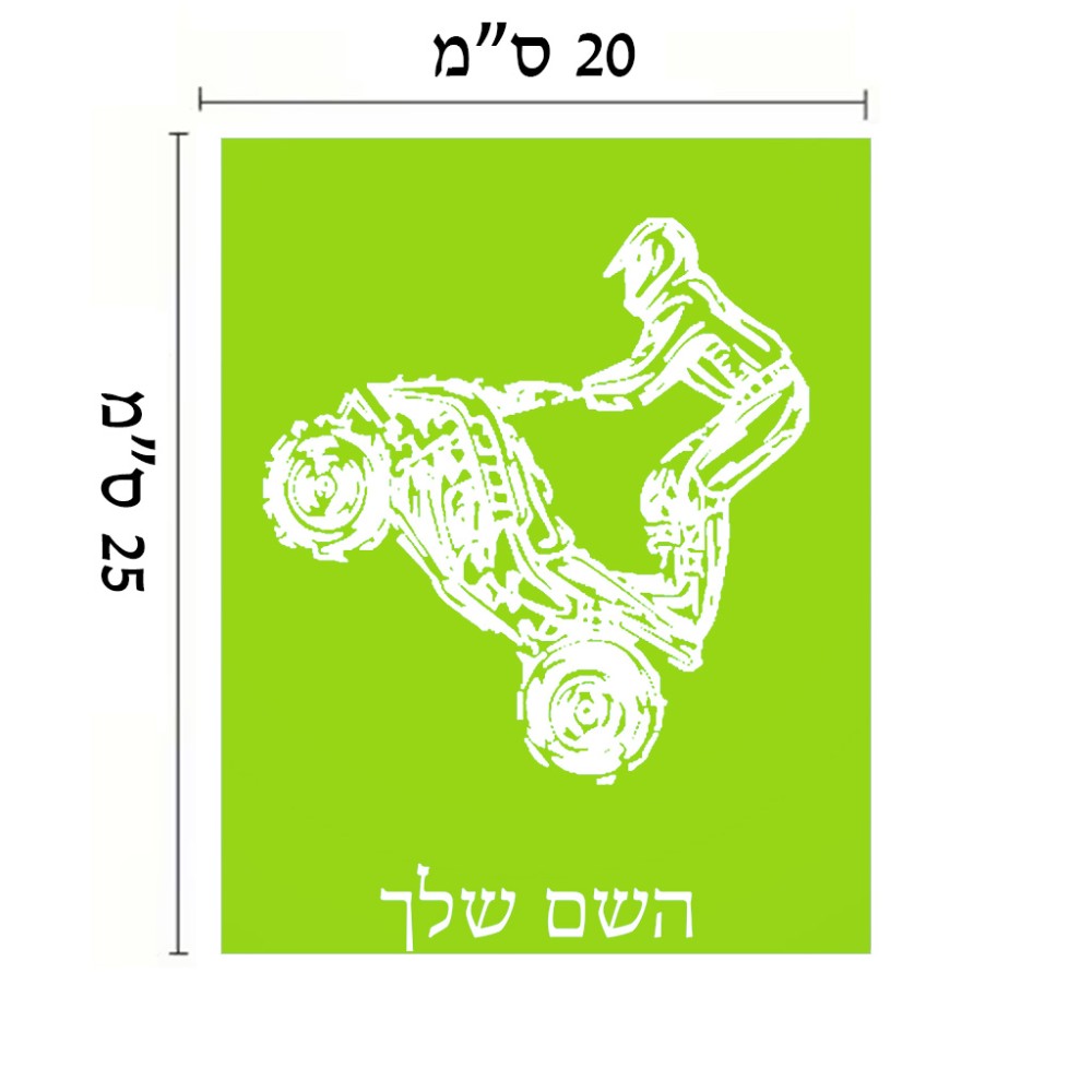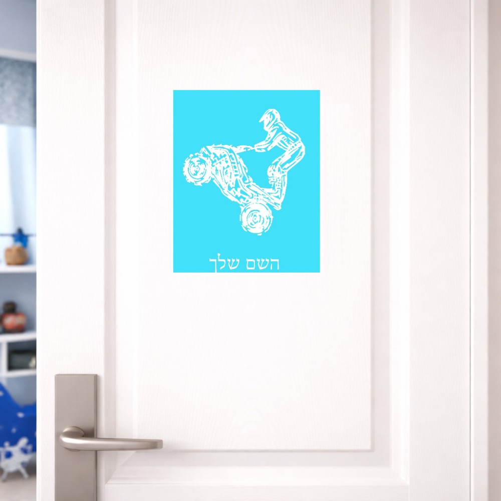 שלט אלומיניום גדול לחדר בעיצוב אישי עם השם שלך בעיצוב רוכב טרקטורונים גודל השלט 20 × 25 ס"מ. את השם המבוקש ניתן לציין בהזמנה, אם לא צויין אנחנו ניצור קשר לבירור.
