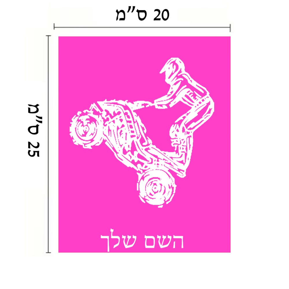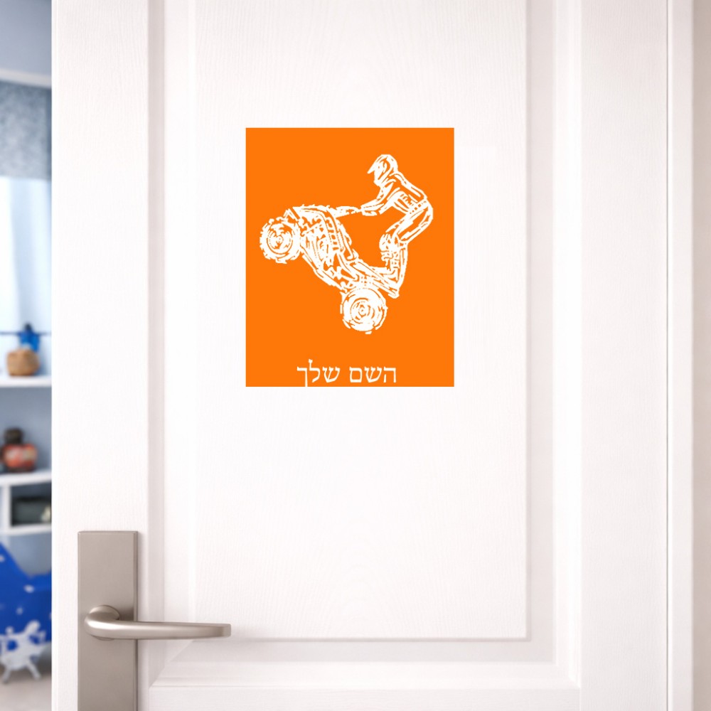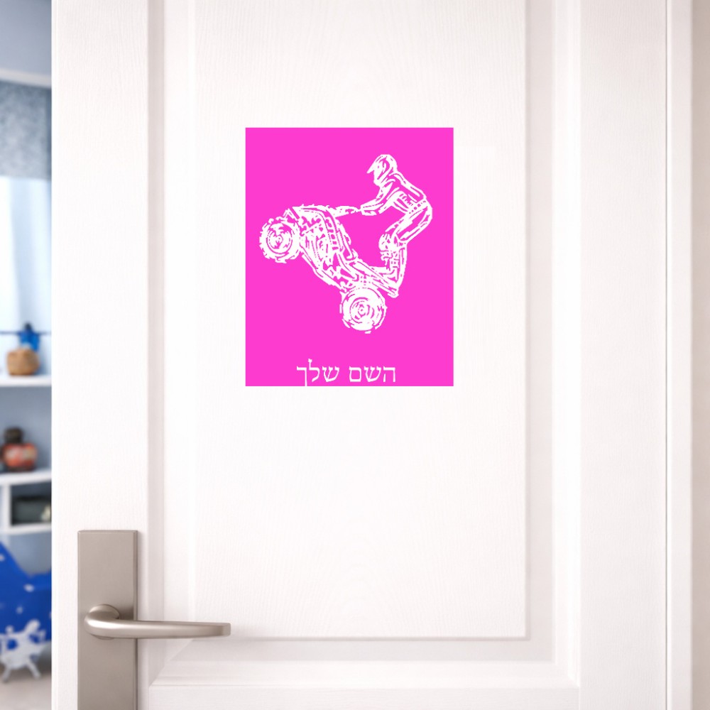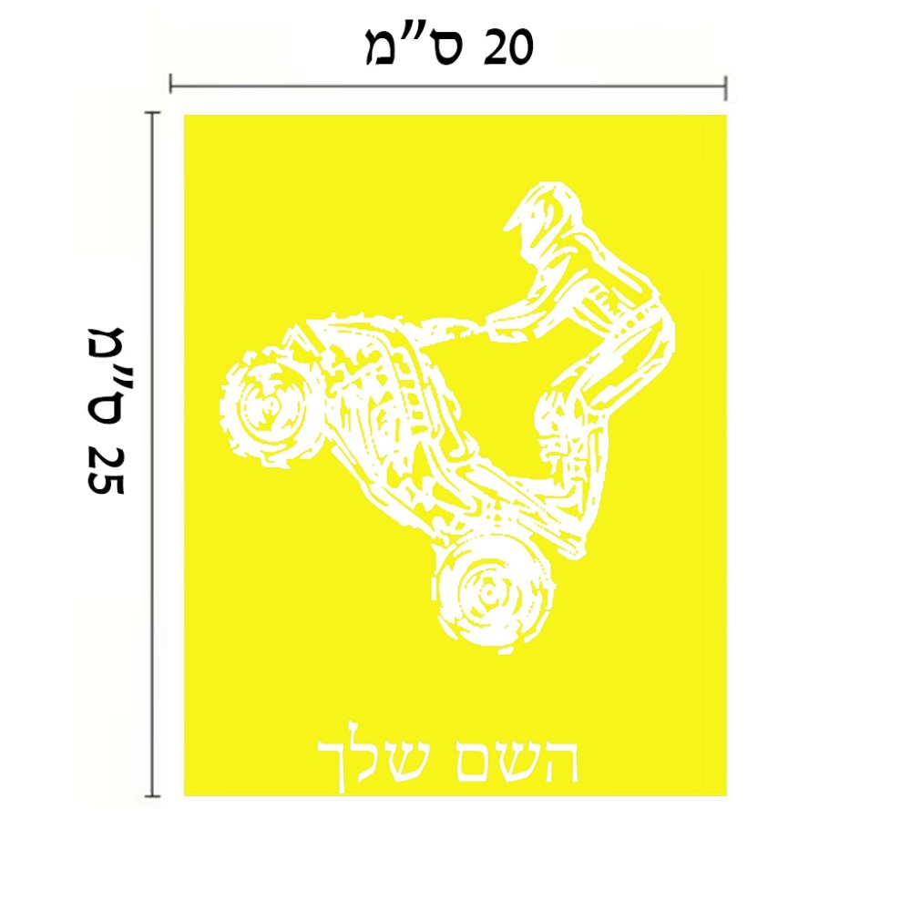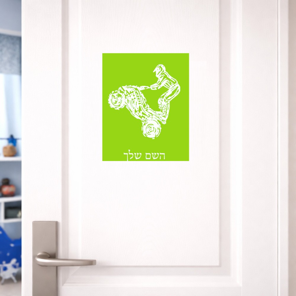 שלט אלומיניום גדול לחדר בעיצוב אישי עם השם שלך בעיצוב רוכב טרקטורונים גודל השלט 20 × 25 ס"מ. את השם המבוקש ניתן לציין בהזמנה, אם לא צויין אנחנו ניצור קשר לבירור.