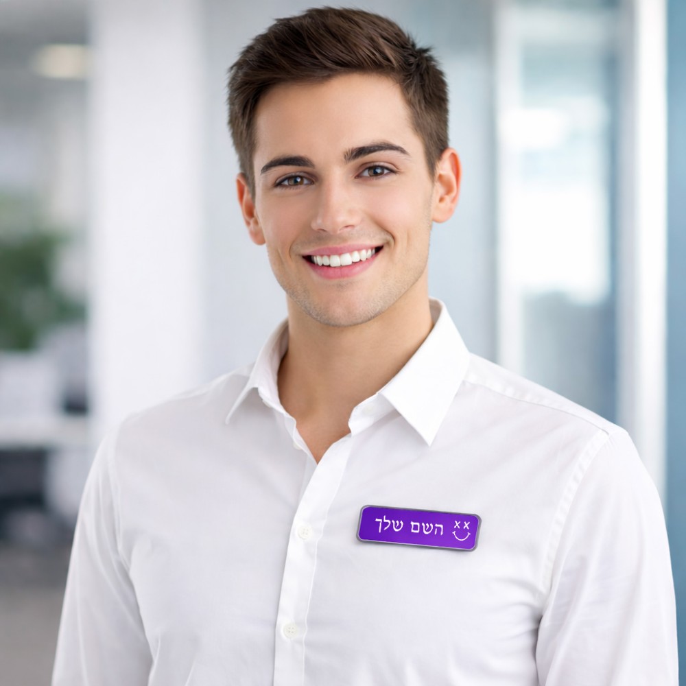 תג שם \ תוויות שם בעיצוב אישי עם השם שלך בעיצוב סמיילי גודל התג 7.5 × 2.5 ס"מ. את השם המבוקש ניתן לציין בהזמנה, אם לא צויין אנחנו ניצור קשר לבירור.