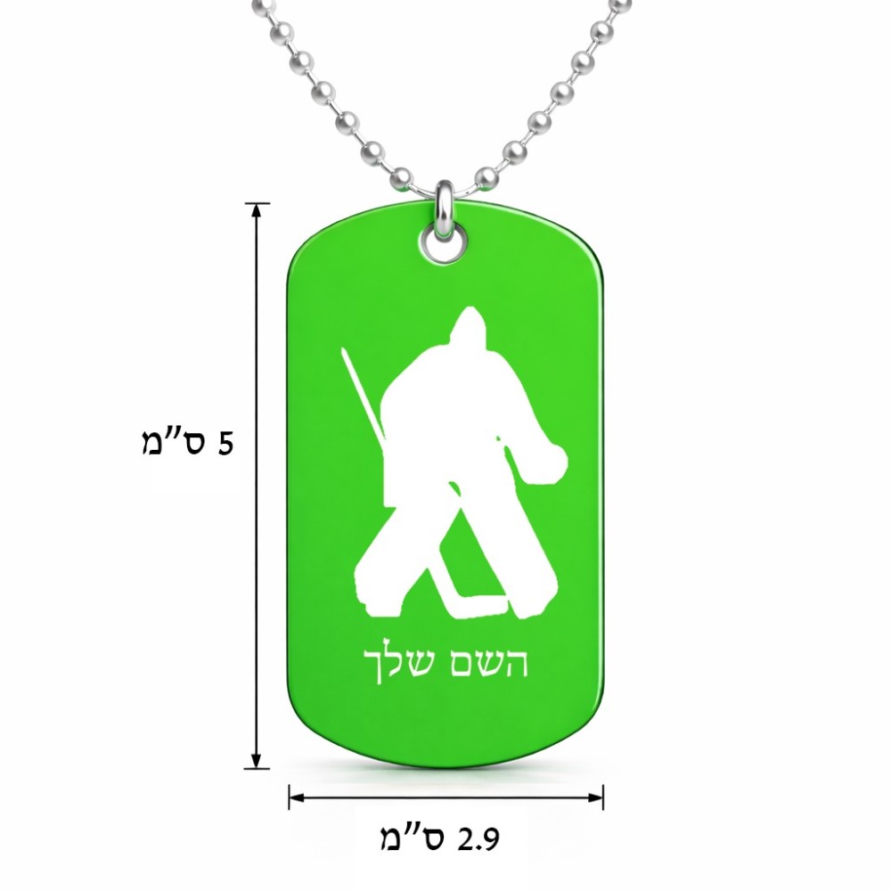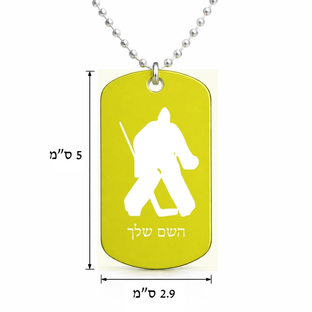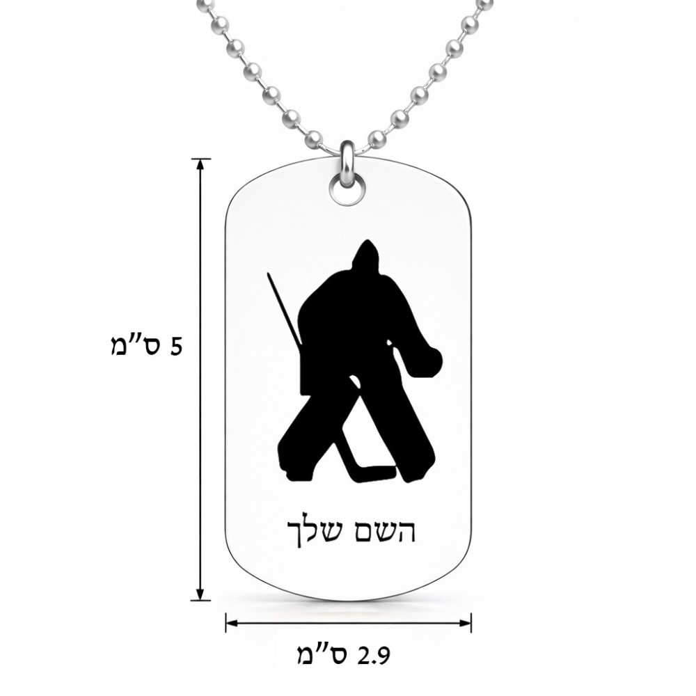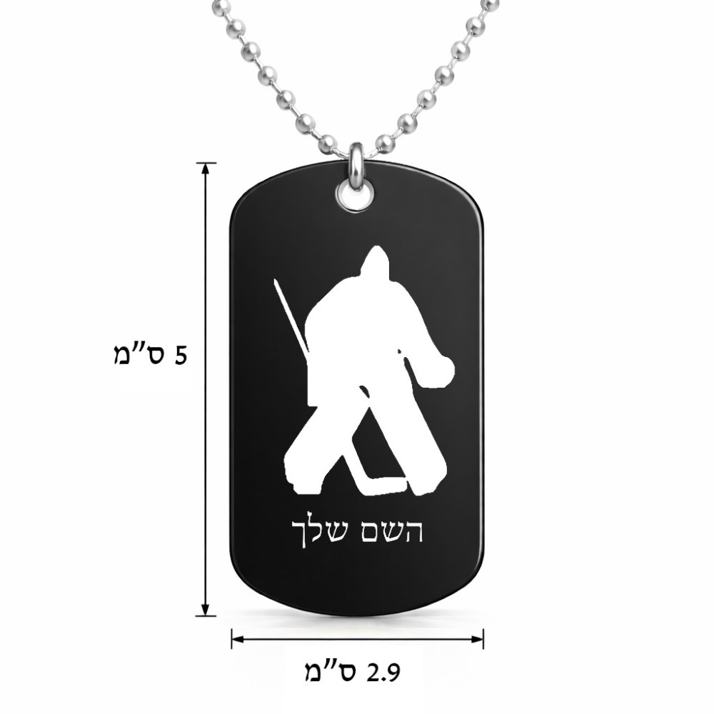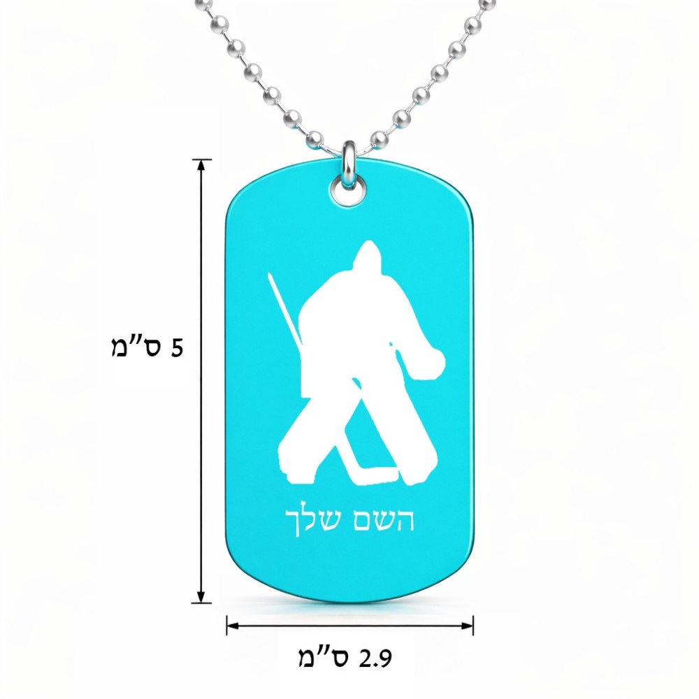 שרשרת דיסקיט מאלומיניום בעיצוב אישי עם השם שלך בעיצוב הוקי שוערים גודל הדיסקיט 2.9 × 5 ס"מ. את השם המבוקש ניתן לציין בהזמנה, אם לא צויין אנחנו ניצור קשר לבירור.