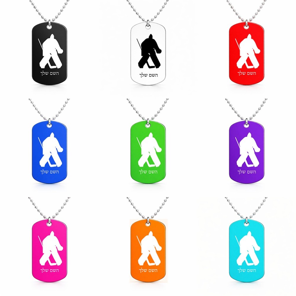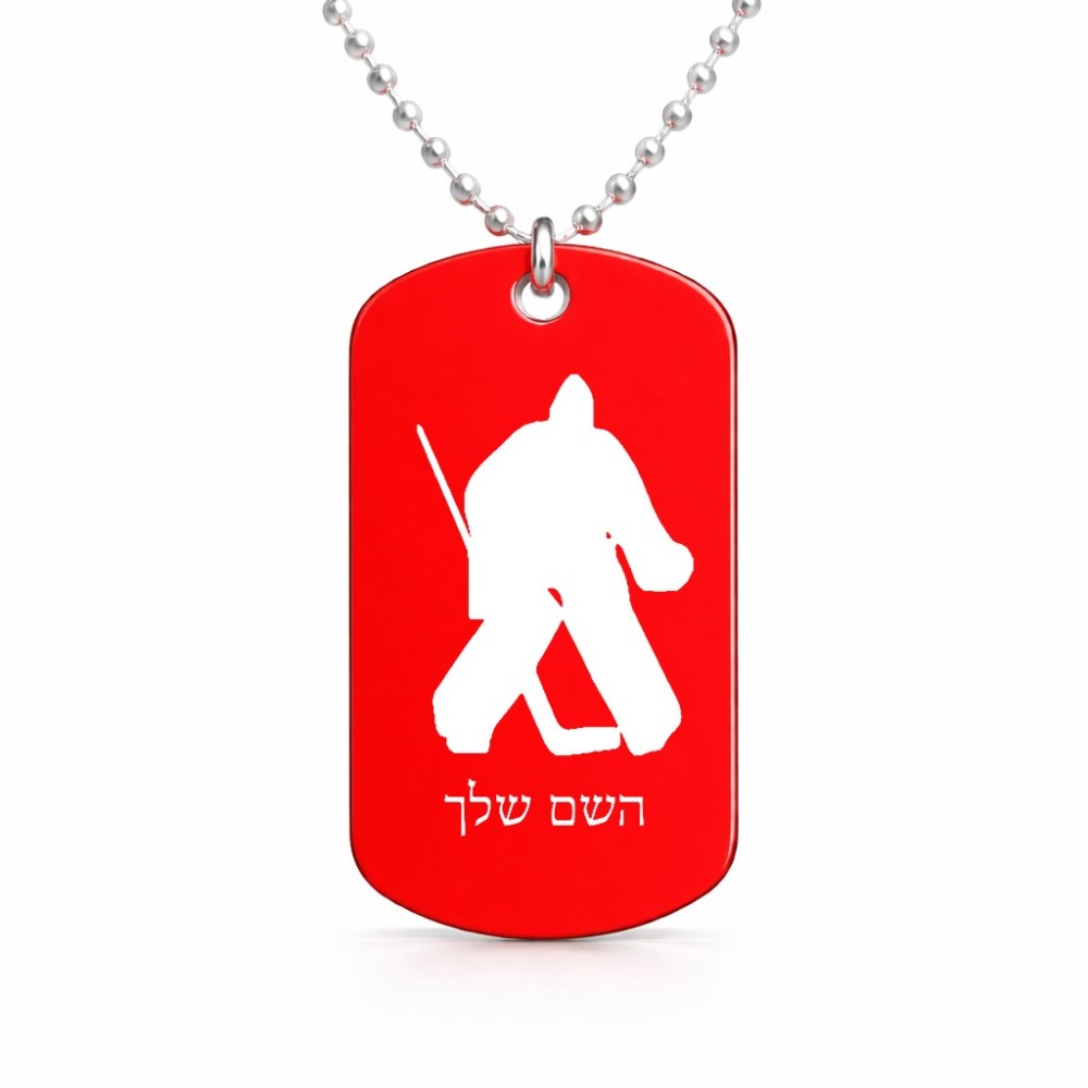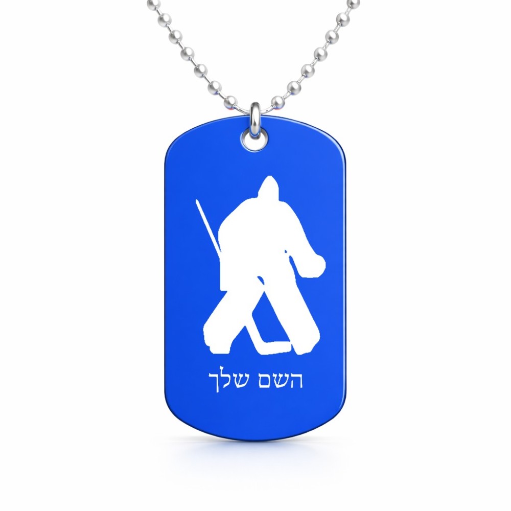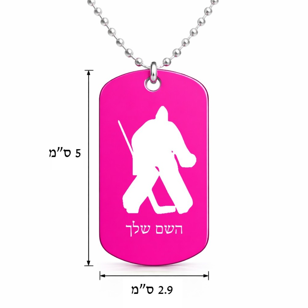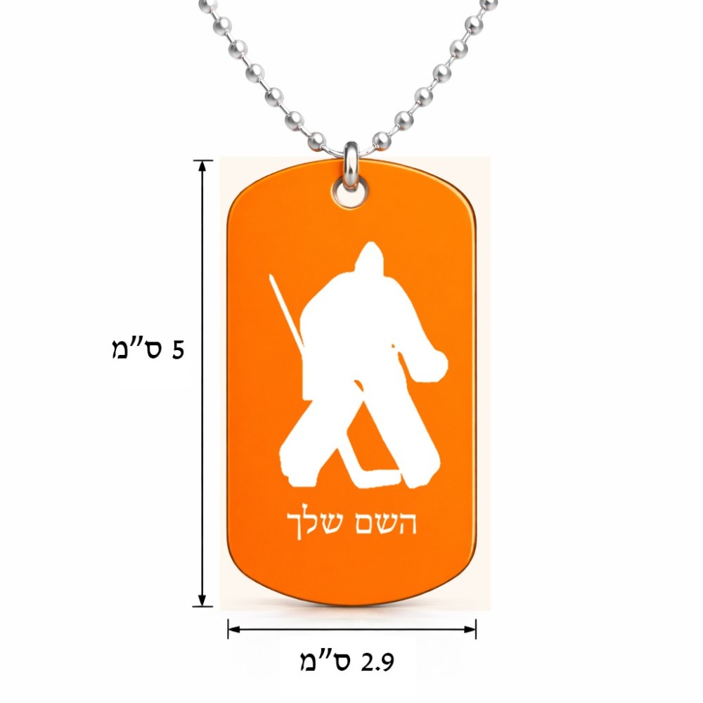 שרשרת דיסקיט מאלומיניום בעיצוב אישי עם השם שלך בעיצוב הוקי שוערים גודל הדיסקיט 2.9 × 5 ס"מ. את השם המבוקש ניתן לציין בהזמנה, אם לא צויין אנחנו ניצור קשר לבירור.