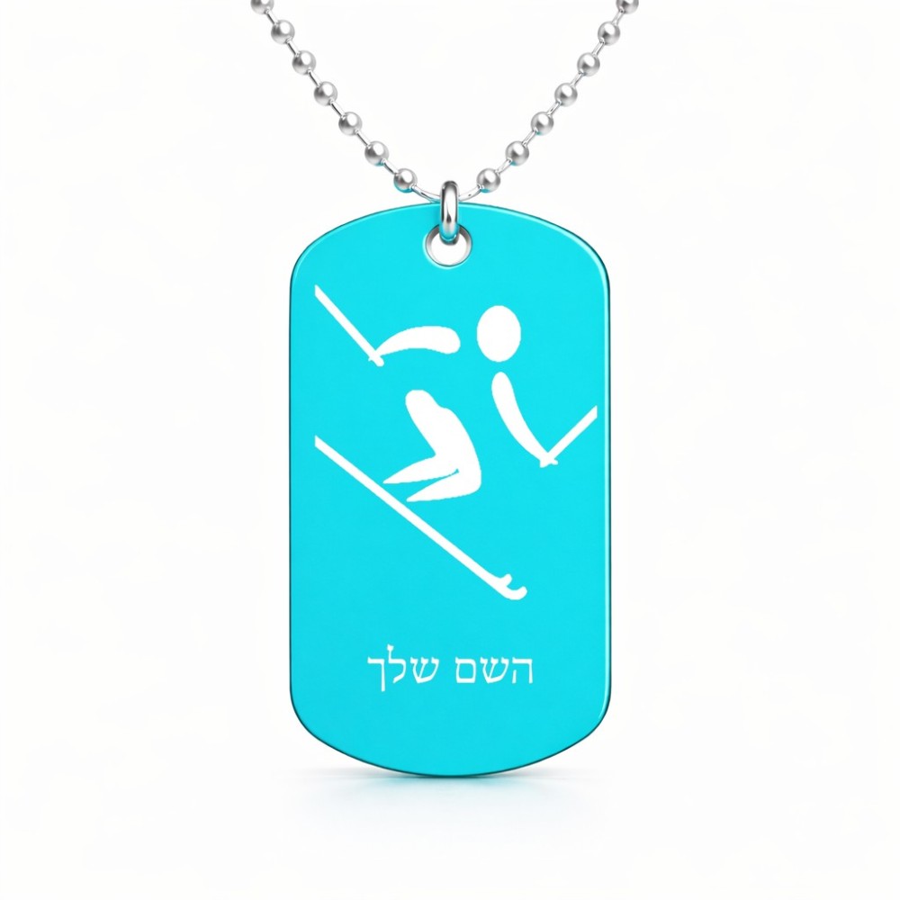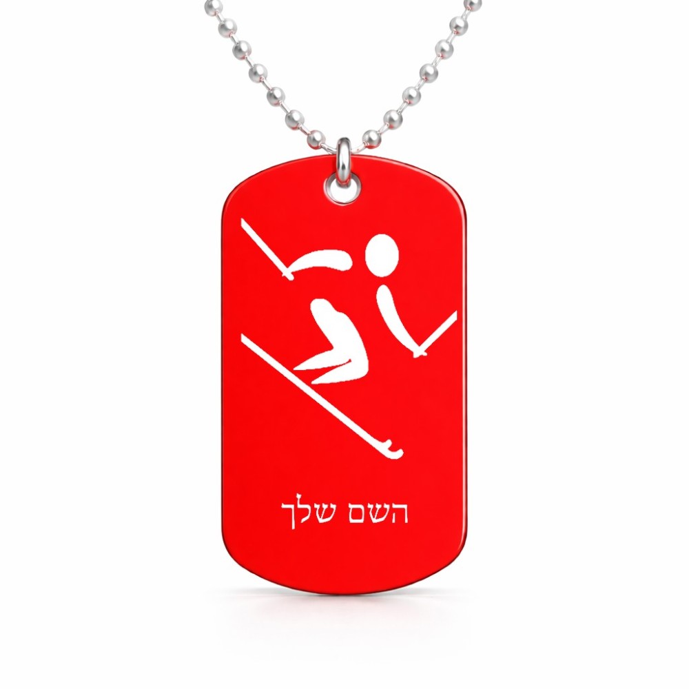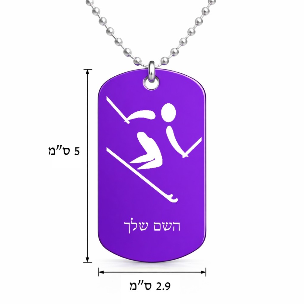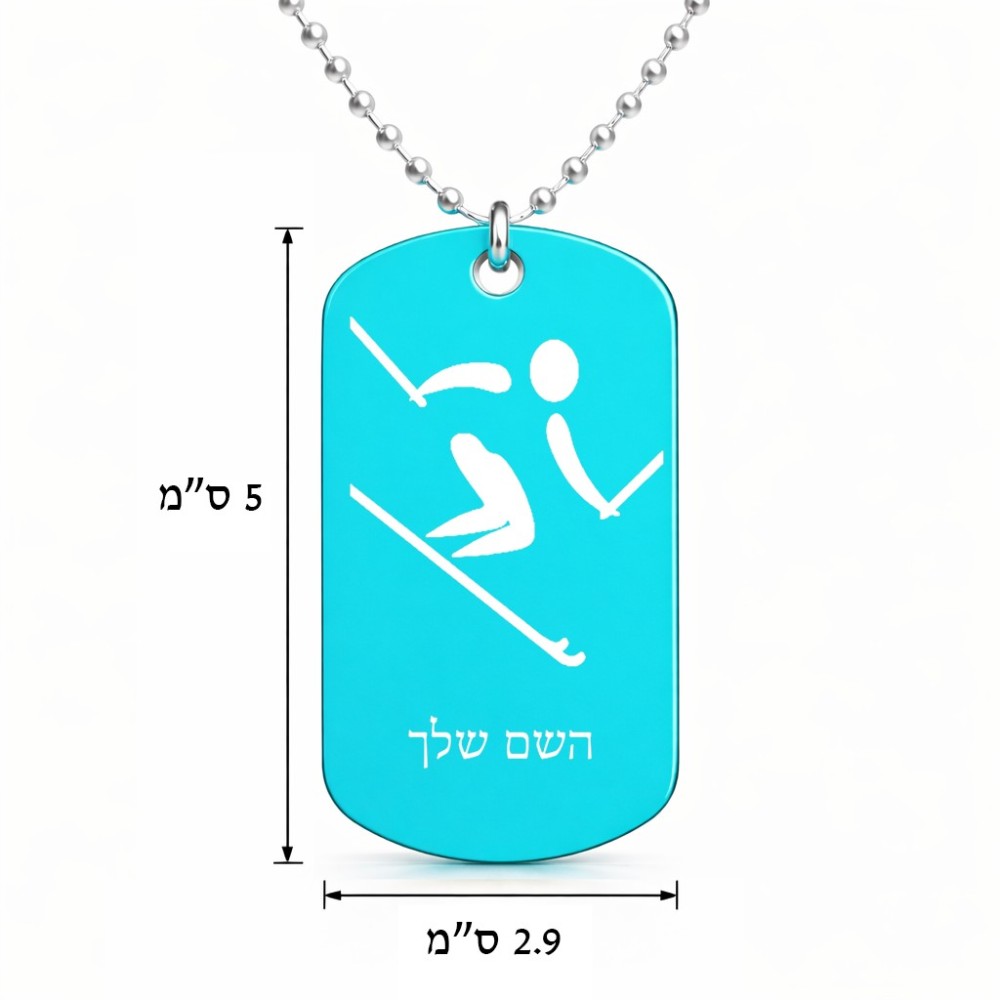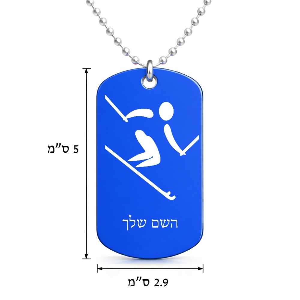 שרשרת דיסקיט מאלומיניום בעיצוב אישי עם השם שלך בעיצוב סקי אולימפי גודל הדיסקיט 2.9 × 5 ס"מ. את השם המבוקש ניתן לציין בהזמנה, אם לא צויין אנחנו ניצור קשר לבירור.