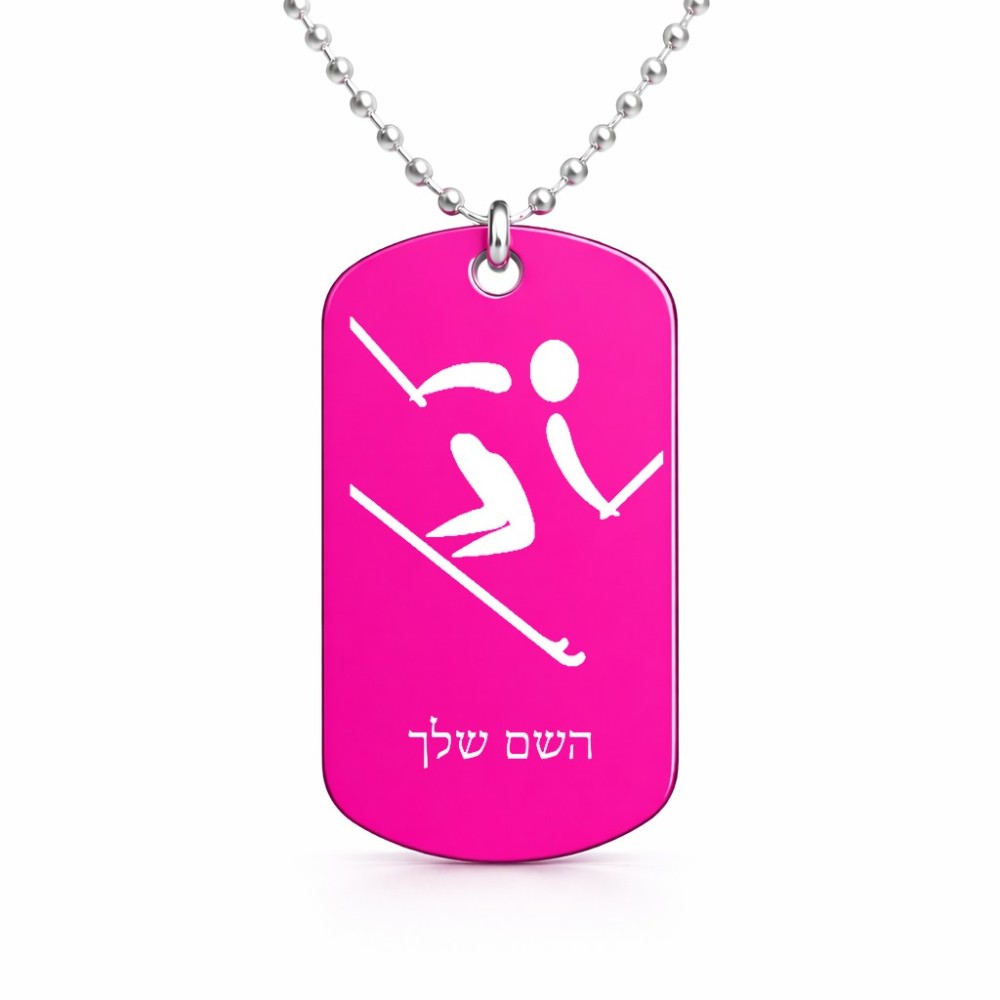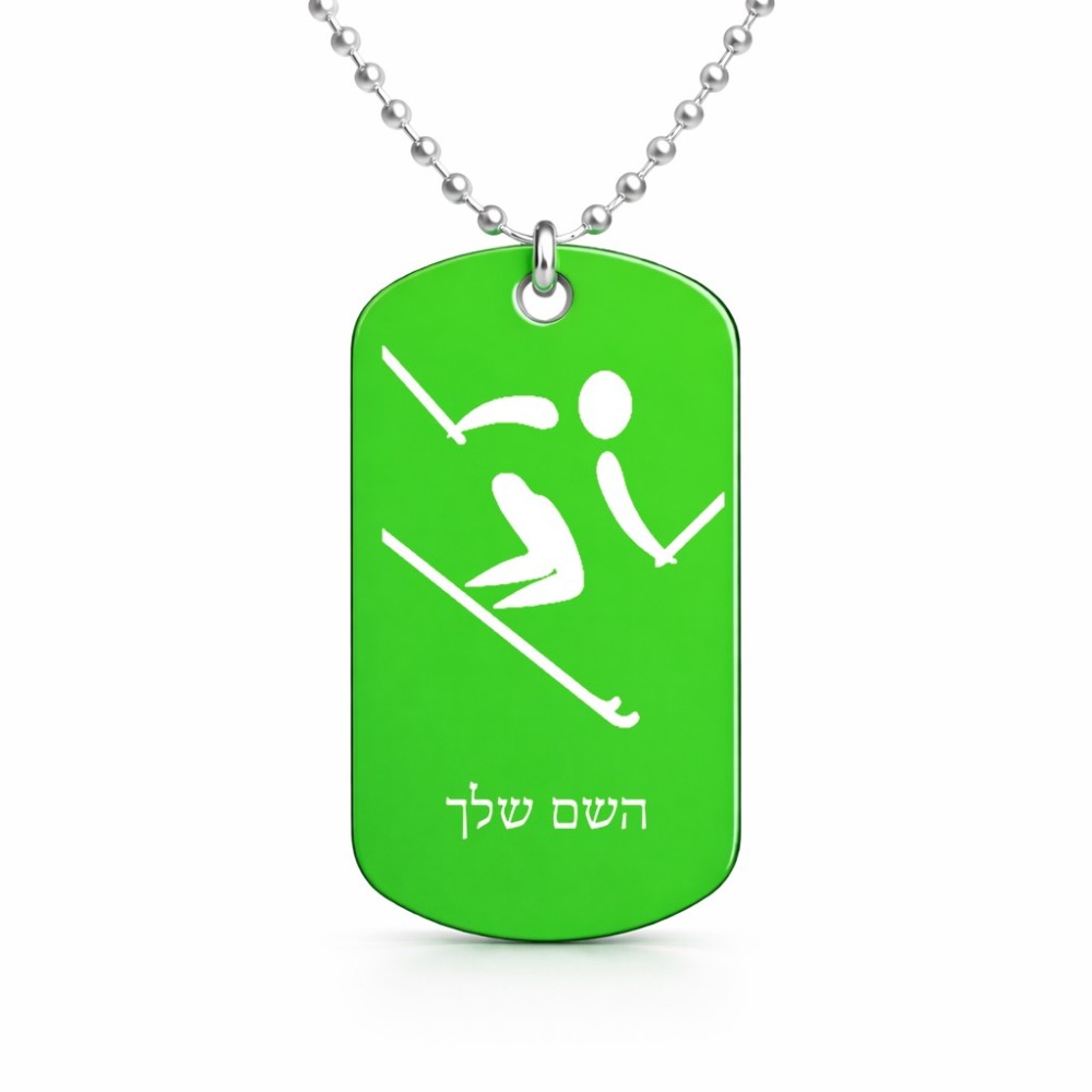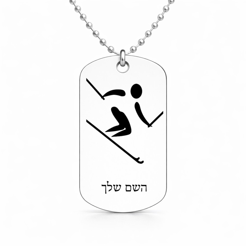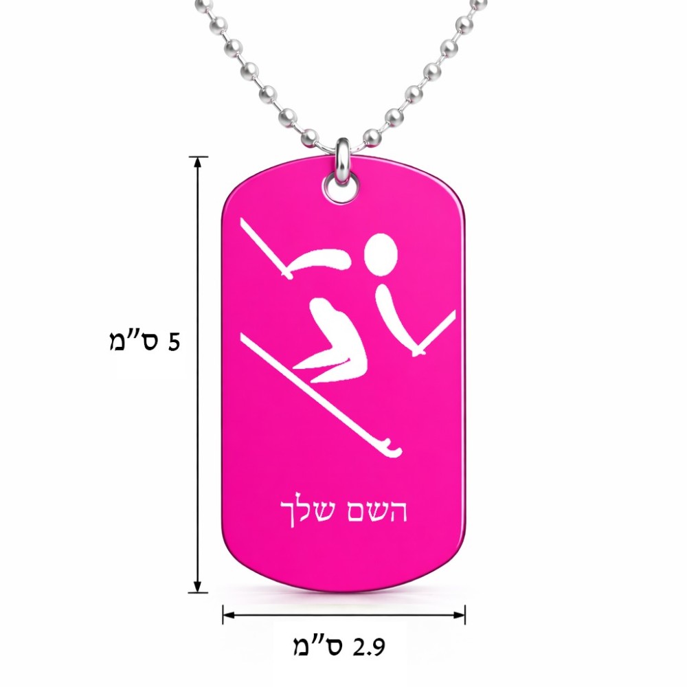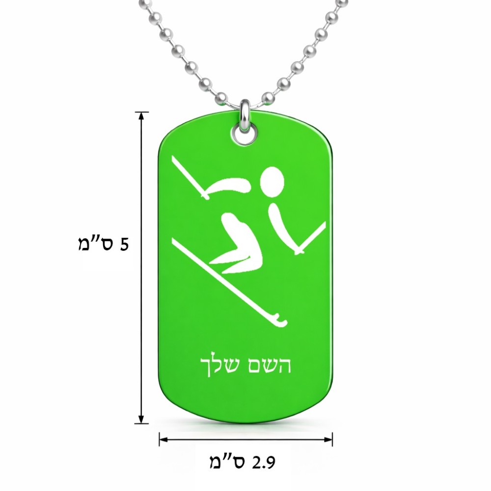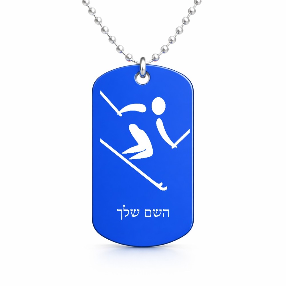 שרשרת דיסקיט מאלומיניום בעיצוב אישי עם השם שלך בעיצוב סקי אולימפי גודל הדיסקיט 2.9 × 5 ס"מ. את השם המבוקש ניתן לציין בהזמנה, אם לא צויין אנחנו ניצור קשר לבירור.