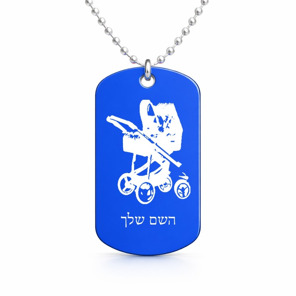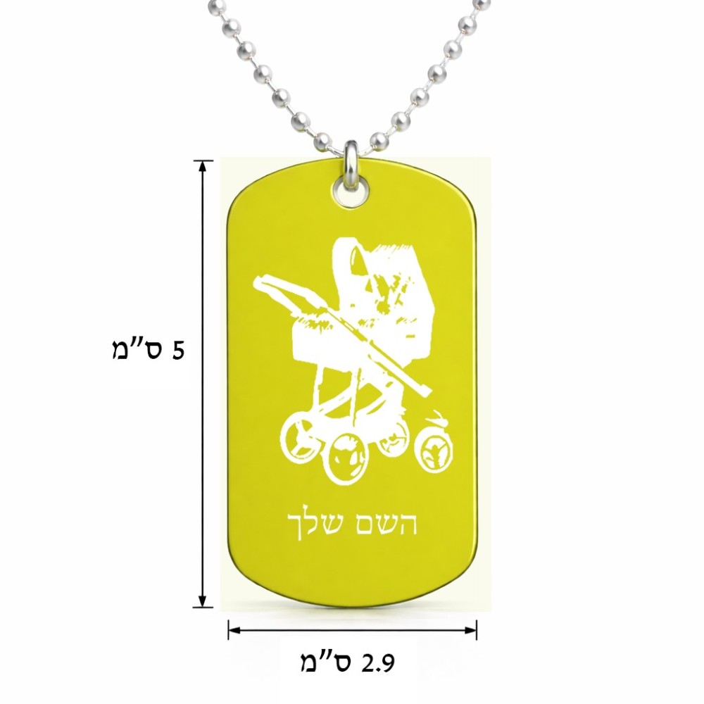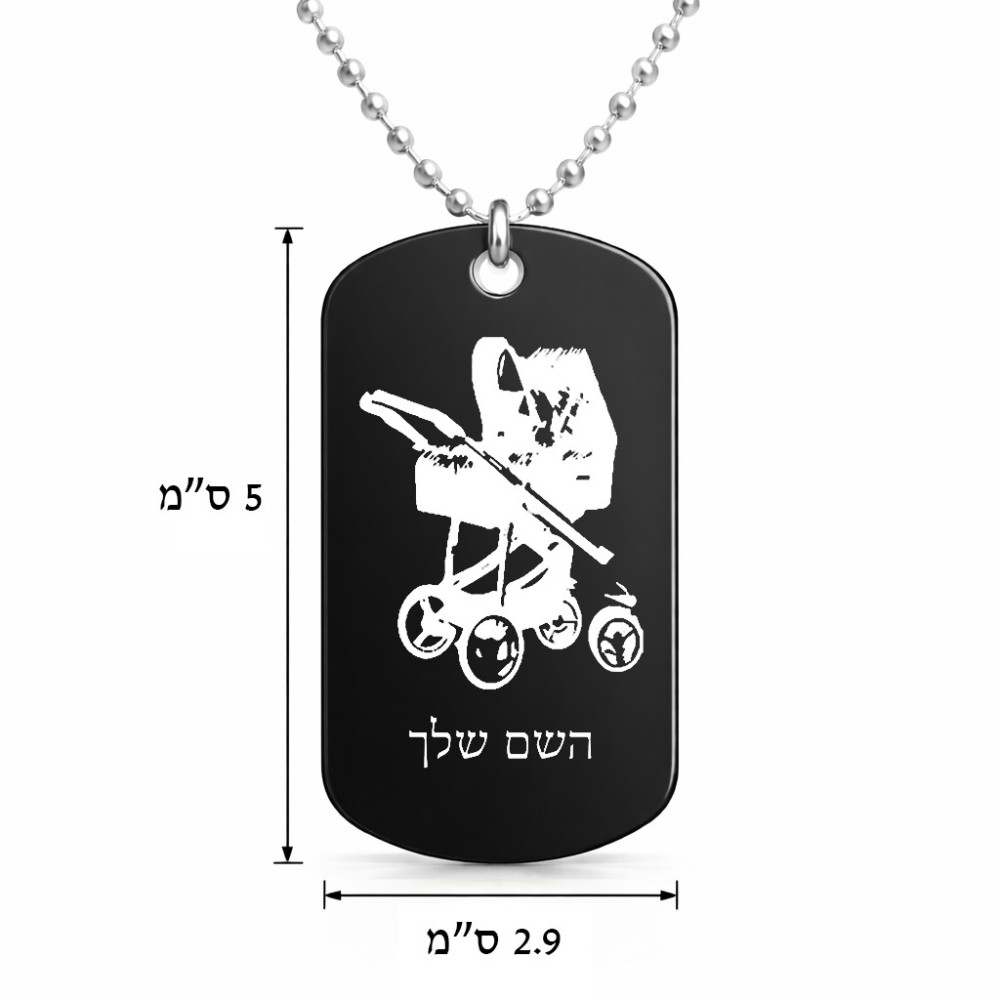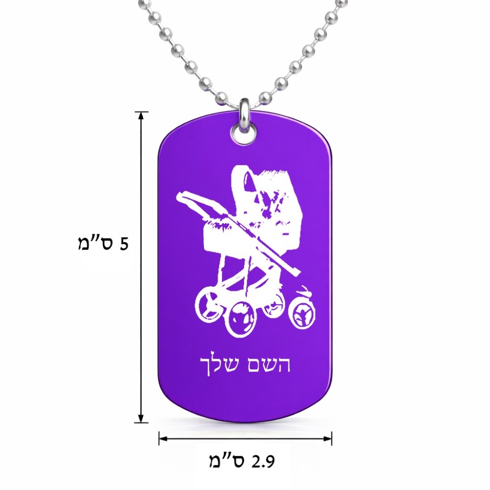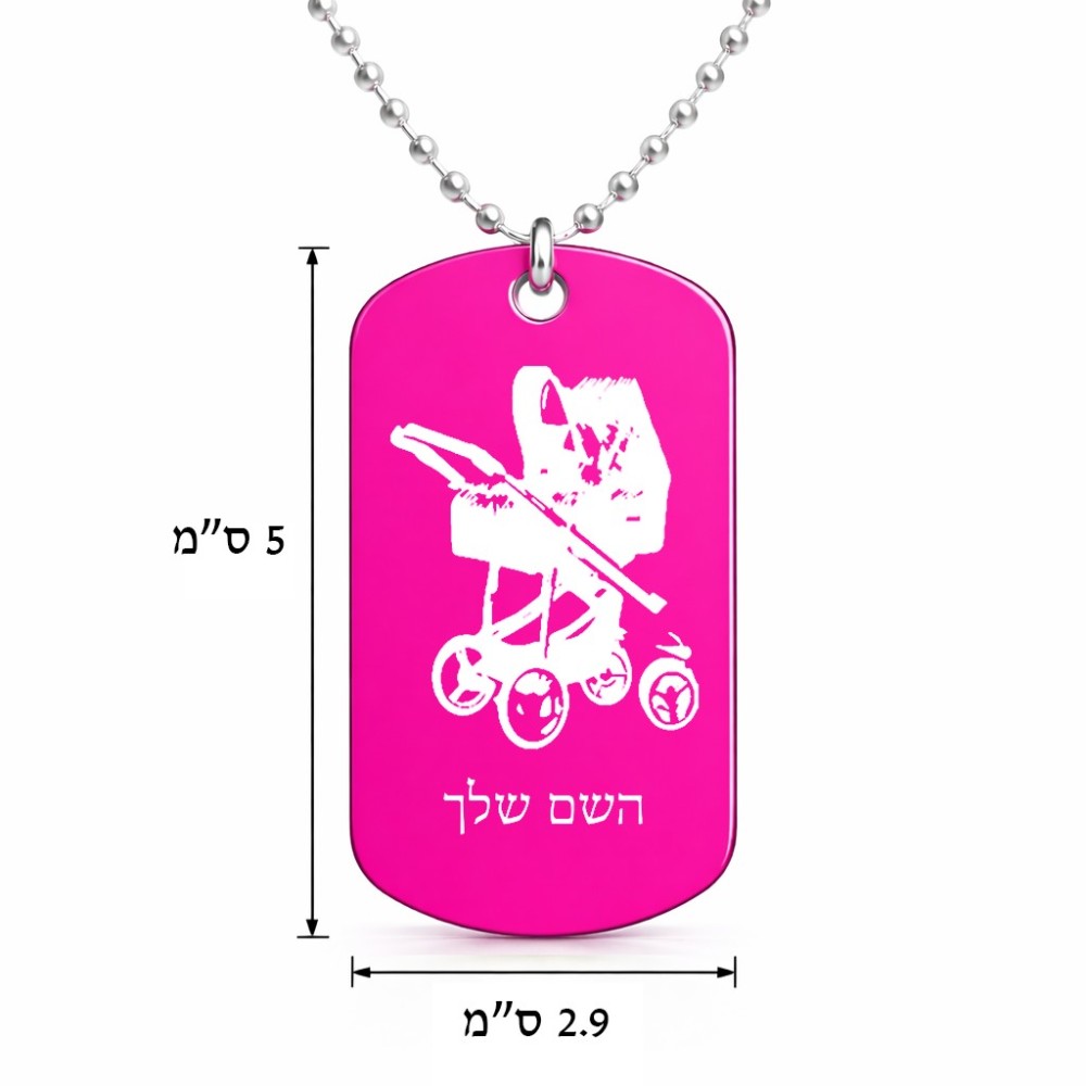 שרשרת דיסקיט מאלומיניום בעיצוב אישי עם השם שלך בעיצוב עגלת תינוק גודל הדיסקיט 2.9 × 5 ס"מ. את השם המבוקש ניתן לציין בהזמנה, אם לא צויין אנחנו ניצור קשר לבירור.