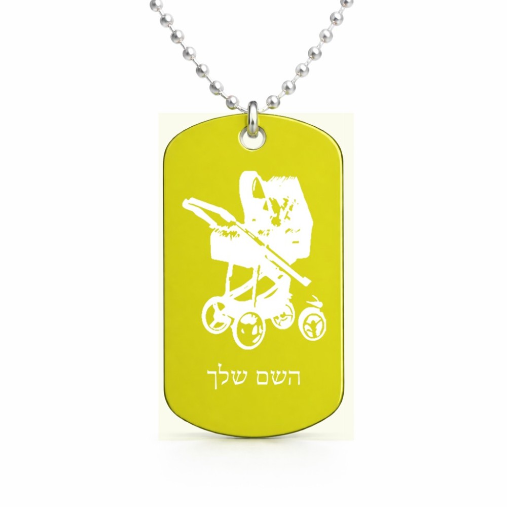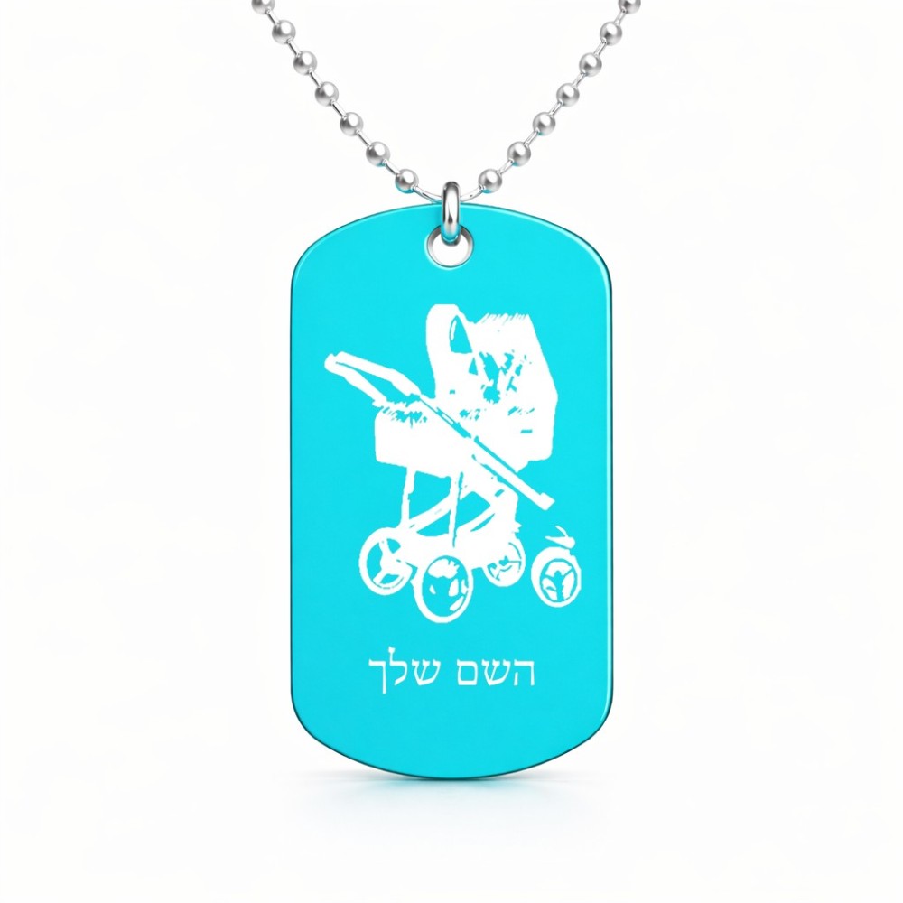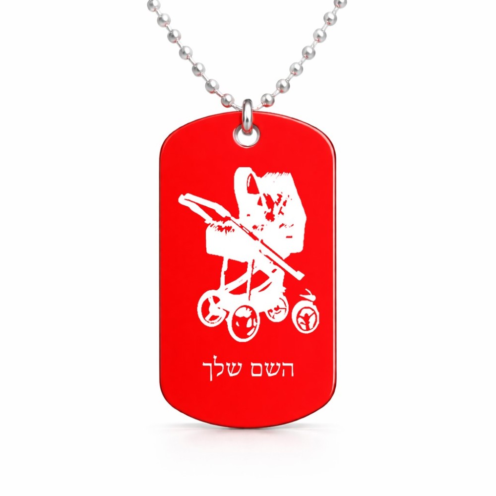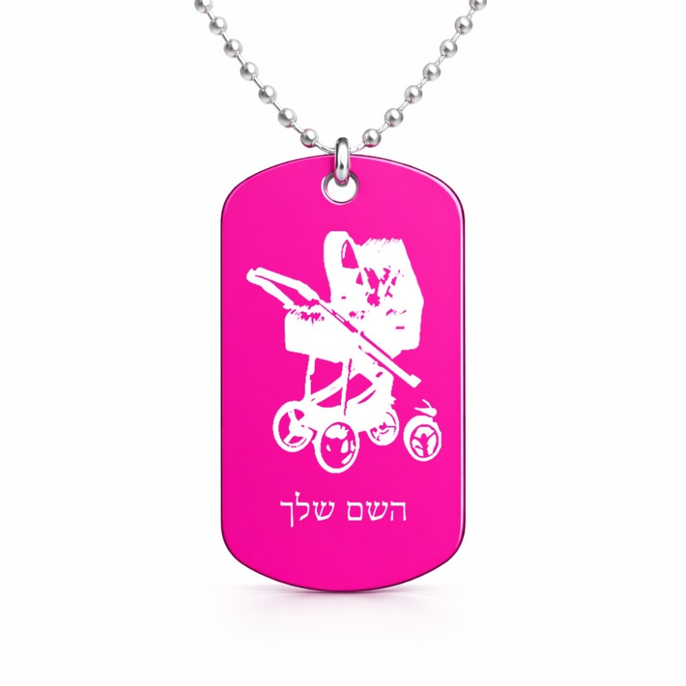 שרשרת דיסקיט מאלומיניום בעיצוב אישי עם השם שלך בעיצוב עגלת תינוק גודל הדיסקיט 2.9 × 5 ס"מ. את השם המבוקש ניתן לציין בהזמנה, אם לא צויין אנחנו ניצור קשר לבירור.