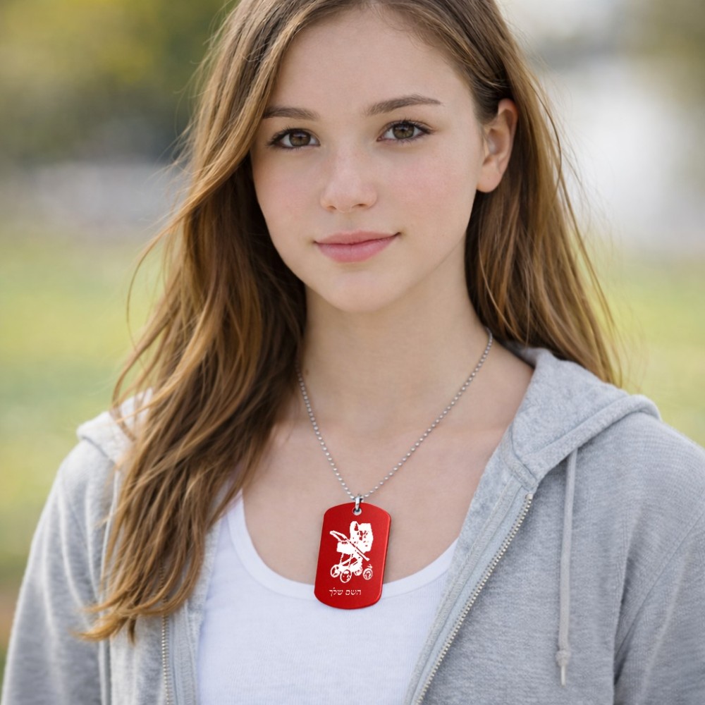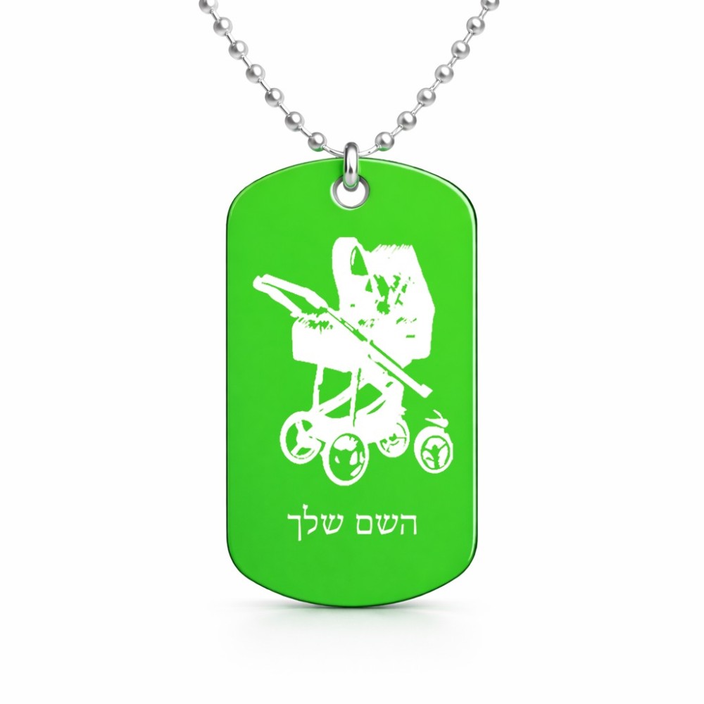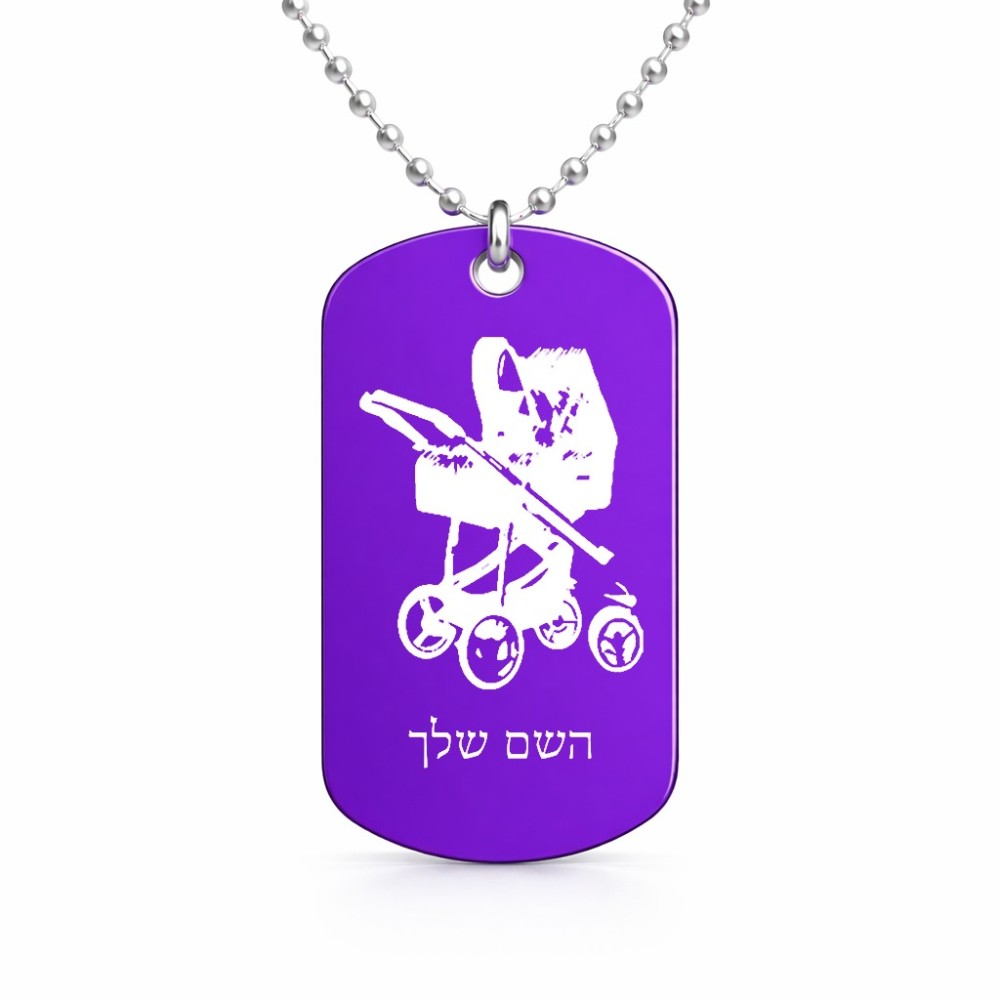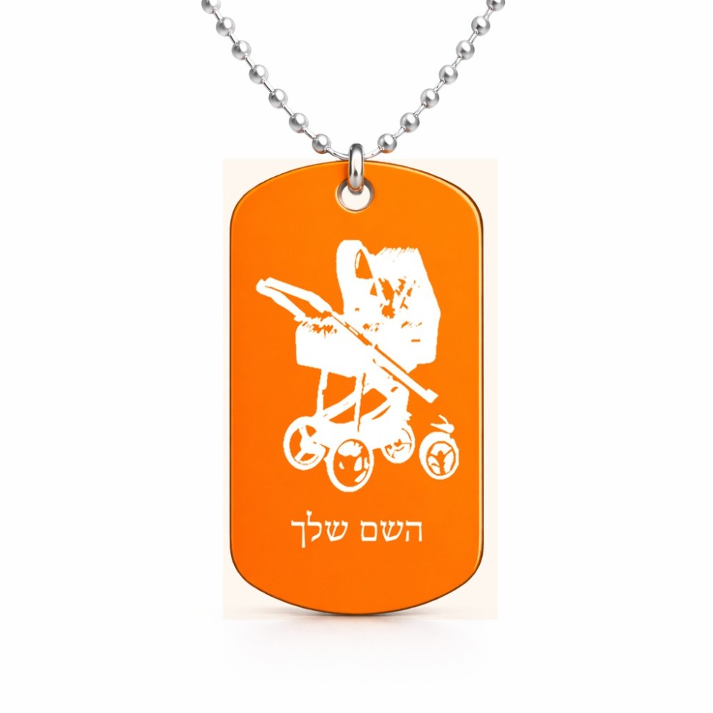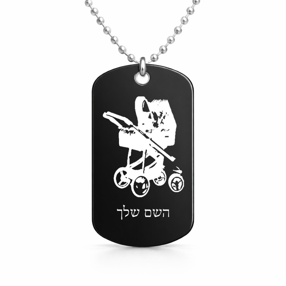 שרשרת דיסקיט מאלומיניום בעיצוב אישי עם השם שלך בעיצוב עגלת תינוק גודל הדיסקיט 2.9 × 5 ס"מ. את השם המבוקש ניתן לציין בהזמנה, אם לא צויין אנחנו ניצור קשר לבירור.