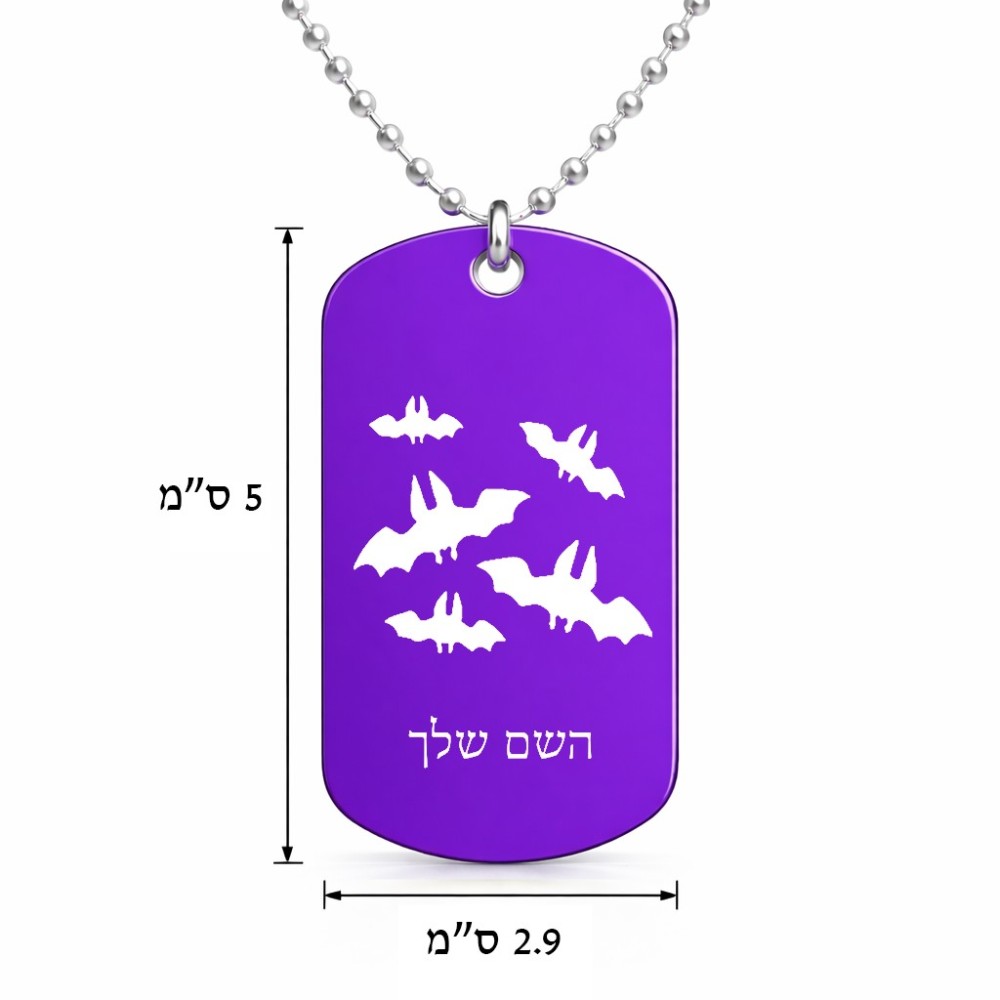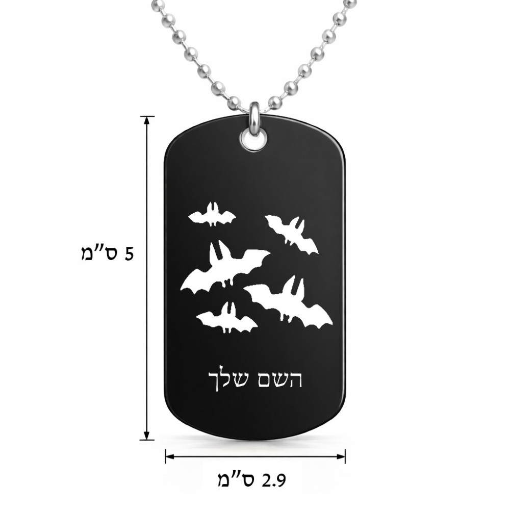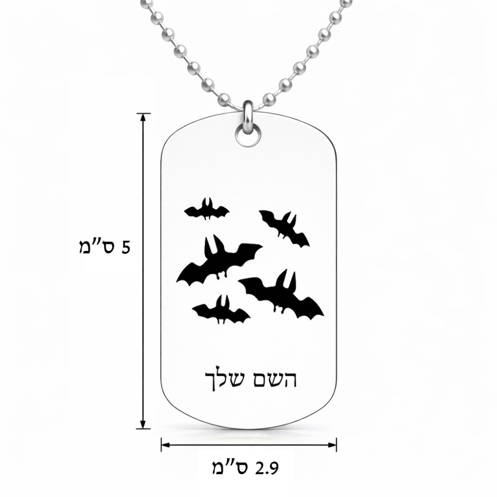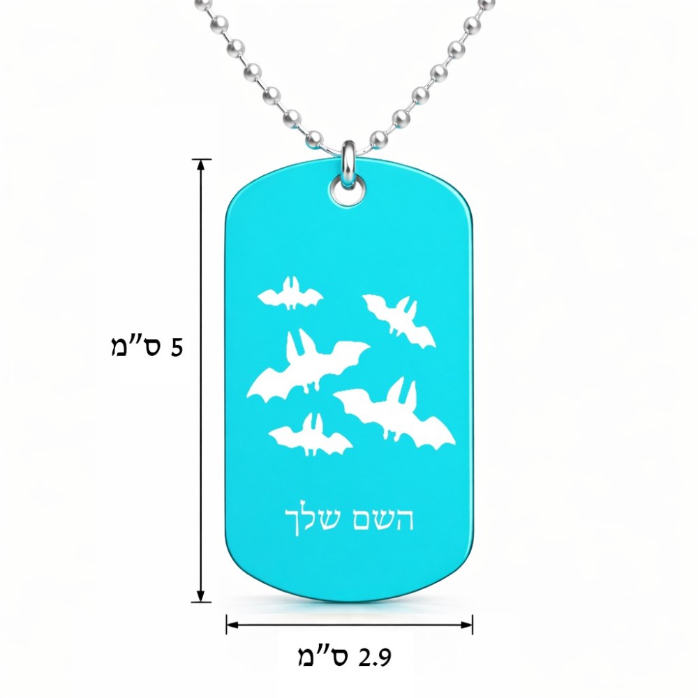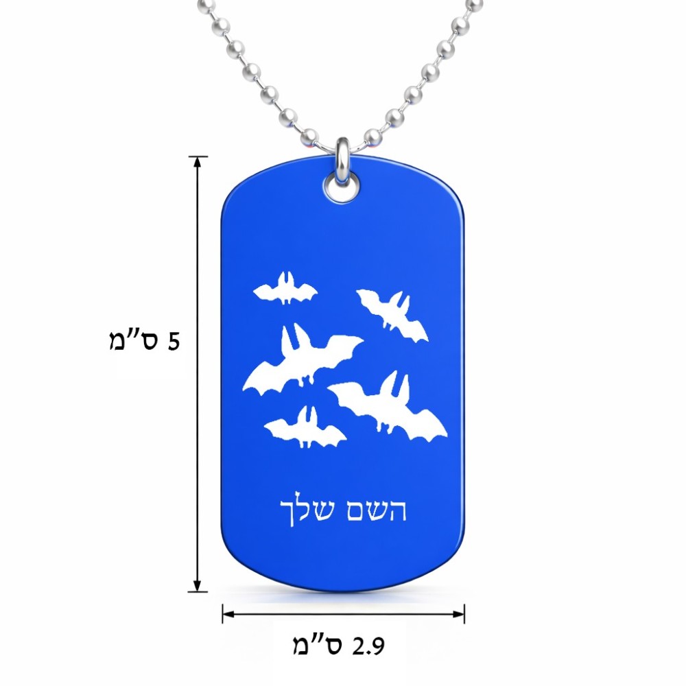 שרשרת דיסקיט מאלומיניום בעיצוב אישי עם השם שלך בעיצוב עטלפים גודל הדיסקיט 2.9 × 5 ס"מ. את השם המבוקש ניתן לציין בהזמנה, אם לא צויין אנחנו ניצור קשר לבירור.