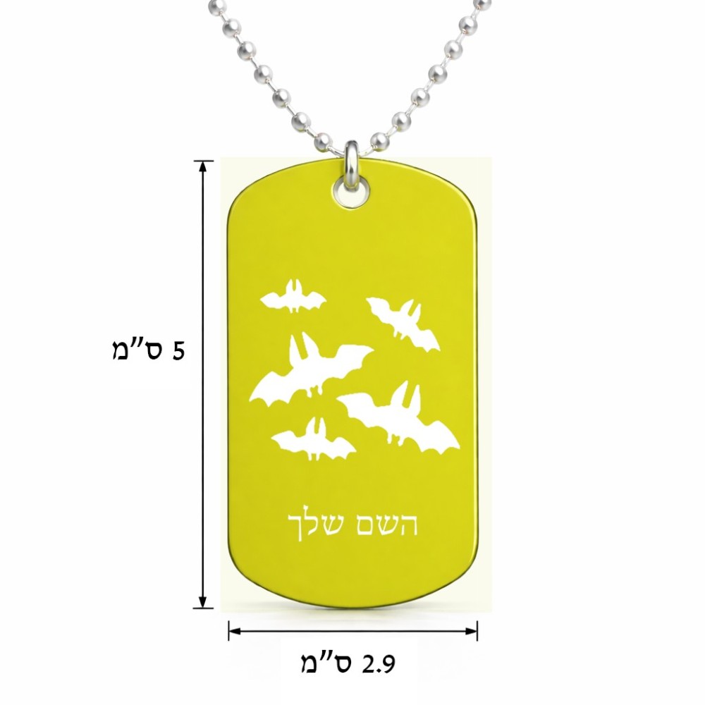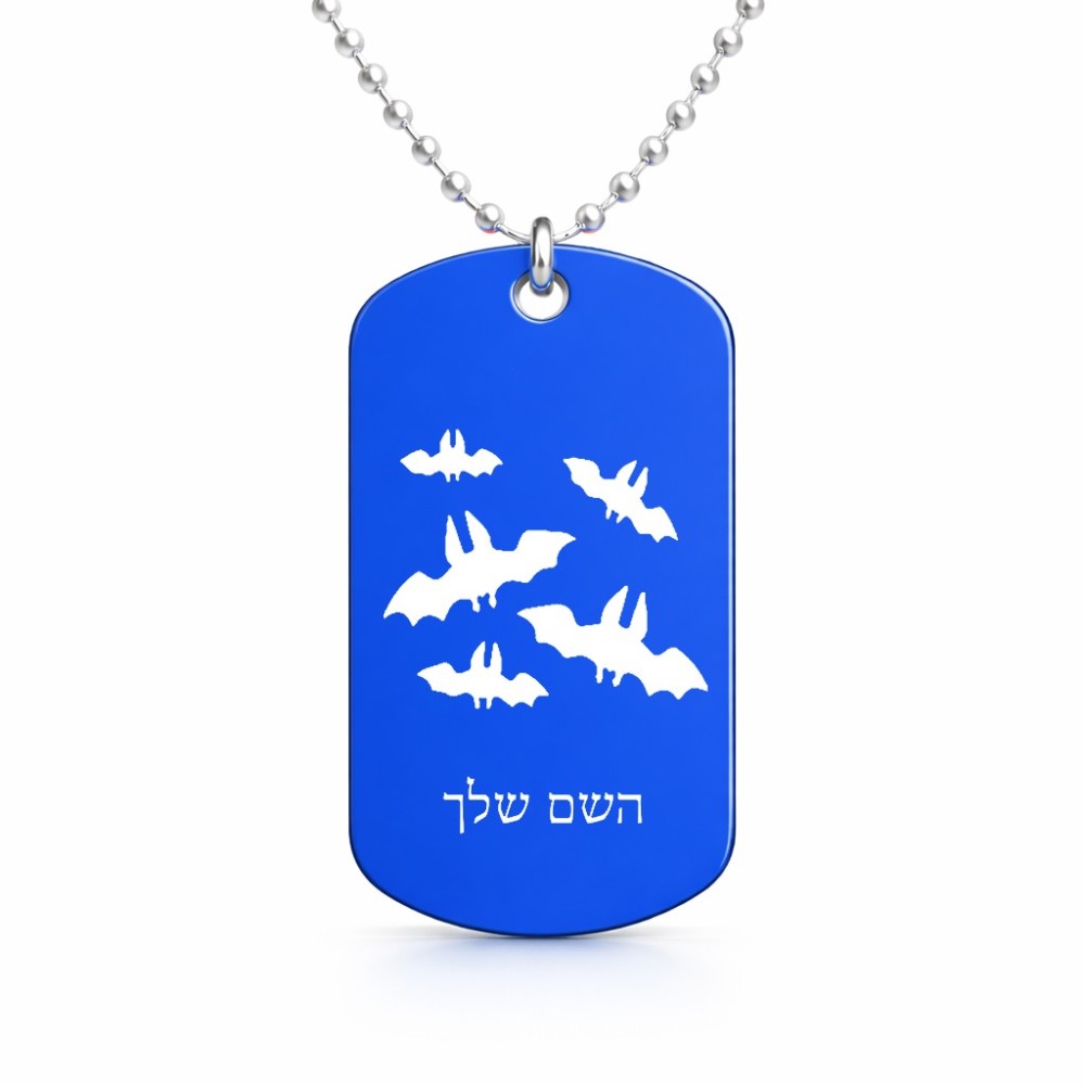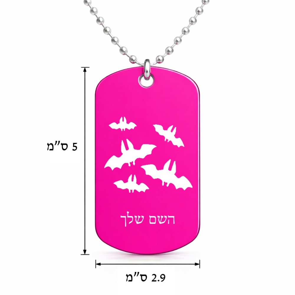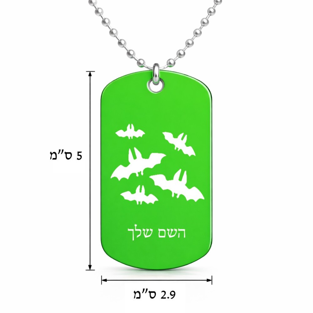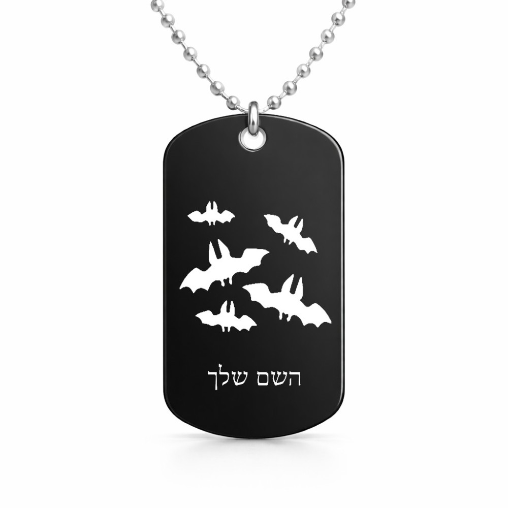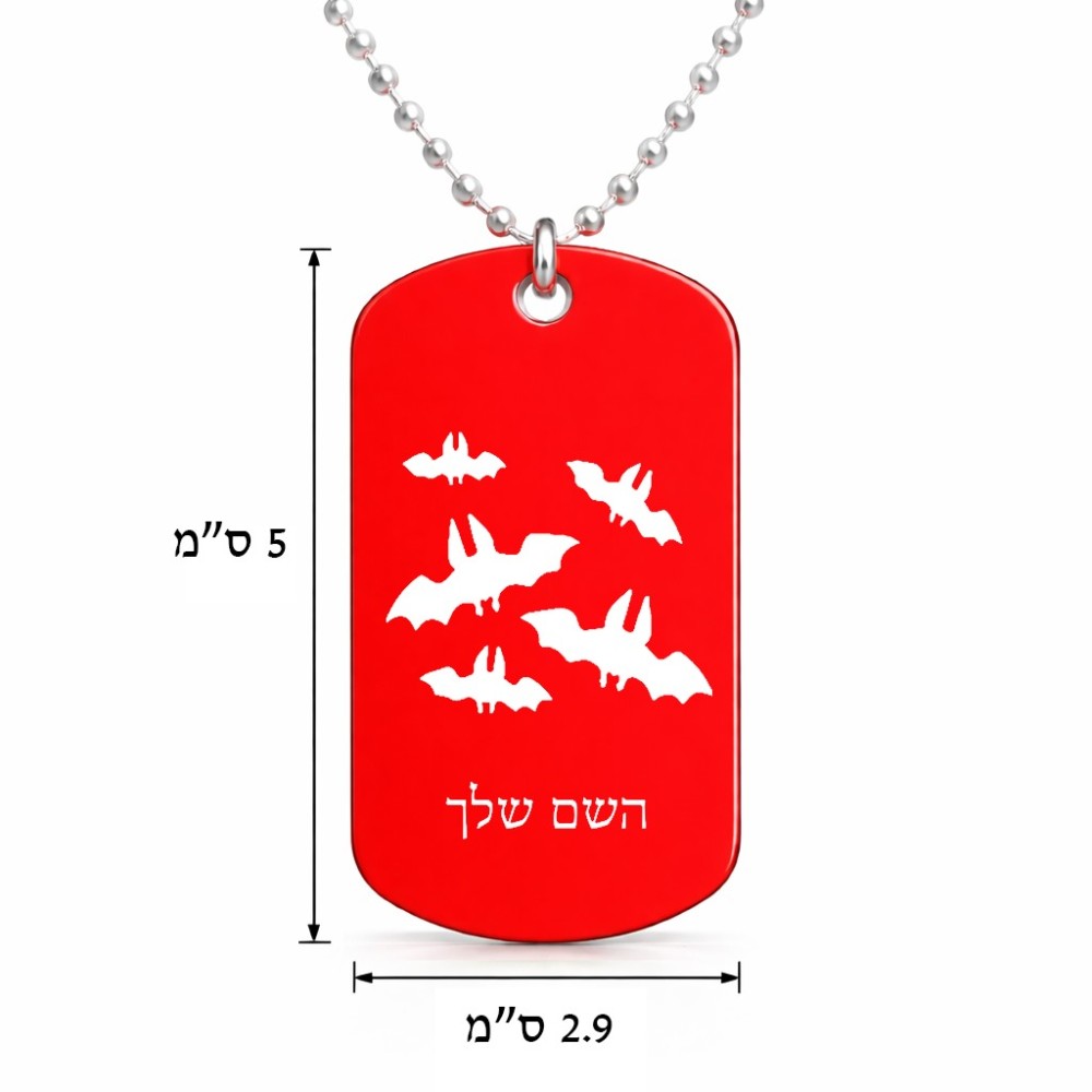 שרשרת דיסקיט מאלומיניום בעיצוב אישי עם השם שלך בעיצוב עטלפים גודל הדיסקיט 2.9 × 5 ס"מ. את השם המבוקש ניתן לציין בהזמנה, אם לא צויין אנחנו ניצור קשר לבירור.