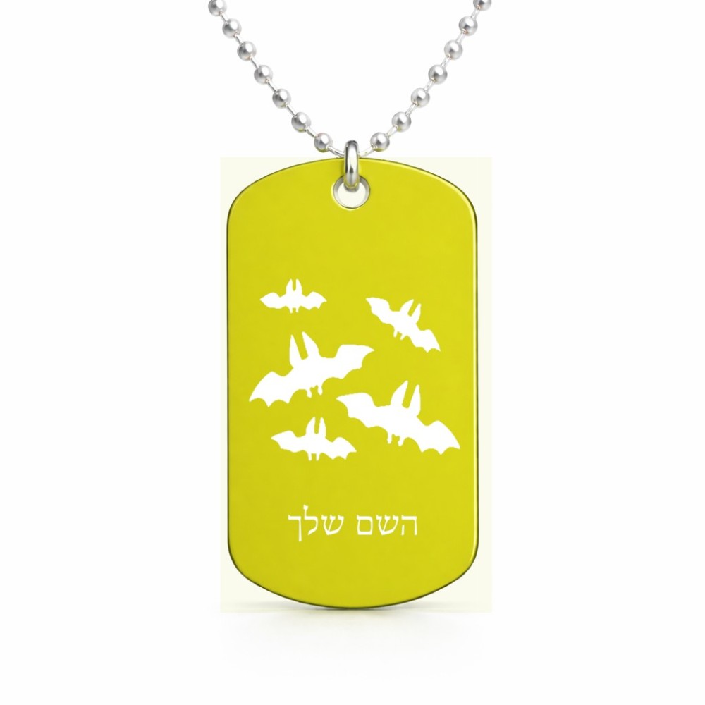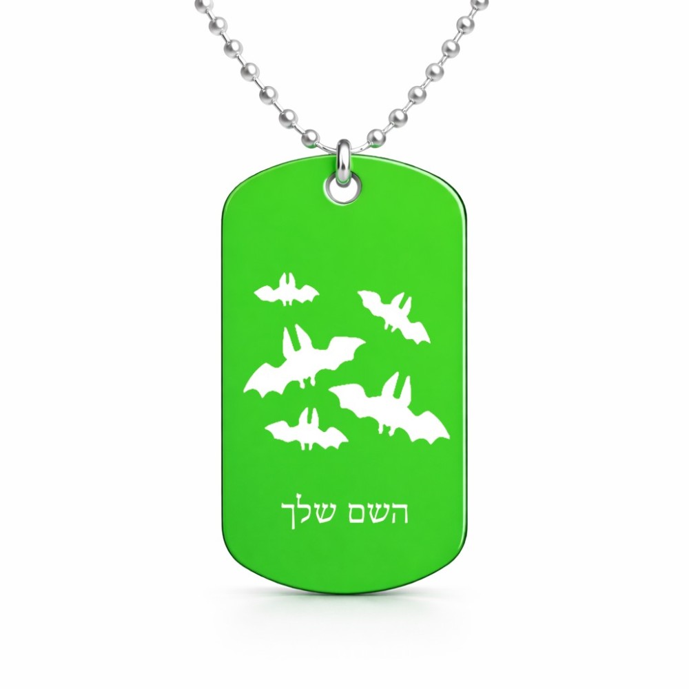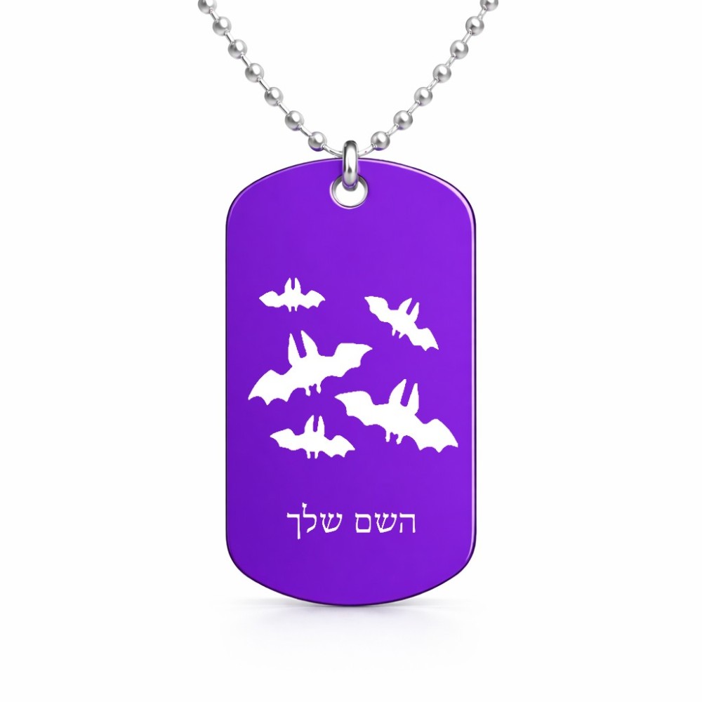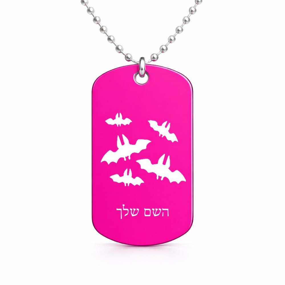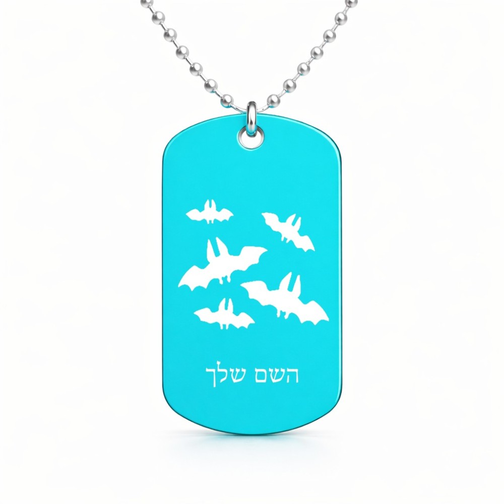 שרשרת דיסקיט מאלומיניום בעיצוב אישי עם השם שלך בעיצוב עטלפים גודל הדיסקיט 2.9 × 5 ס"מ. את השם המבוקש ניתן לציין בהזמנה, אם לא צויין אנחנו ניצור קשר לבירור.