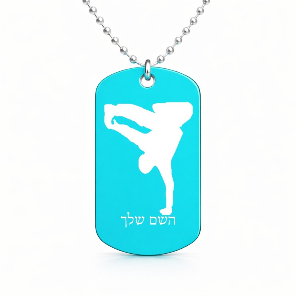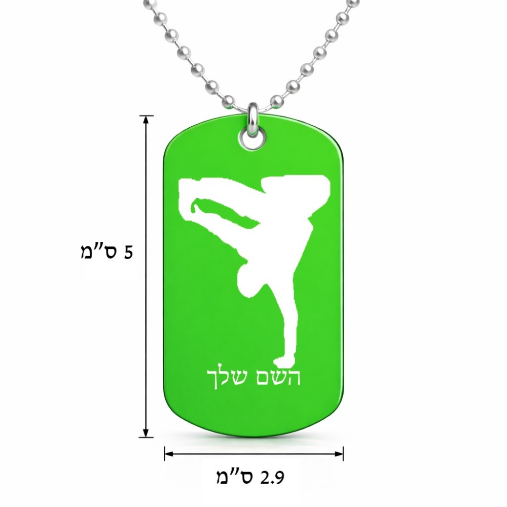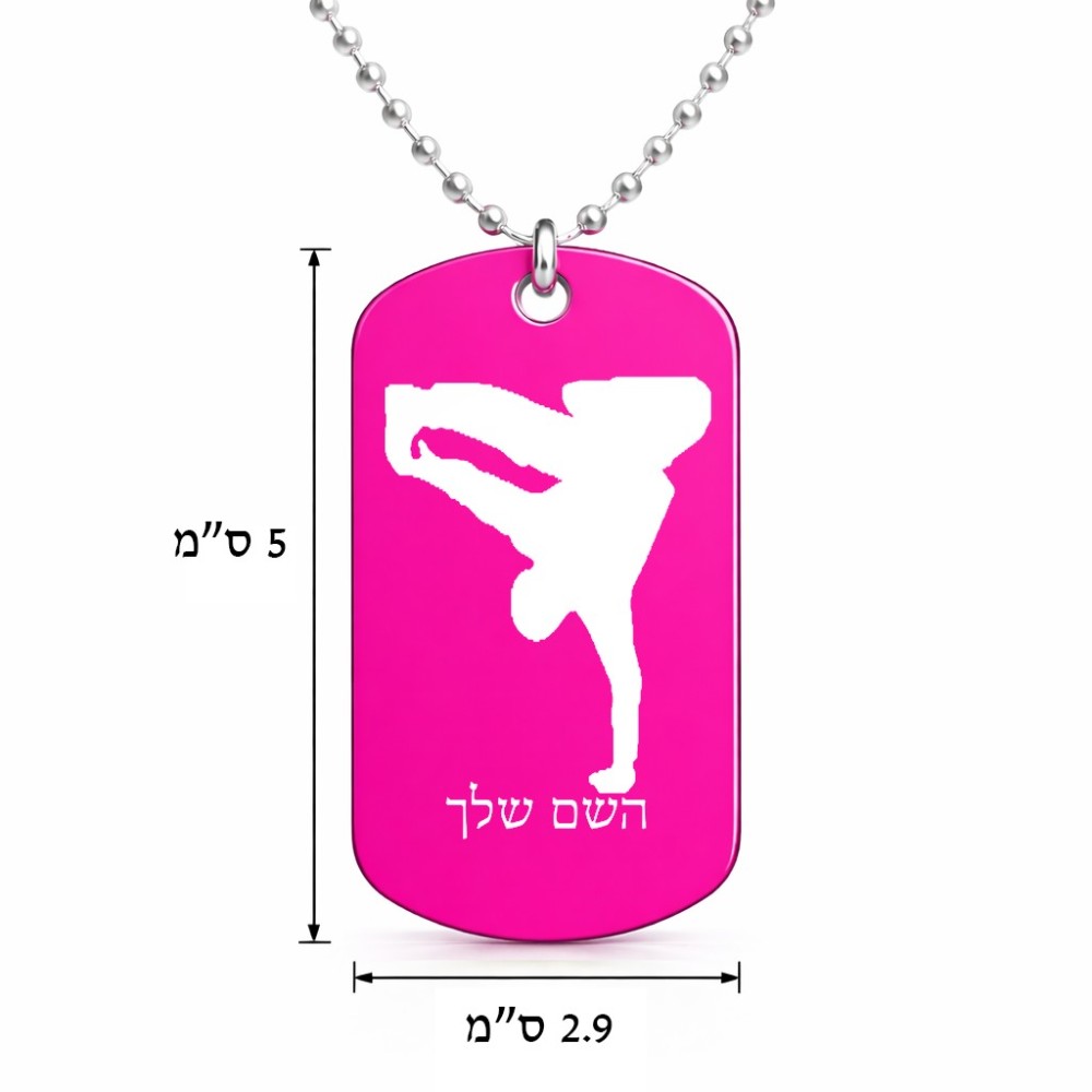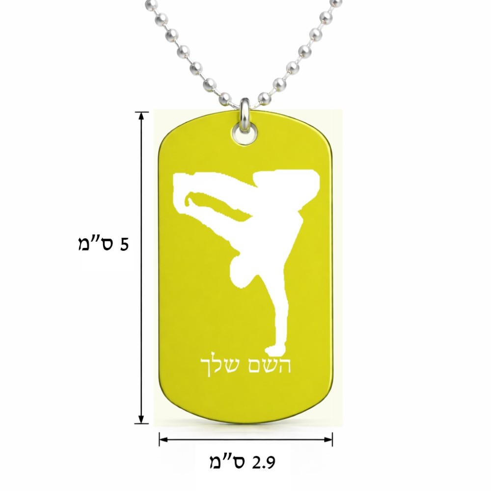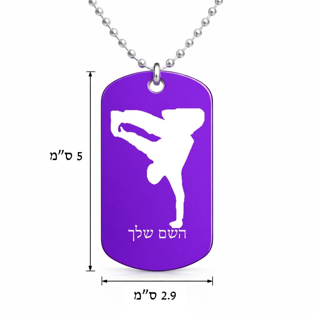 שרשרת דיסקיט מאלומיניום בעיצוב אישי עם השם שלך בעיצוב ברייקדאנס גודל הדיסקיט 2.9 × 5 ס"מ. את השם המבוקש ניתן לציין בהזמנה, אם לא צויין אנחנו ניצור קשר לבירור.