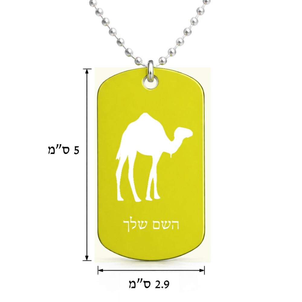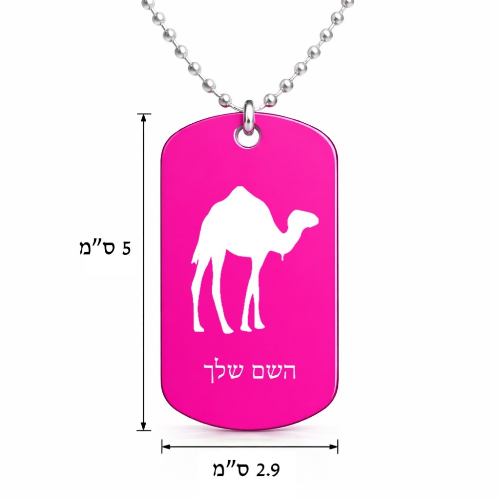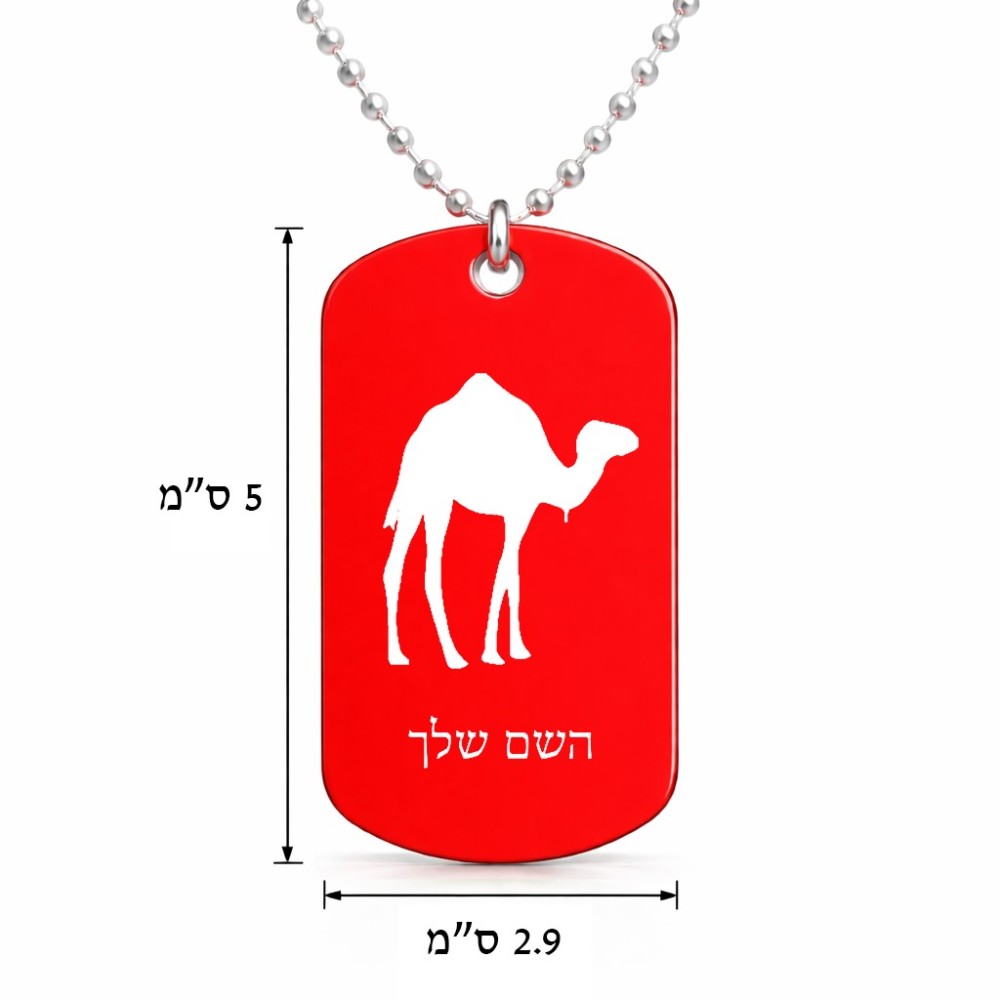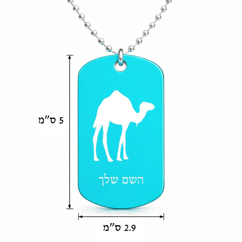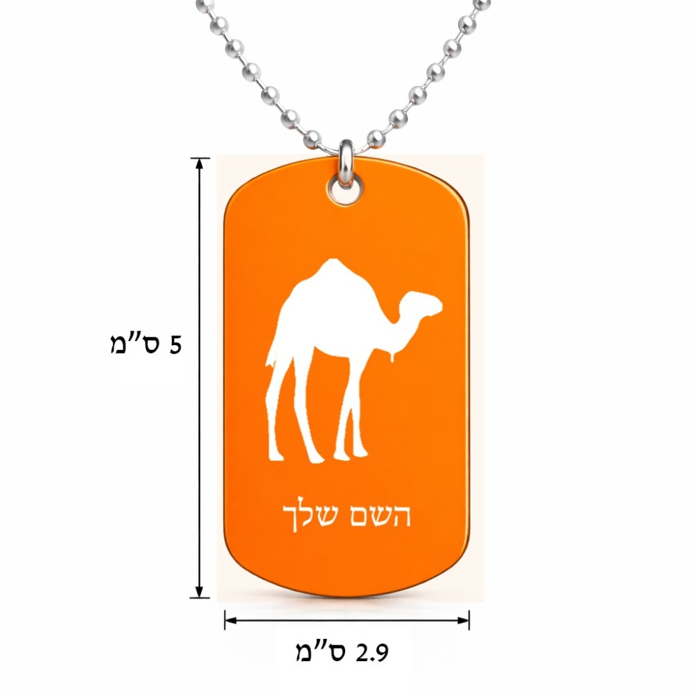 שרשרת דיסקיט מאלומיניום בעיצוב אישי עם השם שלך בעיצוב גמל גודל הדיסקיט 2.9 × 5 ס"מ. את השם המבוקש ניתן לציין בהזמנה, אם לא צויין אנחנו ניצור קשר לבירור.