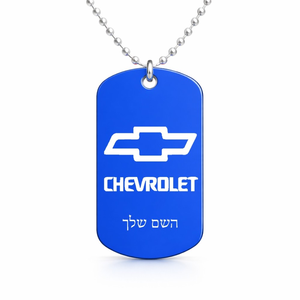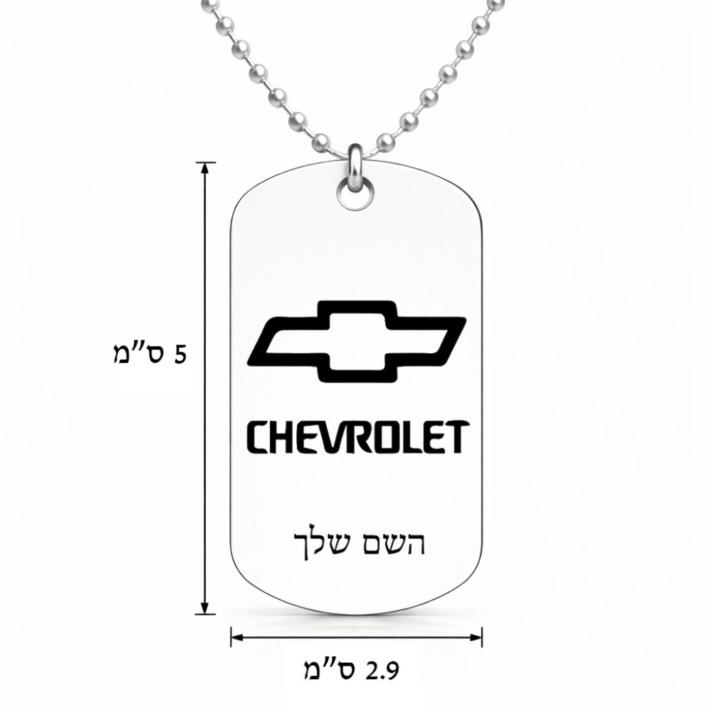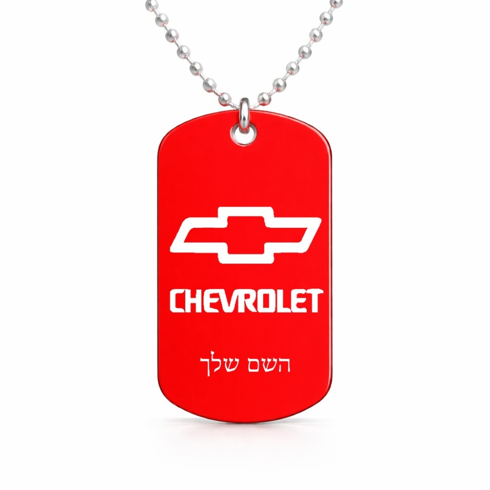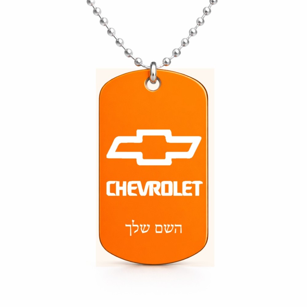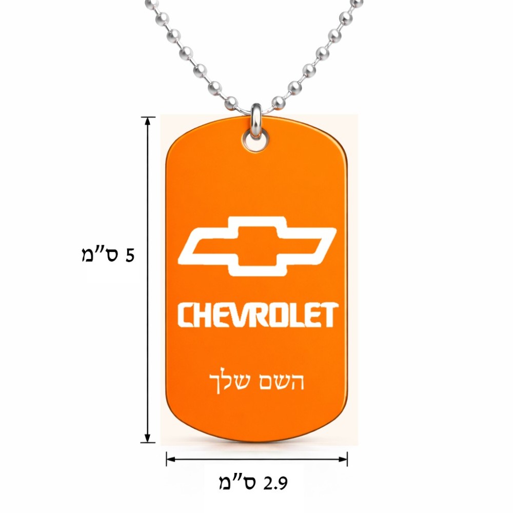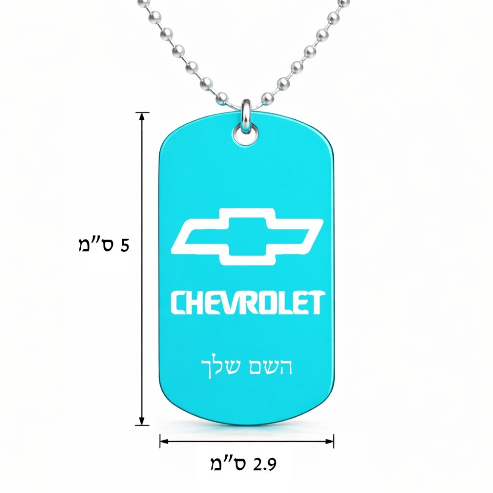 שרשרת דיסקיט מאלומיניום בעיצוב אישי עם השם שלך בעיצוב שברולט גודל הדיסקיט 2.9 × 5 ס"מ. את השם המבוקש ניתן לציין בהזמנה, אם לא צויין אנחנו ניצור קשר לבירור.