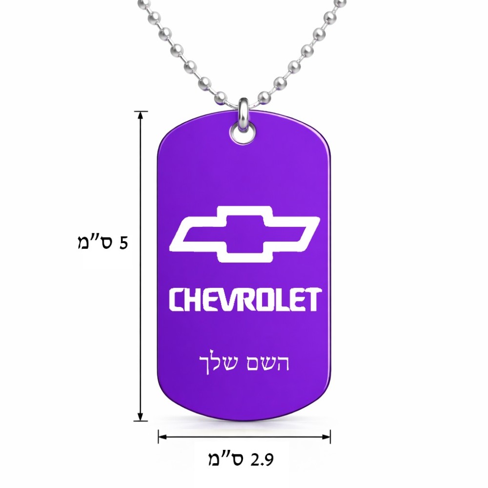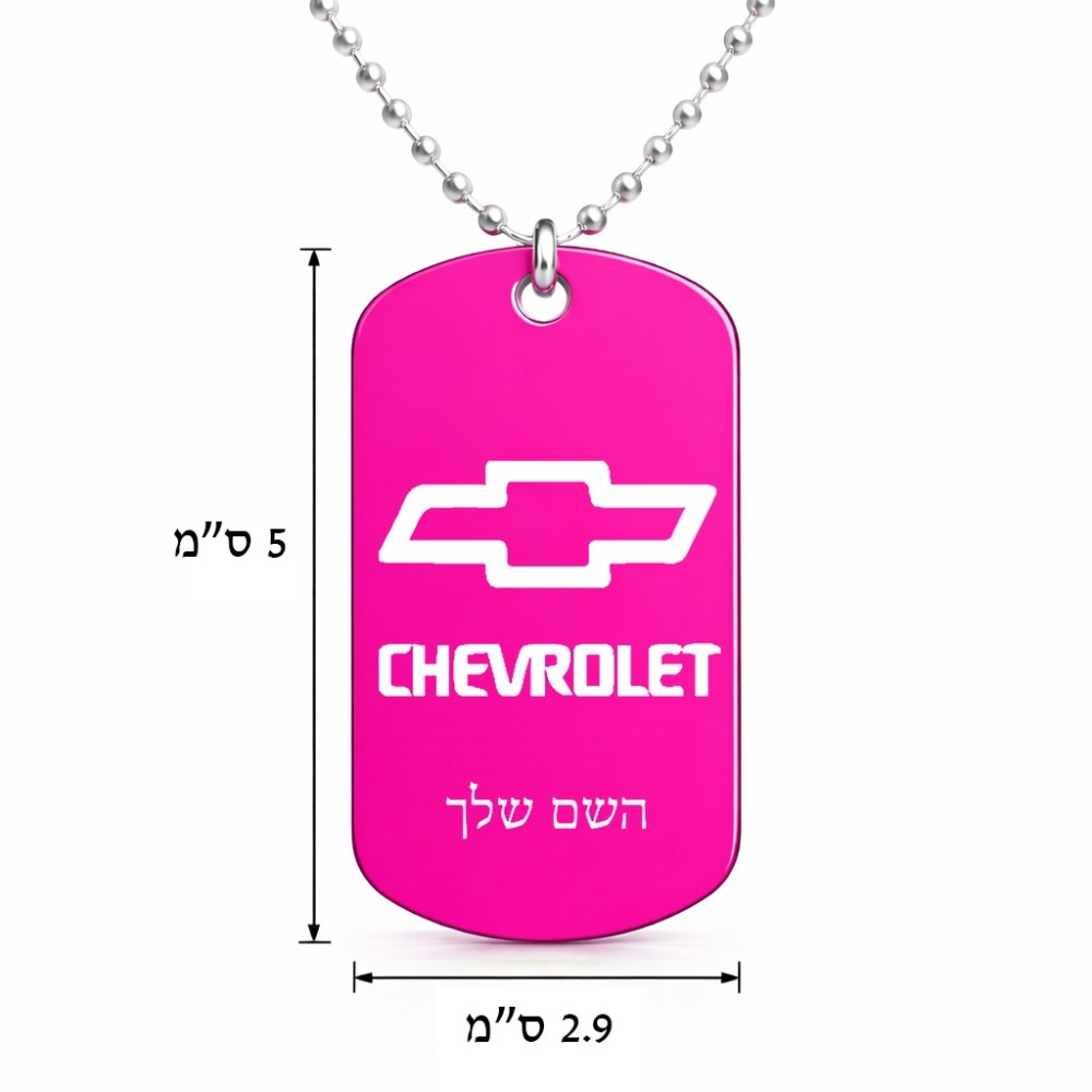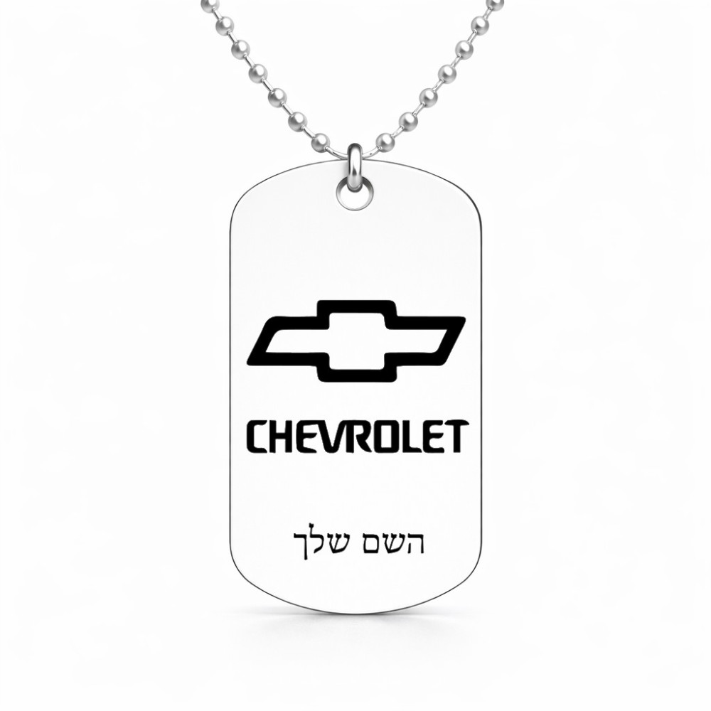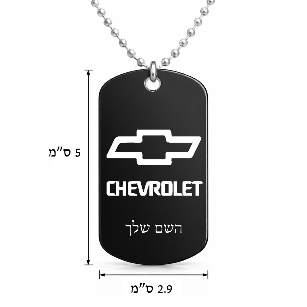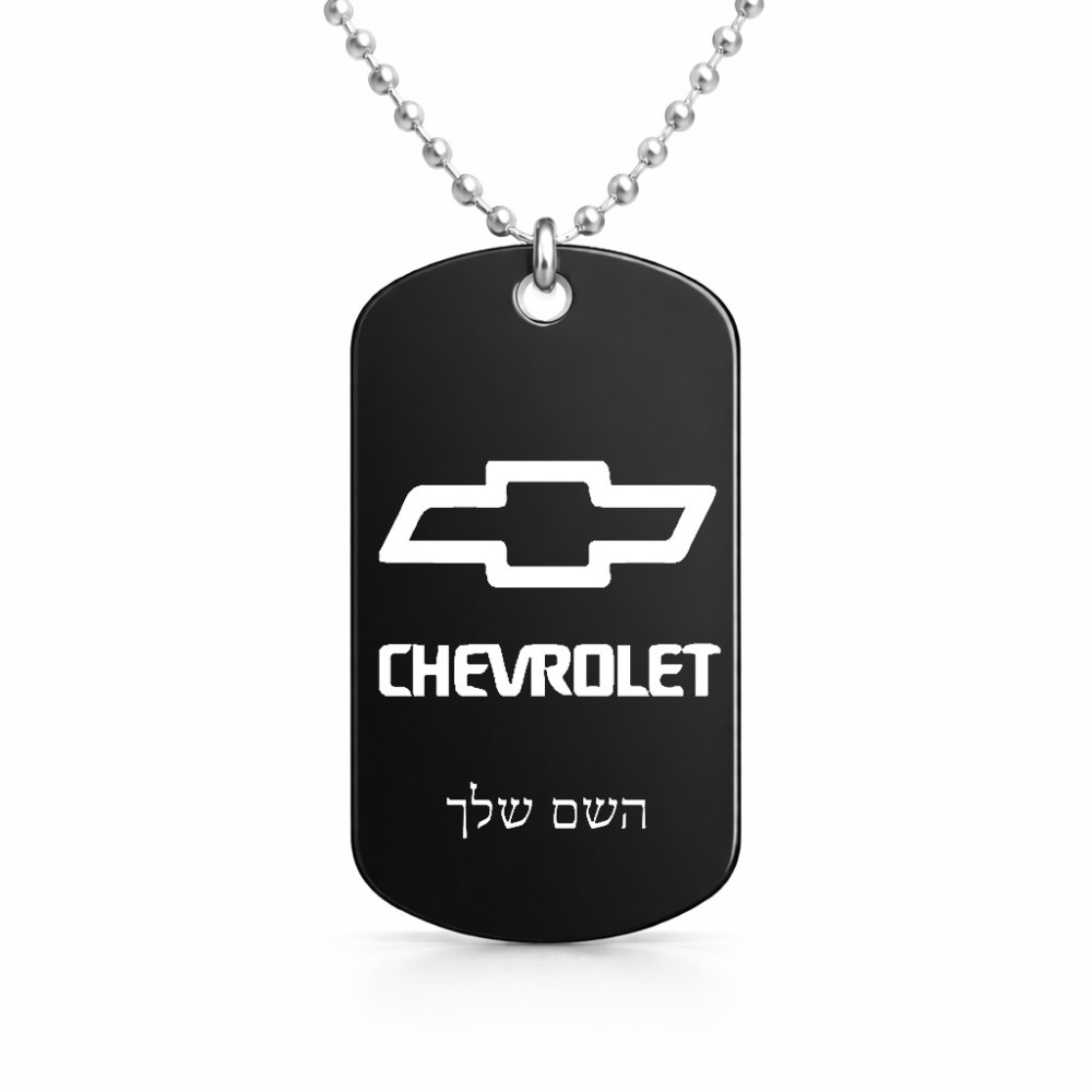 שרשרת דיסקיט מאלומיניום בעיצוב אישי עם השם שלך בעיצוב שברולט גודל הדיסקיט 2.9 × 5 ס"מ. את השם המבוקש ניתן לציין בהזמנה, אם לא צויין אנחנו ניצור קשר לבירור.