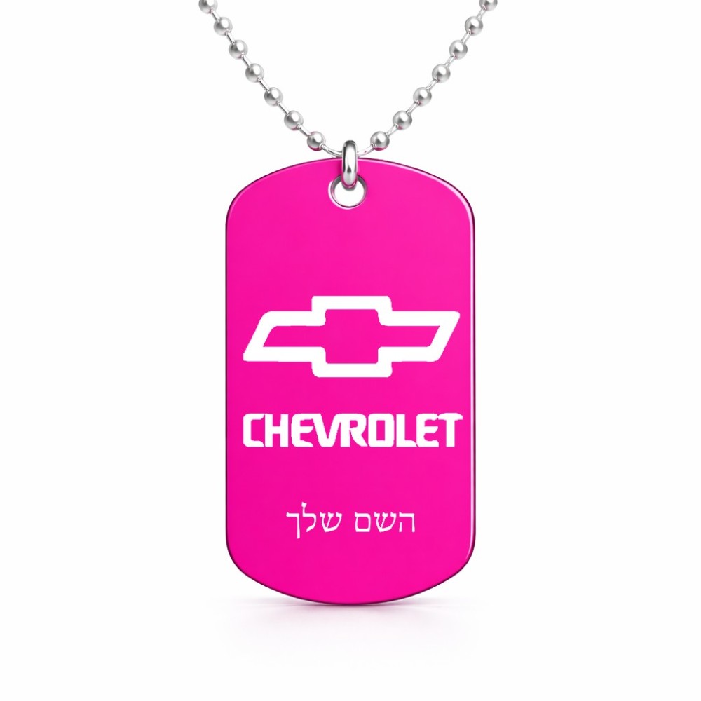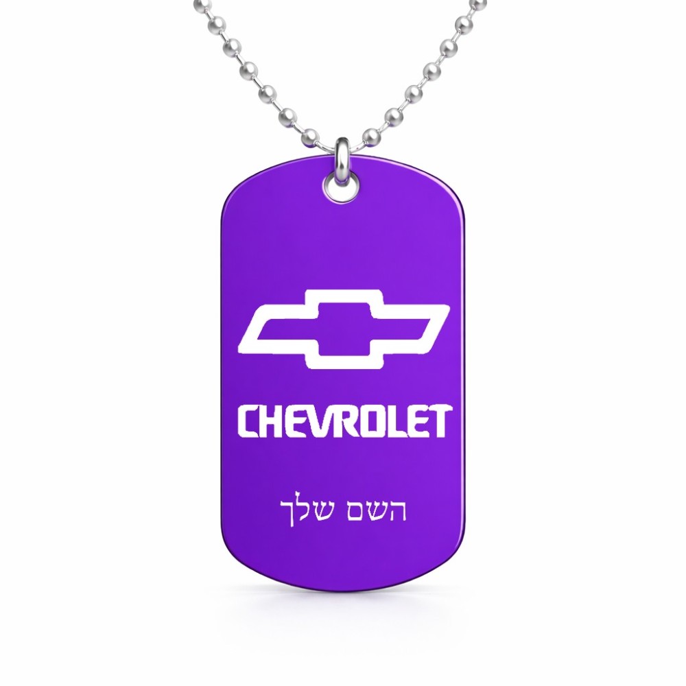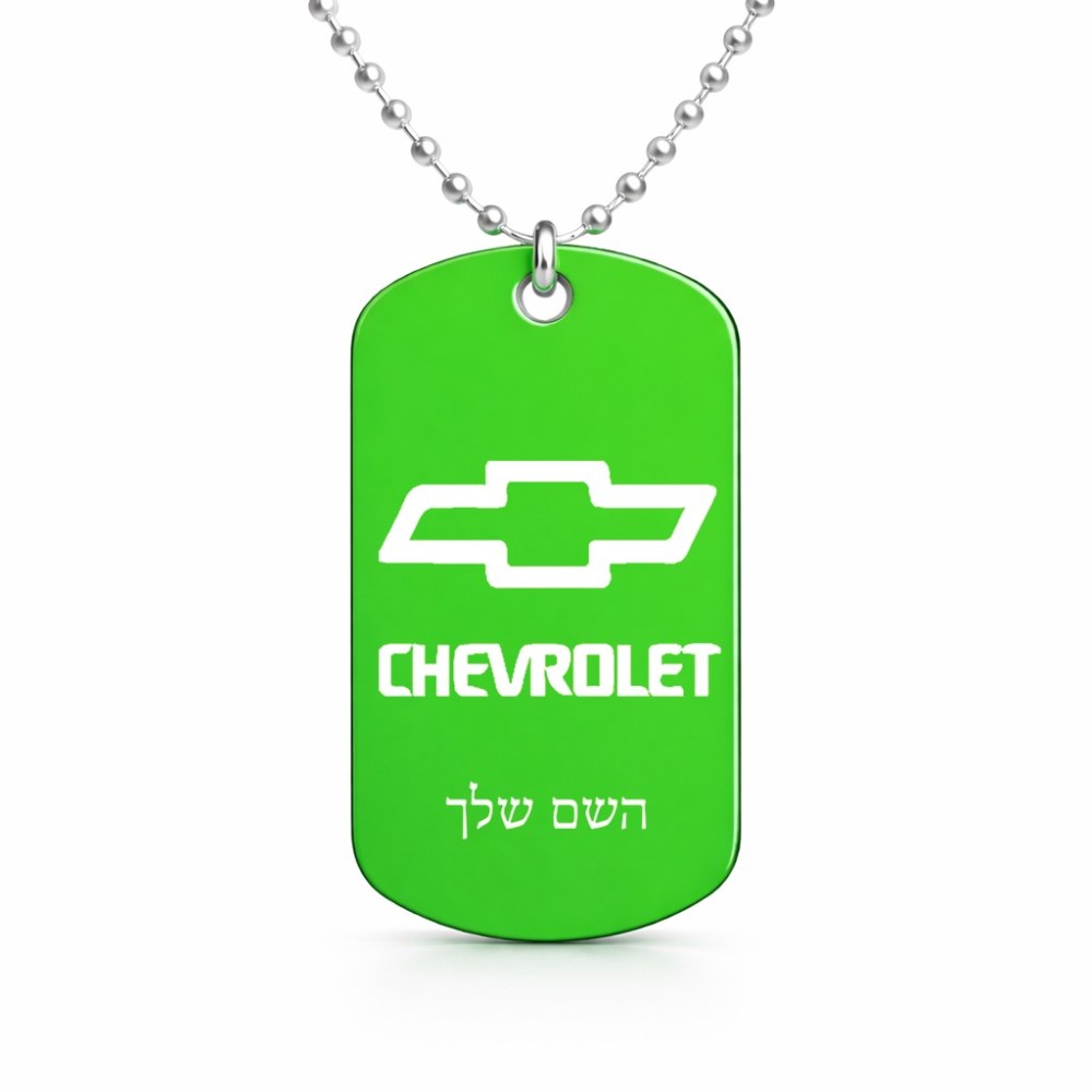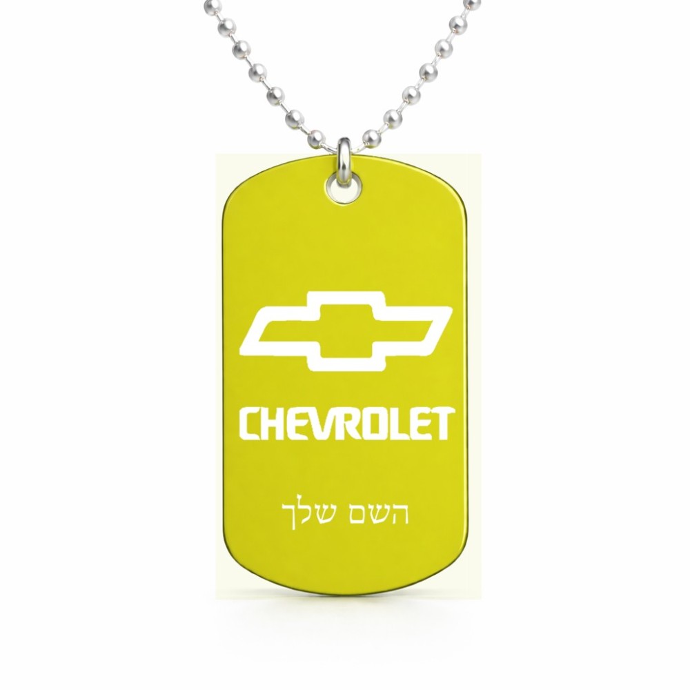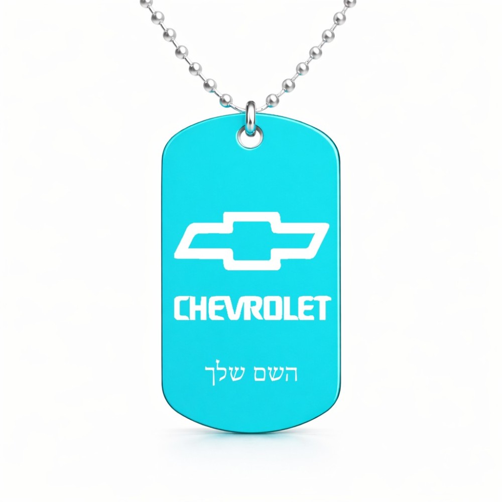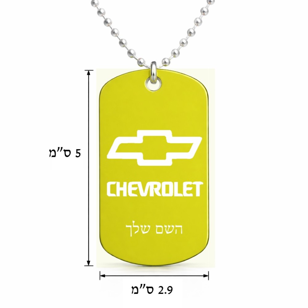 שרשרת דיסקיט מאלומיניום בעיצוב אישי עם השם שלך בעיצוב שברולט גודל הדיסקיט 2.9 × 5 ס"מ. את השם המבוקש ניתן לציין בהזמנה, אם לא צויין אנחנו ניצור קשר לבירור.