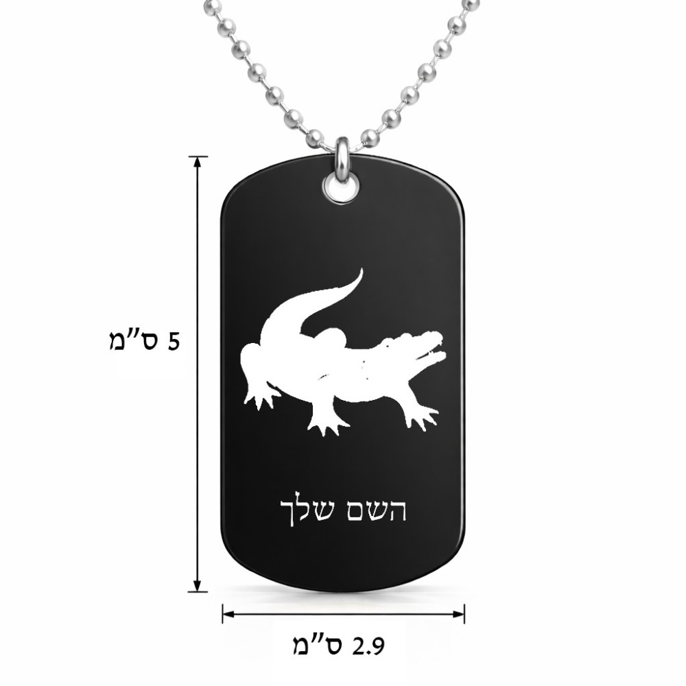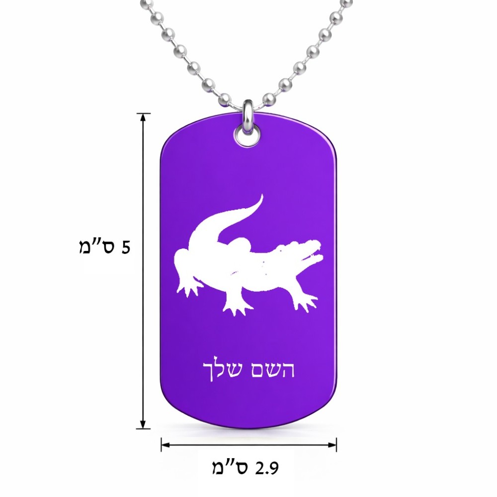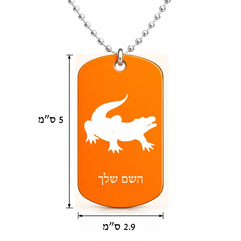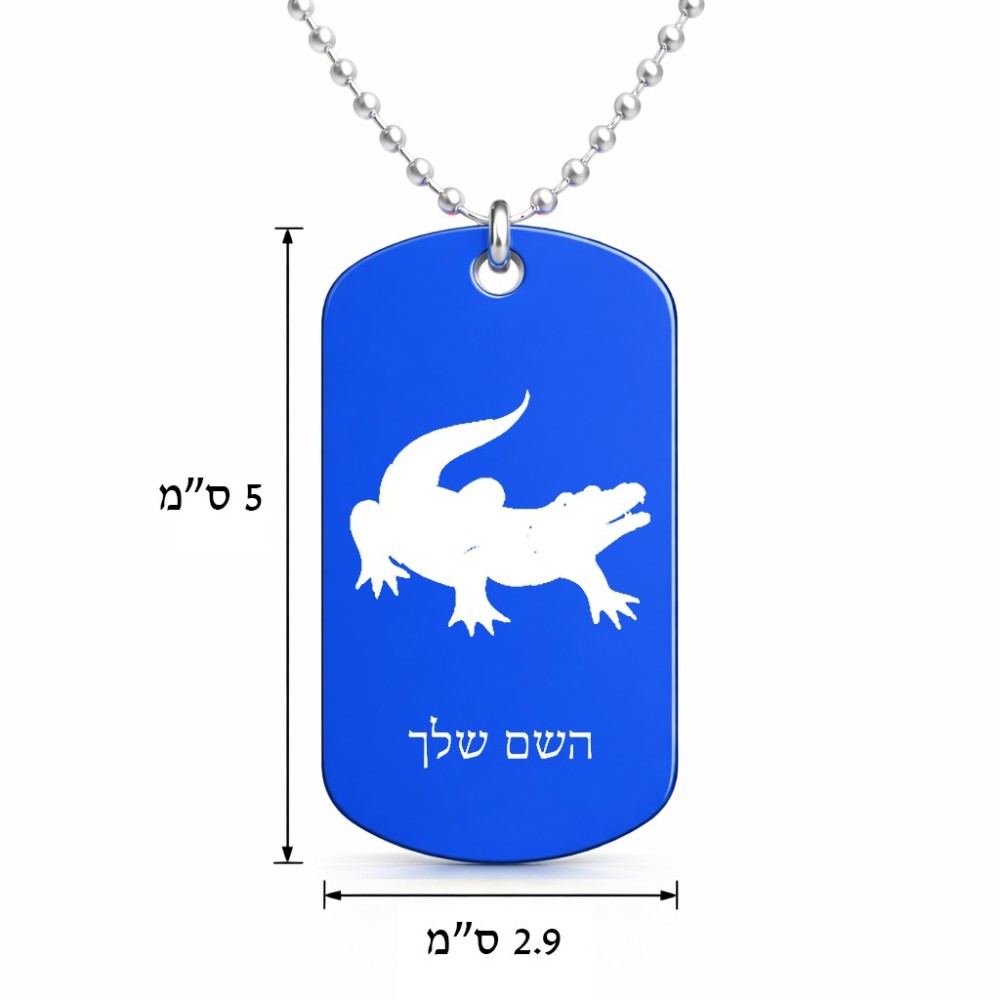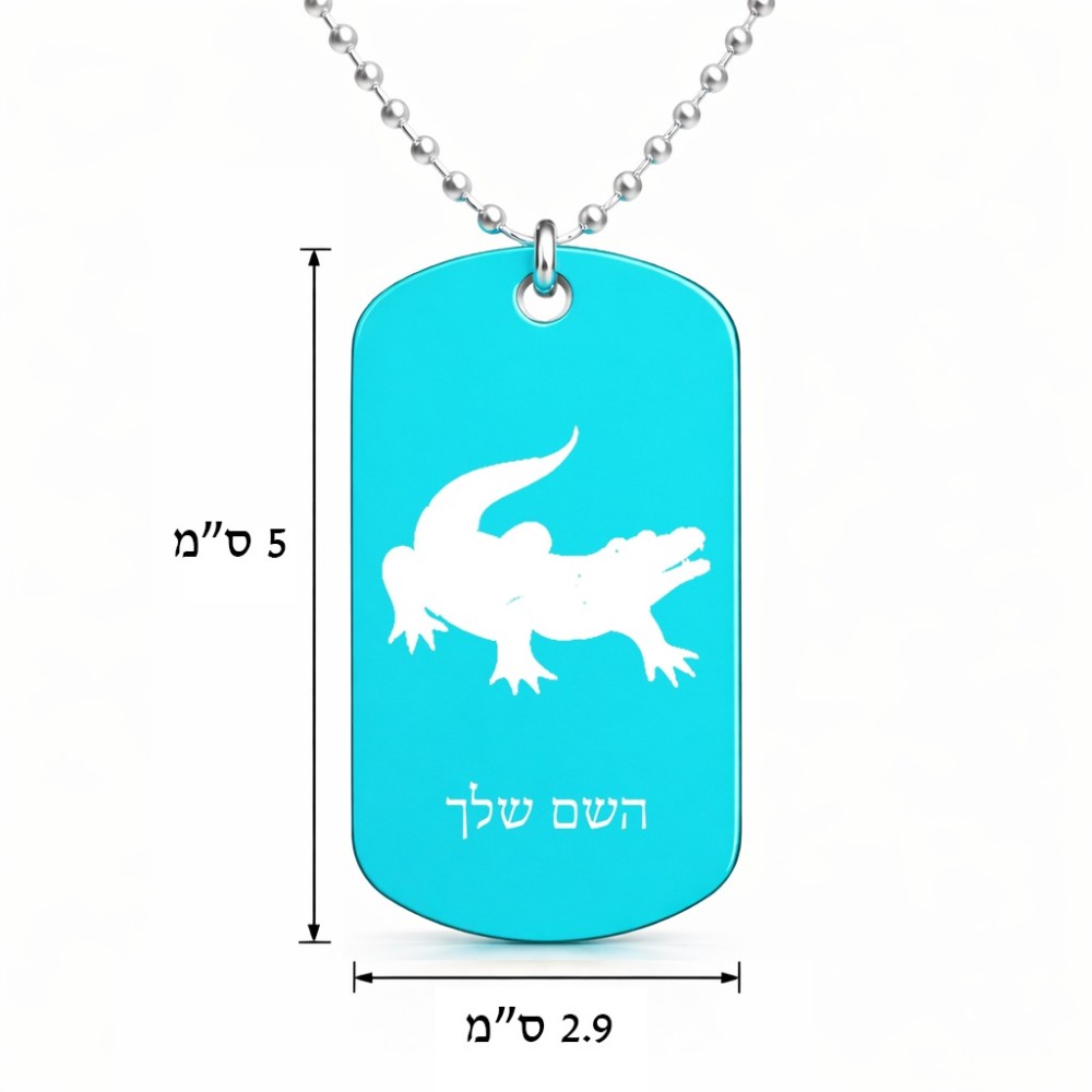 שרשרת דיסקיט מאלומיניום בעיצוב אישי עם השם שלך בעיצוב תנין גודל הדיסקיט 2.9 × 5 ס"מ. את השם המבוקש ניתן לציין בהזמנה, אם לא צויין אנחנו ניצור קשר לבירור.