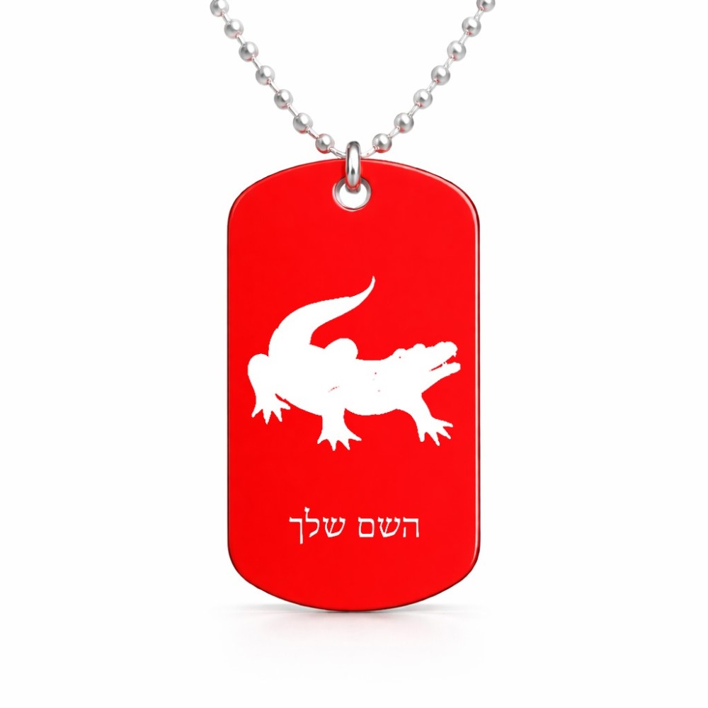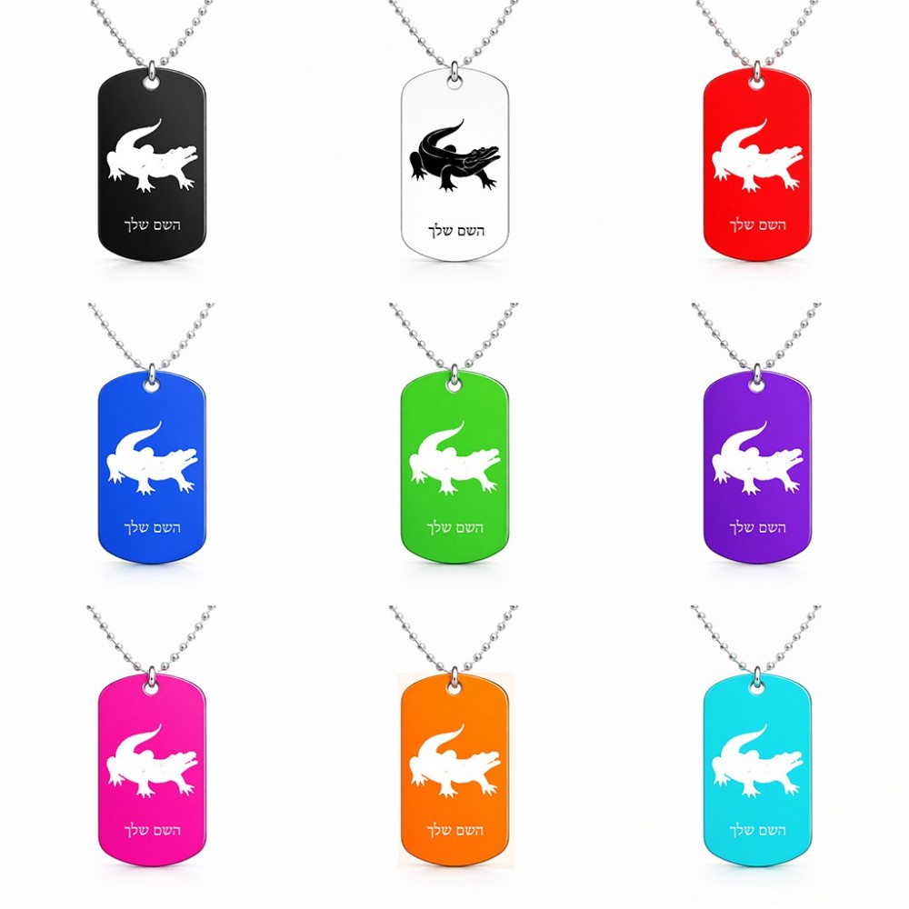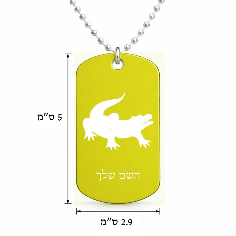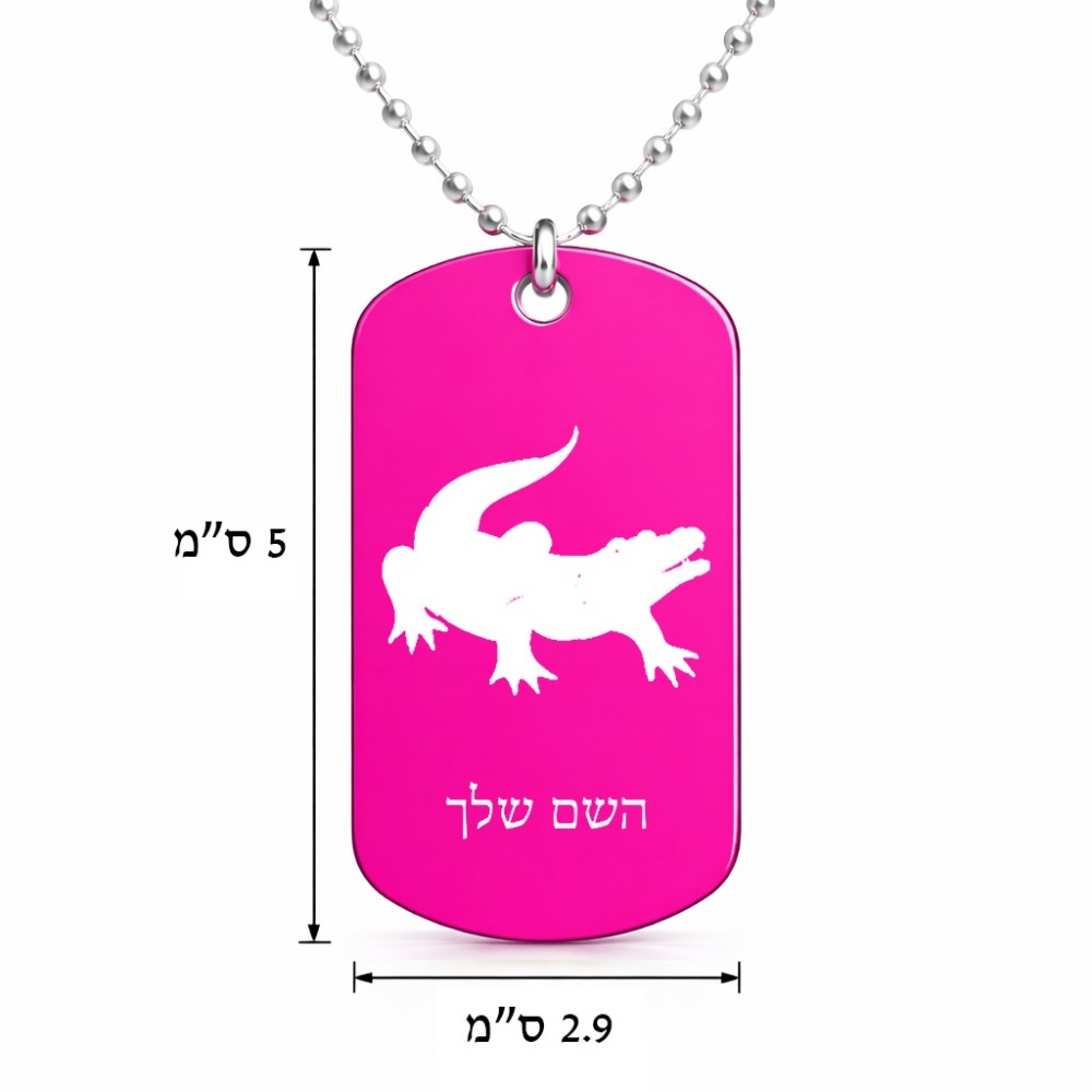 שרשרת דיסקיט מאלומיניום בעיצוב אישי עם השם שלך בעיצוב תנין גודל הדיסקיט 2.9 × 5 ס"מ. את השם המבוקש ניתן לציין בהזמנה, אם לא צויין אנחנו ניצור קשר לבירור.
