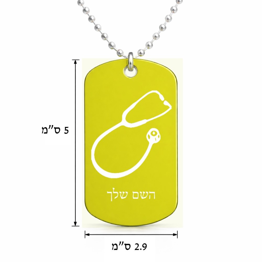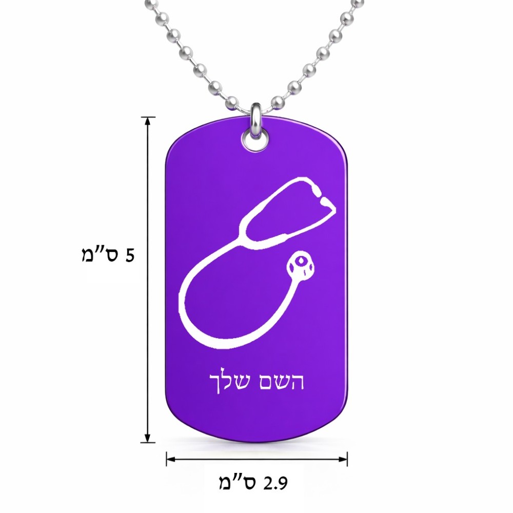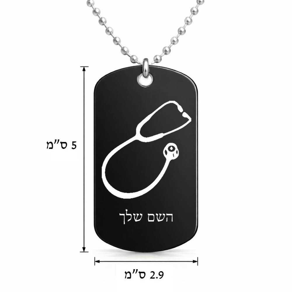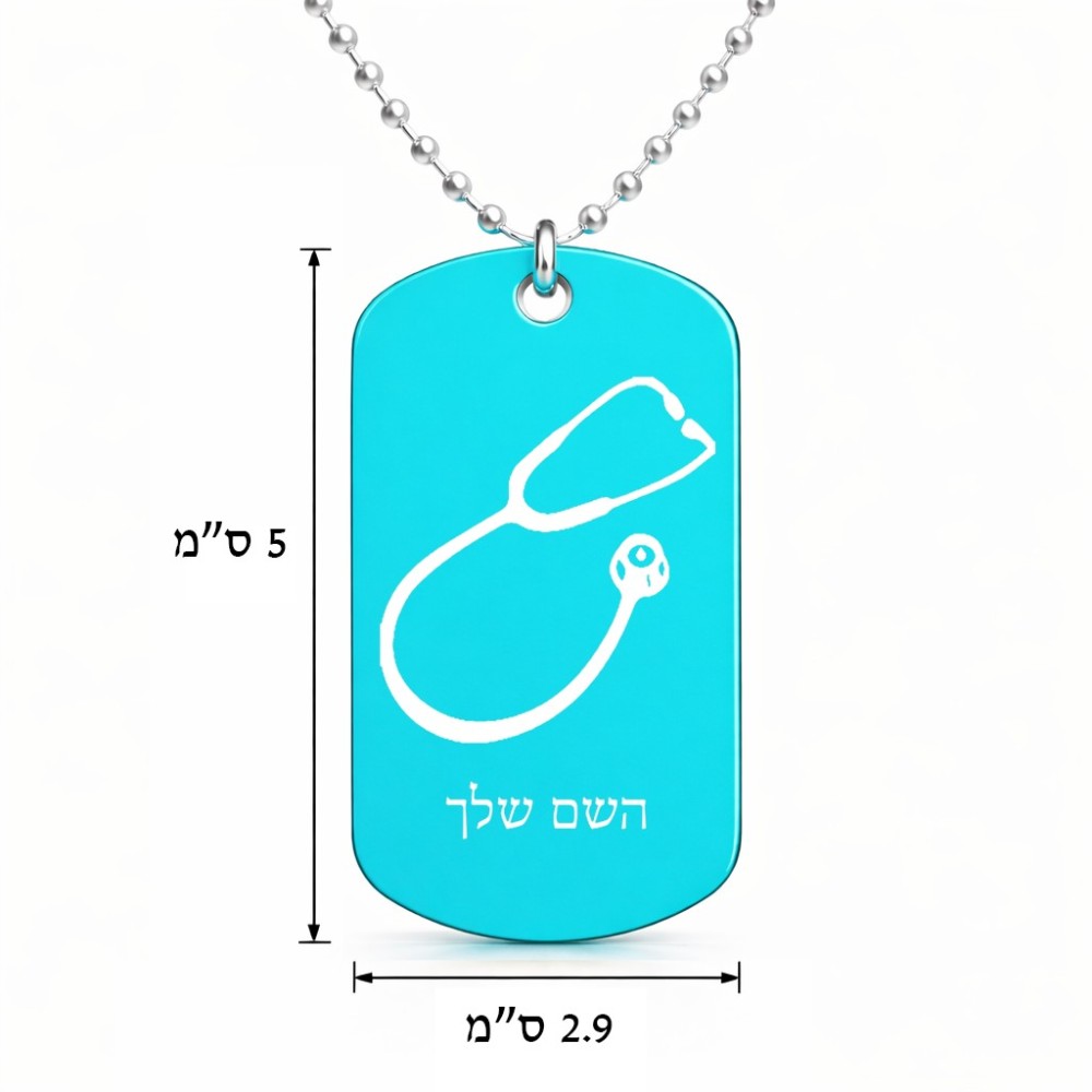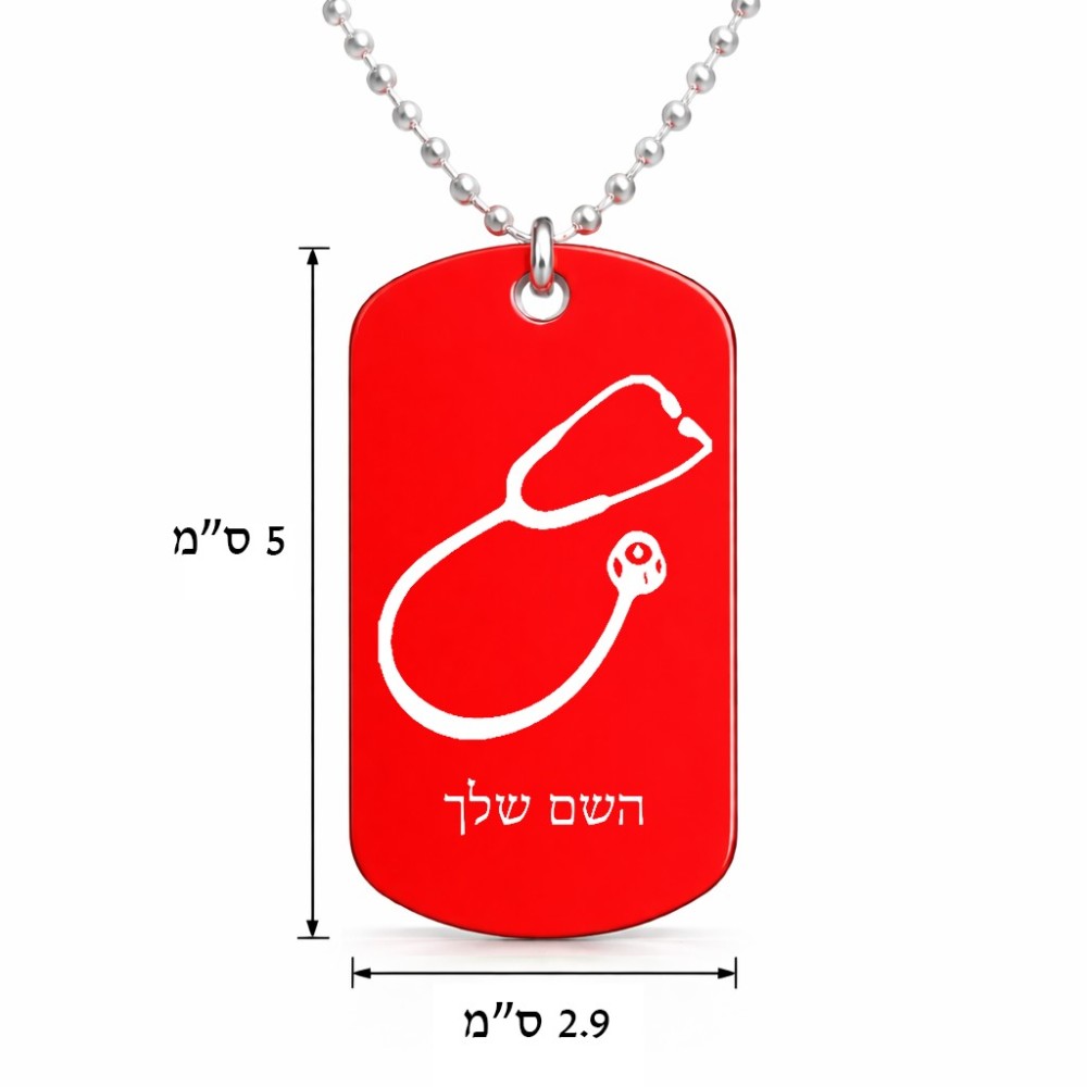 שרשרת דיסקיט מאלומיניום בעיצוב אישי עם השם שלך בעיצוב סטטוסקופ רופא גודל הדיסקיט 2.9 × 5 ס"מ. את השם המבוקש ניתן לציין בהזמנה, אם לא צויין אנחנו ניצור קשר לבירור.