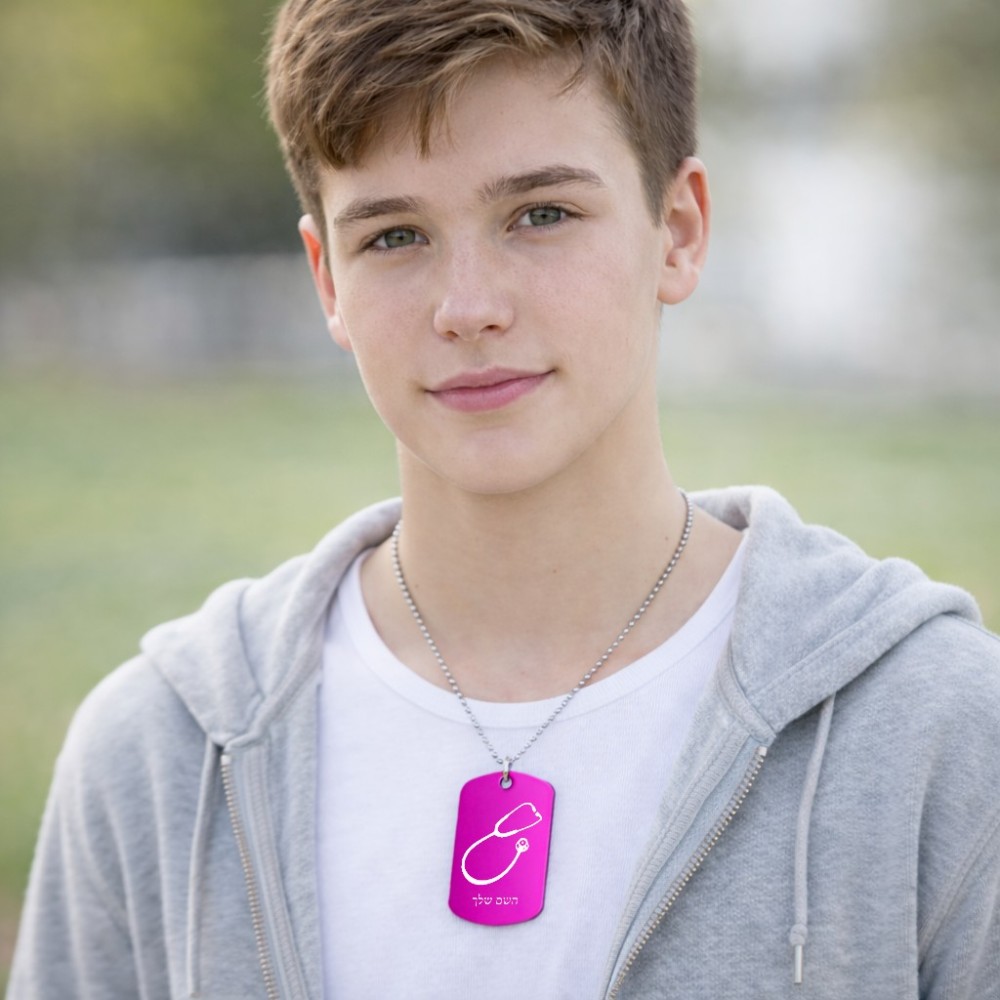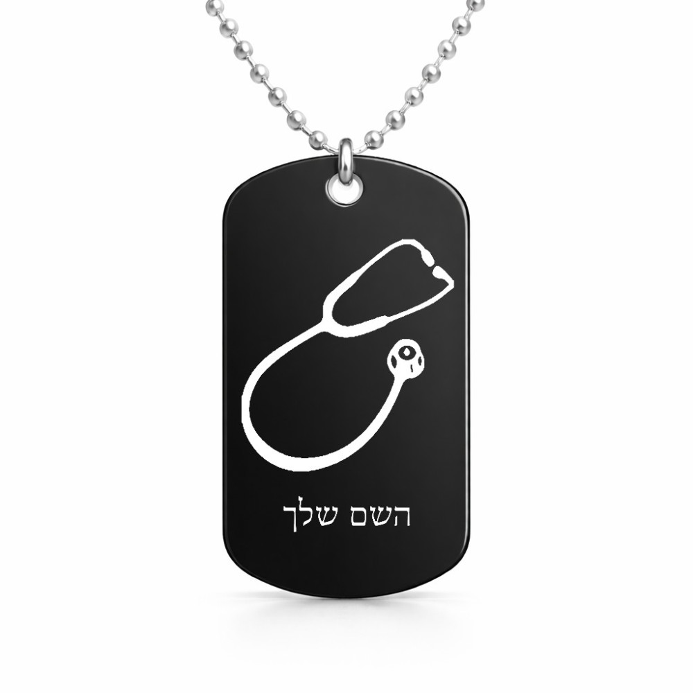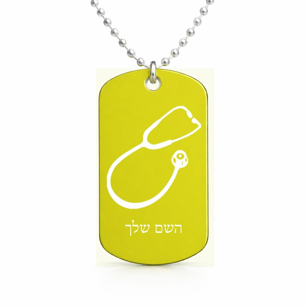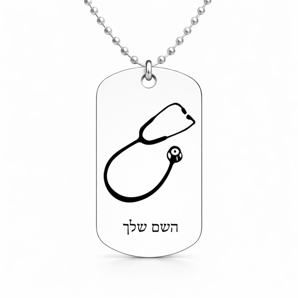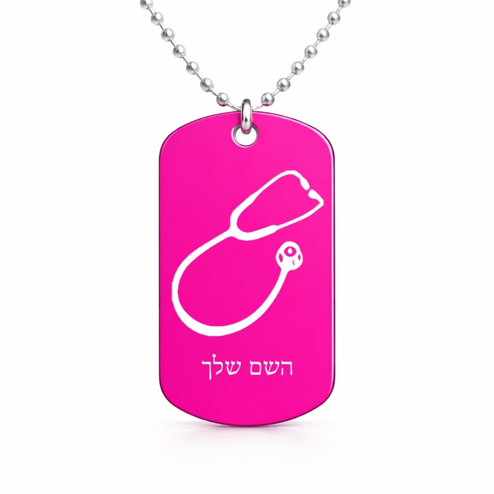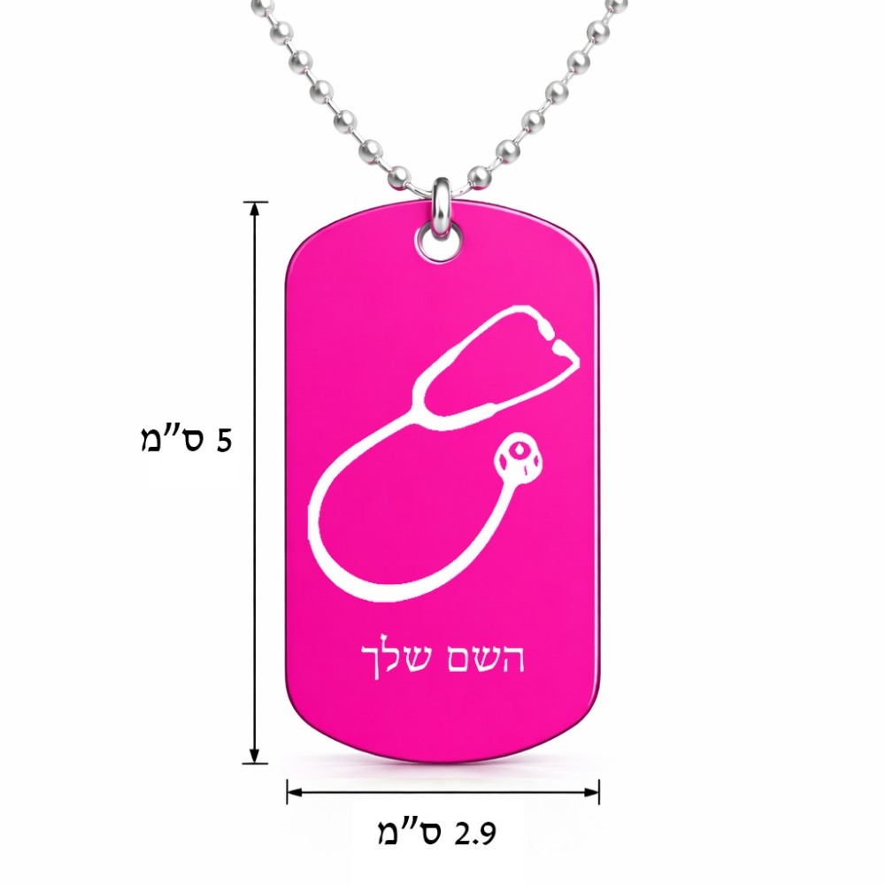 שרשרת דיסקיט מאלומיניום בעיצוב אישי עם השם שלך בעיצוב סטטוסקופ רופא גודל הדיסקיט 2.9 × 5 ס"מ. את השם המבוקש ניתן לציין בהזמנה, אם לא צויין אנחנו ניצור קשר לבירור.