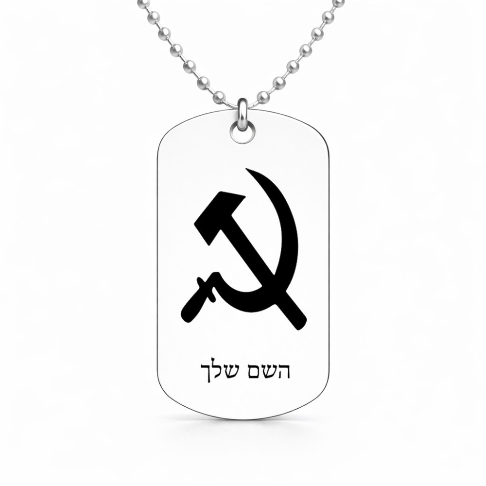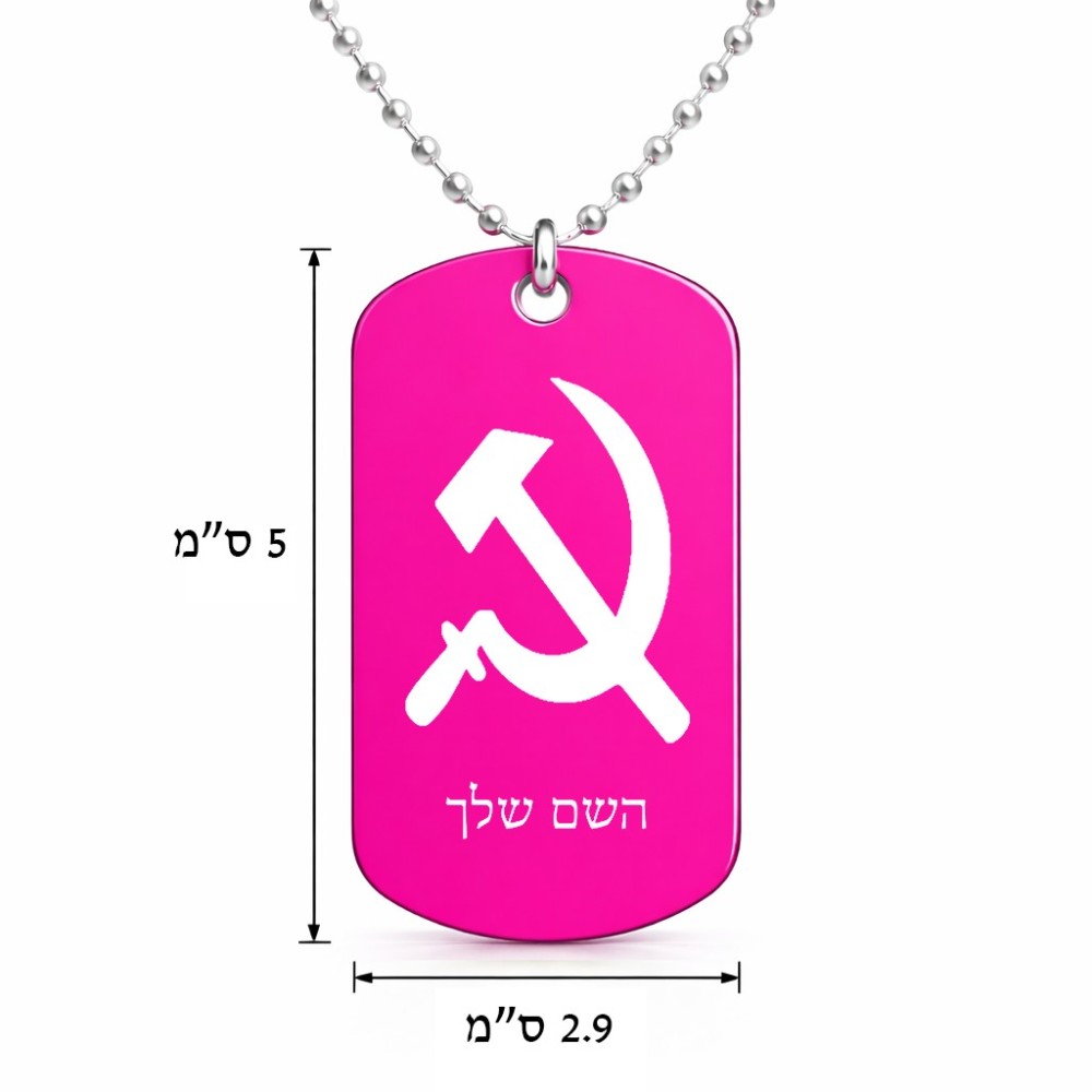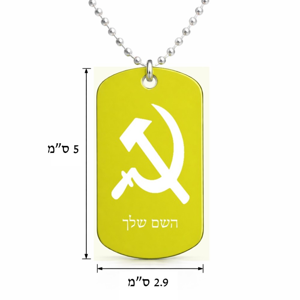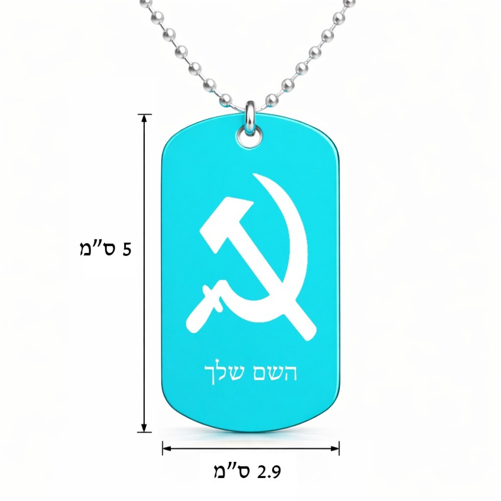 שרשרת דיסקיט מאלומיניום בעיצוב אישי עם השם שלך בעיצוב פטיש ומגל גודל הדיסקיט 2.9 × 5 ס"מ. את השם המבוקש ניתן לציין בהזמנה, אם לא צויין אנחנו ניצור קשר לבירור.