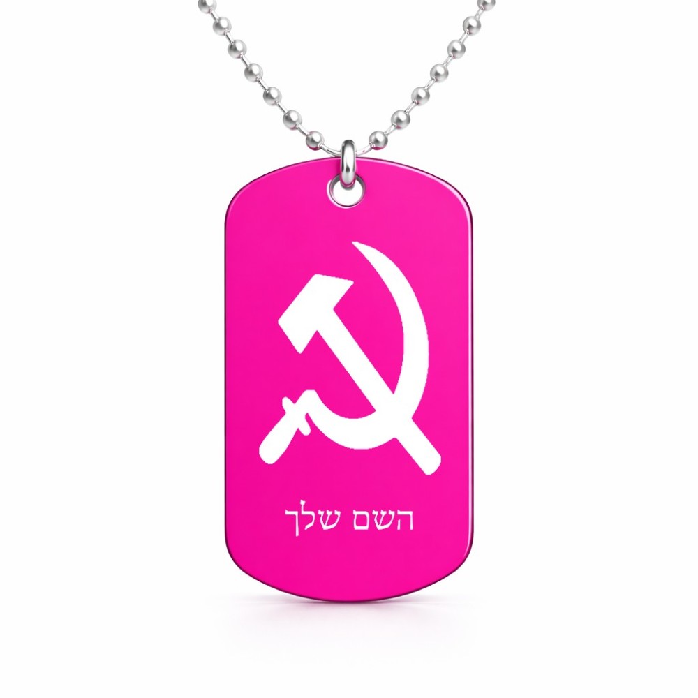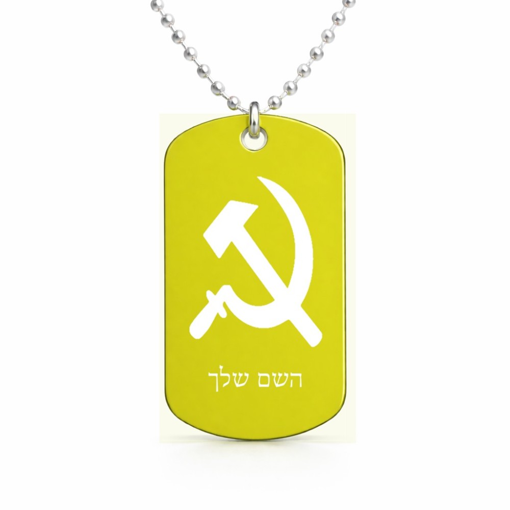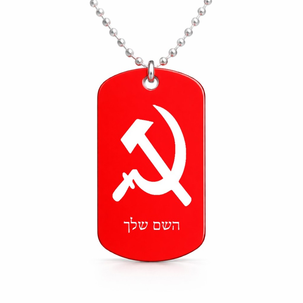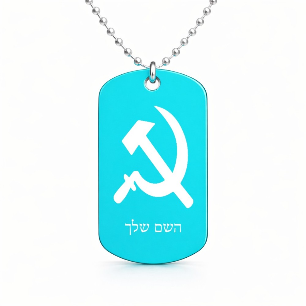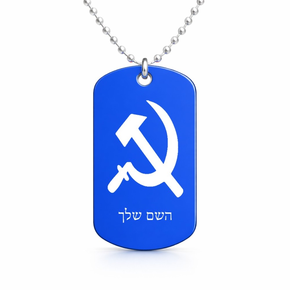 שרשרת דיסקיט מאלומיניום בעיצוב אישי עם השם שלך בעיצוב פטיש ומגל גודל הדיסקיט 2.9 × 5 ס"מ. את השם המבוקש ניתן לציין בהזמנה, אם לא צויין אנחנו ניצור קשר לבירור.